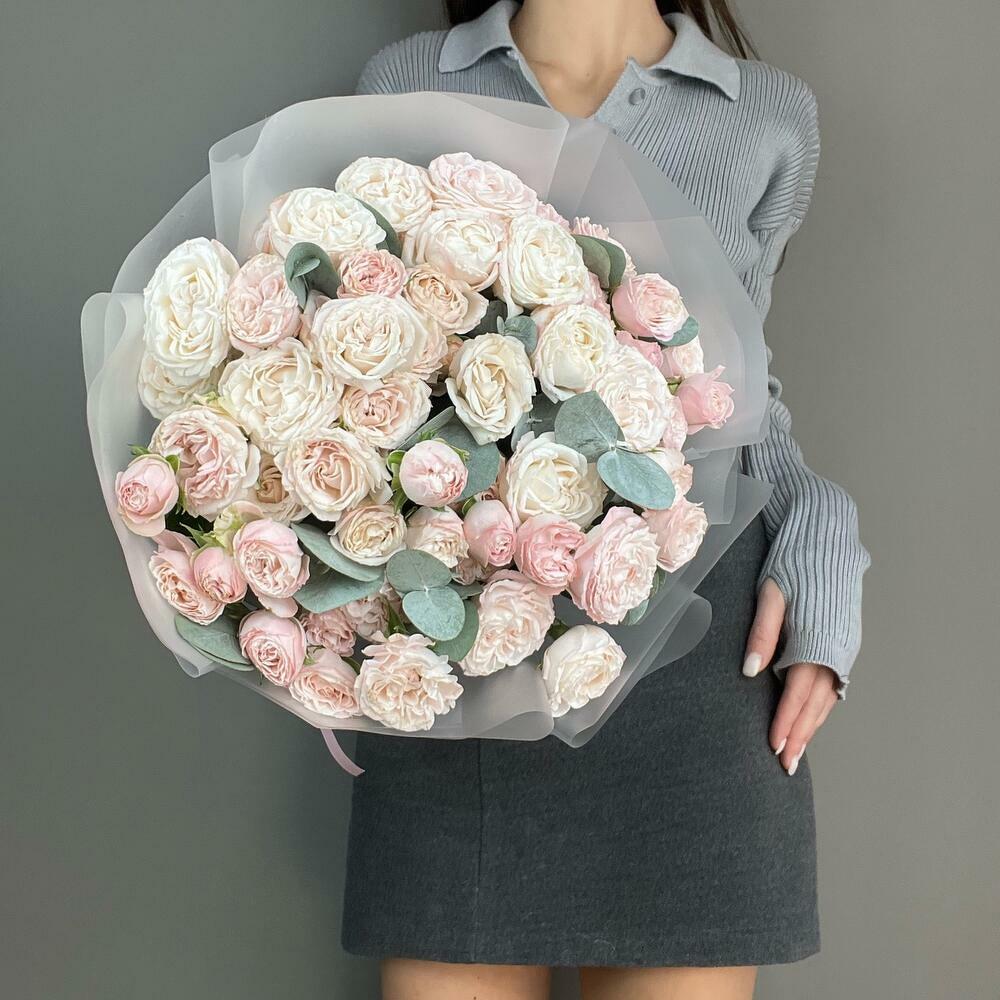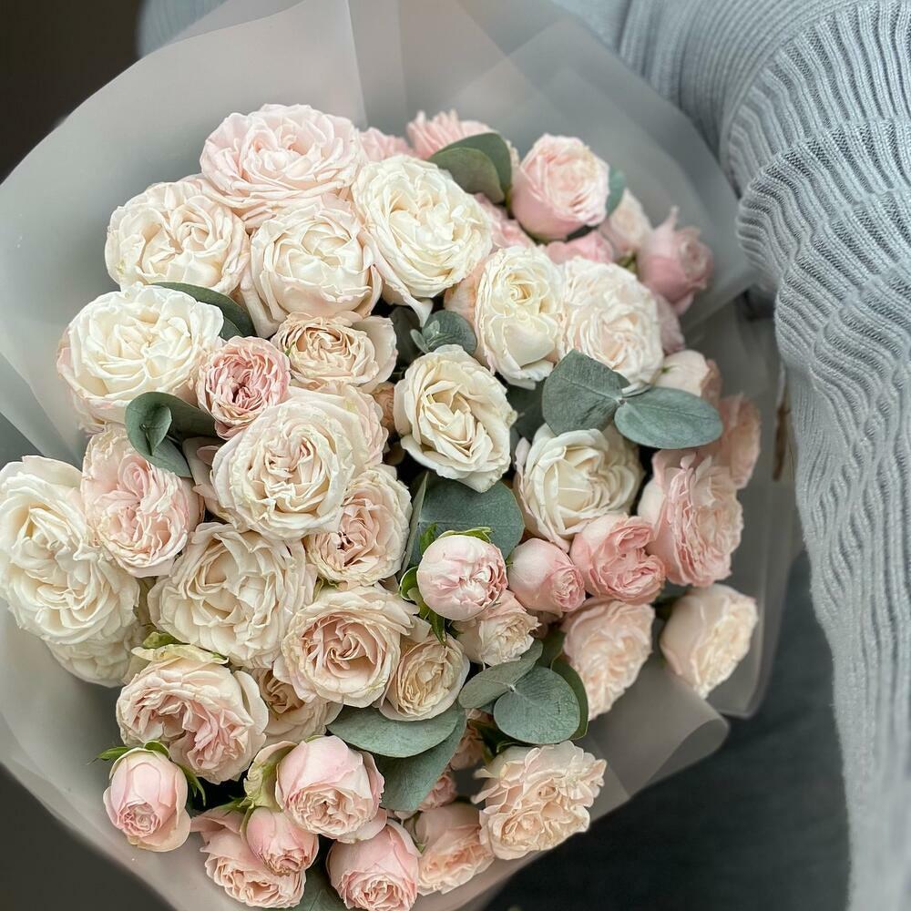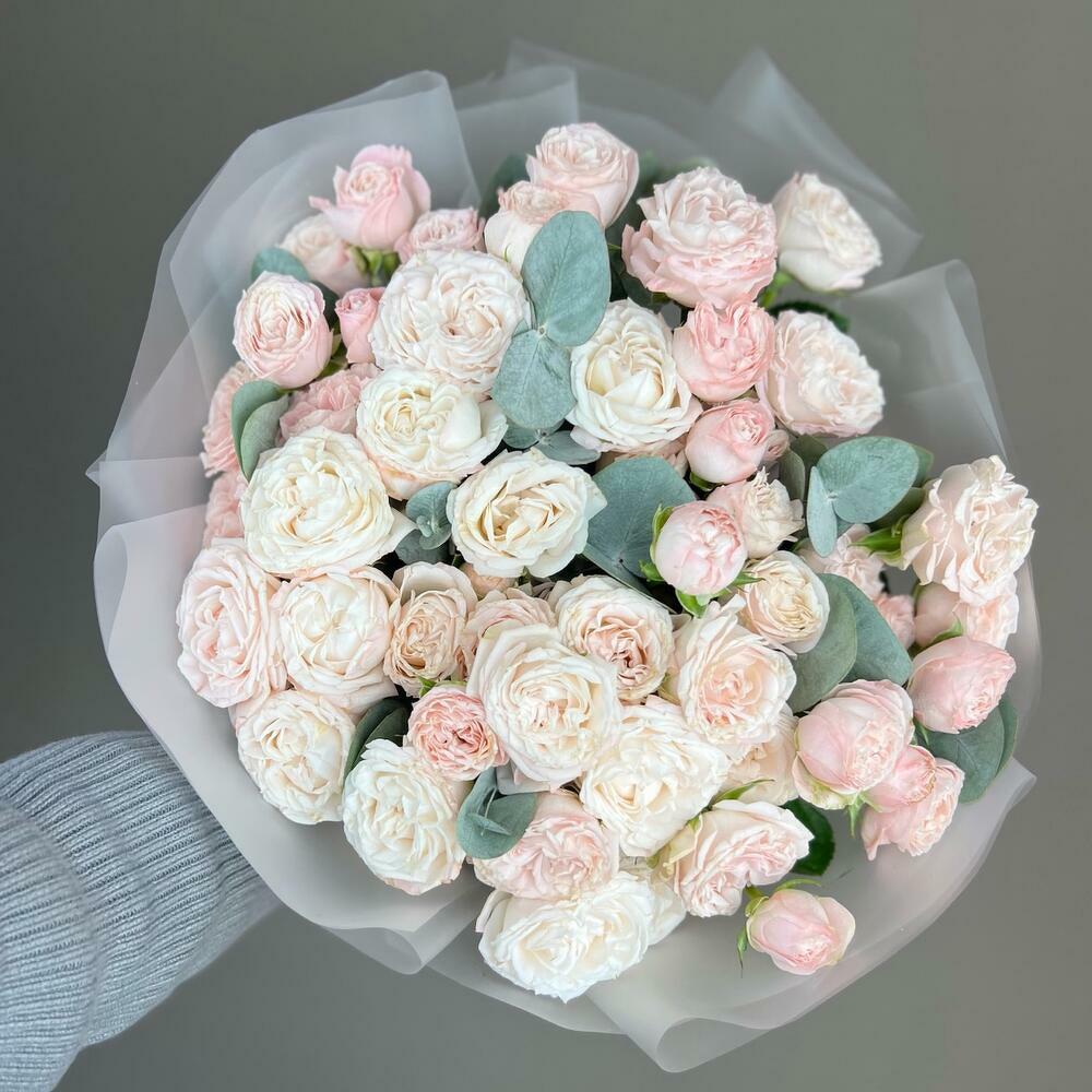 Эвкалипт - 4 шт. Лента атласная - 1 шт. Роза кустовая пионовидная - 15 шт. Пленка матовая - 5 шт.