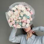Стильный монобукет из 15 кустовых пионовидных роз Бомбастик. Пышные махровые бутоны создают впечатляющий объем и дарят ощущение праздничного великолепия. Ажурный эвкалипт подчеркивает нежность композиции, добавляя ей воздушности и завершенности. Каждая изготавливаемая флористом цветочная композиция является уникальной и внешним видом, размером и оттенками цвета. Наши композиции составляются из свежих цветов, а флористы предпринимают все усилия для того, чтобы цвет и форма цветочной работы как можно полнее соответствовали иллюстрации на фото. Инструкция по уходу за букетом: Живые цветы требуют ежедневного ухода и смены воды. Стебли цветов подрезаются ножом или секатором. Вазу с цветами держат подальше от прямых солнечных лучей и отопительных приборов. Подкормка для растений продлит жизнь романтичному подарку. Идеальный подарок для мамы, жены, девушки, коллеги, бабушки, учителя. Подойдет на праздники: 8 марта, 1 сентября, день учителя, 14 февраля, день матери, юбилей, свадьба, день рождения, именины.