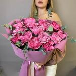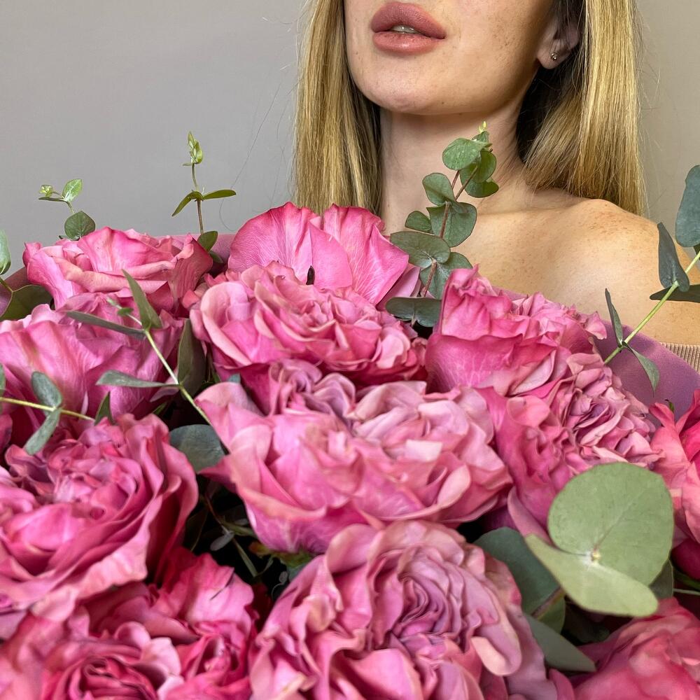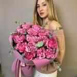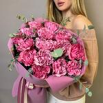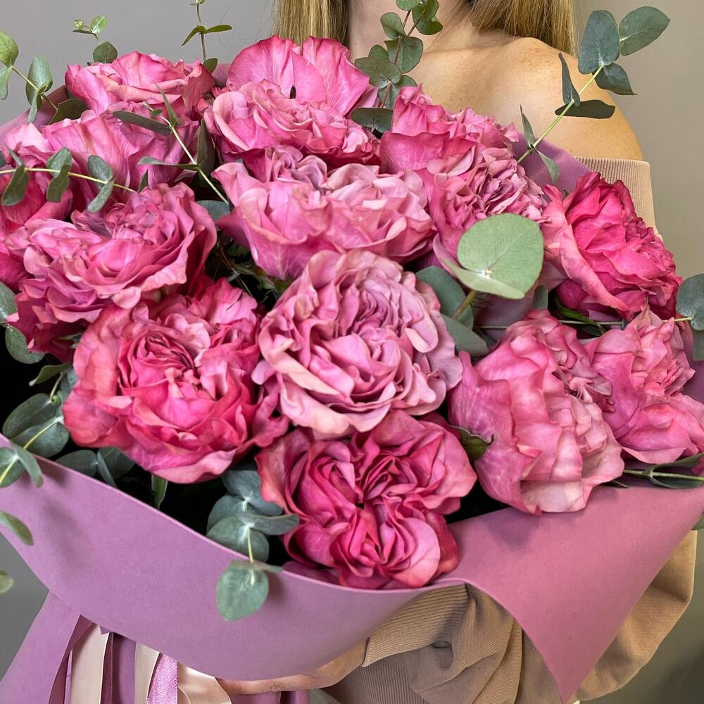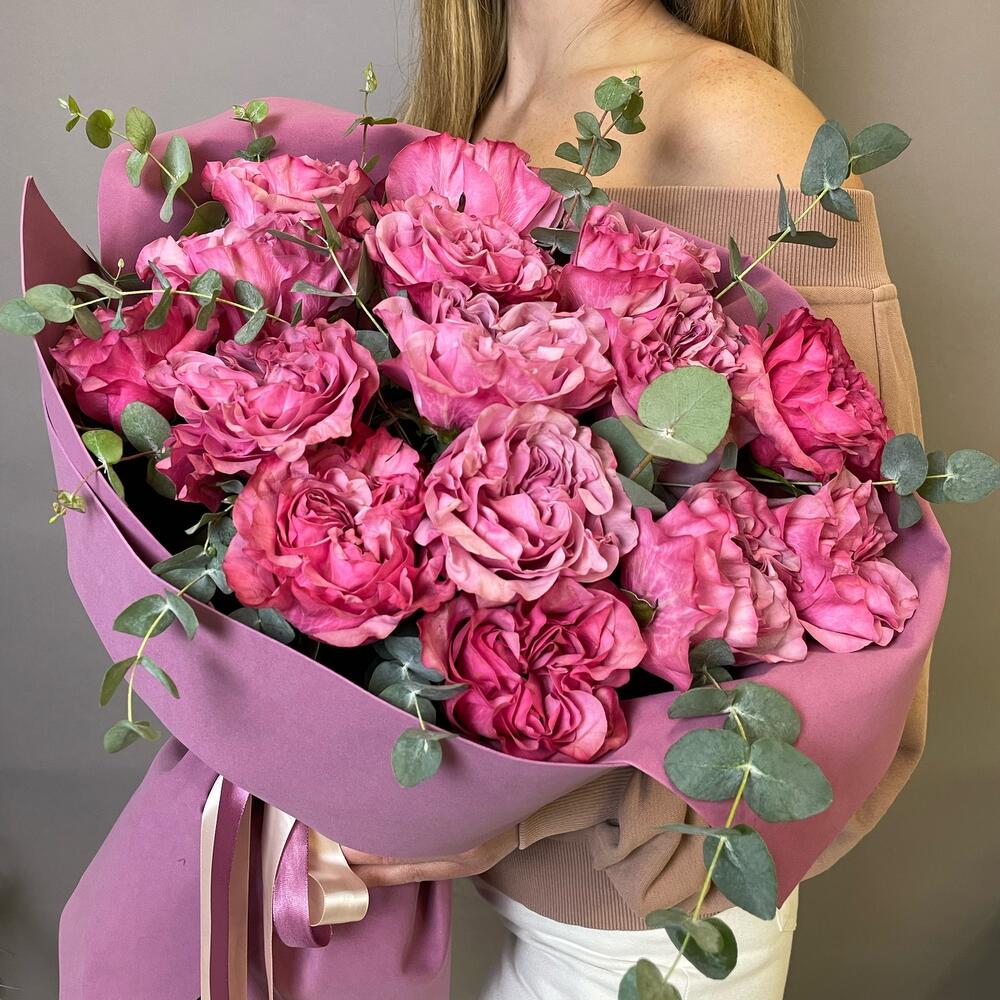 Лента атласная - 5 шт. Пионовидная роза - 15 шт. Упаковка дизайнерская - 3 шт. Эвкалипт пучок - 1 шт.