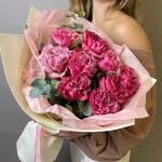 Эвкалипт - 3 шт. Лента атласная - 1 шт. Пионовидная роза - 9 шт. Упаковка дизайнерская - 4 шт.