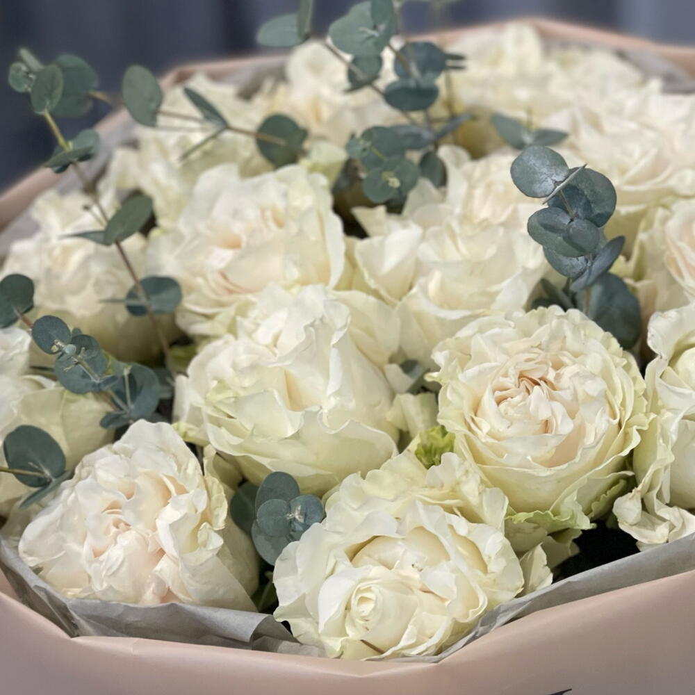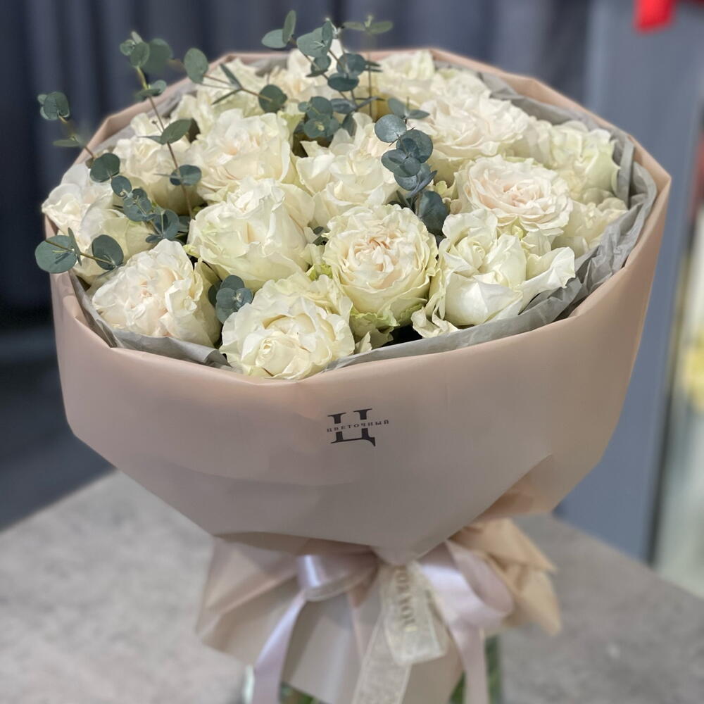 Эвкалипт - 3 шт. Роза пионовидная - 15 шт. Упаковка дизайнерская - 1 шт.