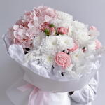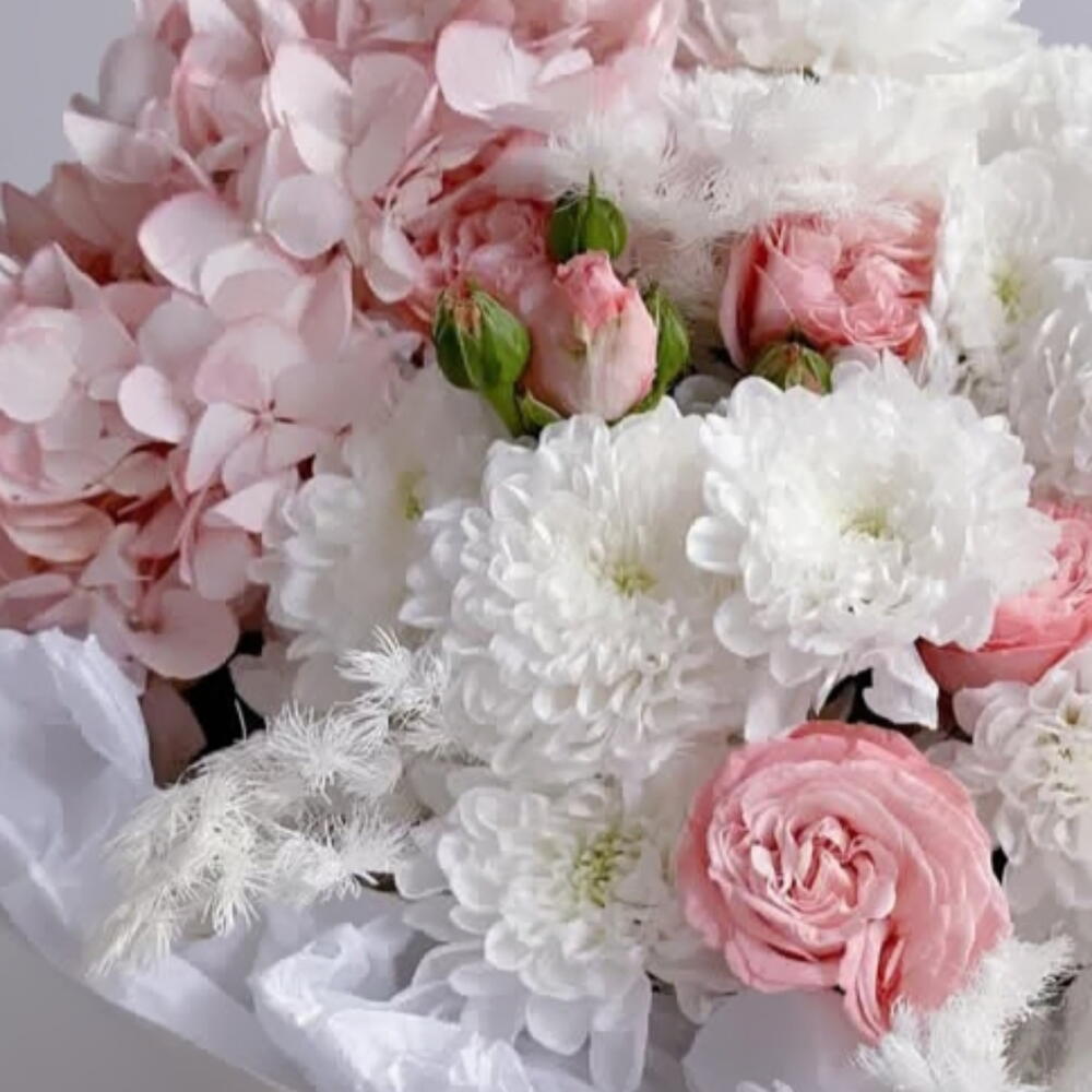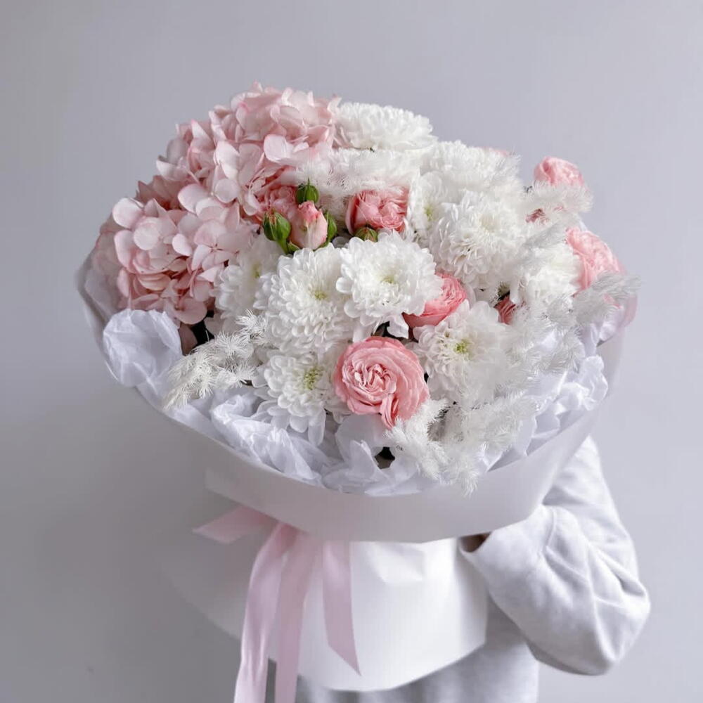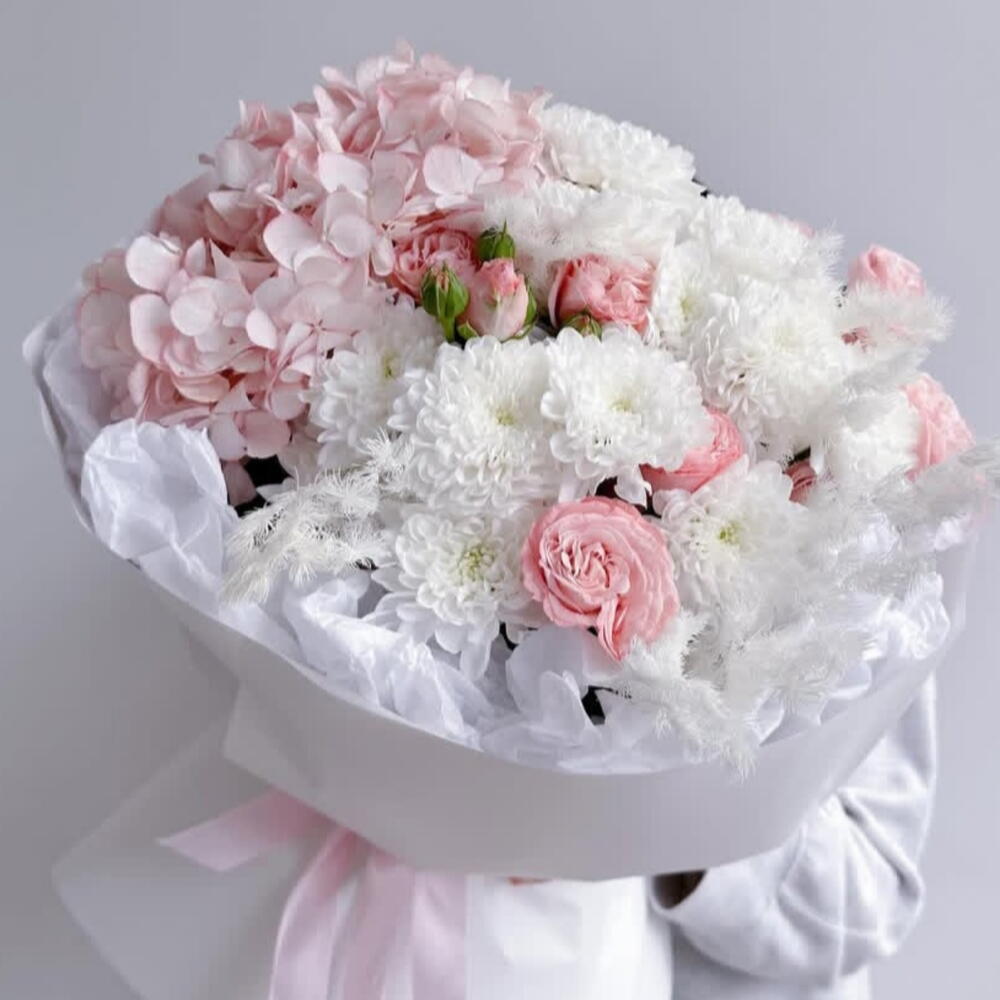 Нежный симфонический аккорд природы — букет из гортензии, пионовидных роз и белой хризантемы. Пышные соцветия гортензии создают воздушное облако, кустовые пионовидные розы добавляют благородную глубину, а белоснежные хризантемы привносят изысканную чистоту линии. Идеальный букет на 14 февраля Гортензия — как облако нежности, пионовидные розы — как символ глубокой привязанности, белая хризантема — как знак чистоты намерений. Этот букет — словно признание без слов: мягкий, трогательный и бесконечно элегантный. Идеален для: признания в чувствах; поздравления с особым событием; знака внимания тому, кто дорог. Вот несколько вариантов продающих описаний для вашего букета — выбирайте тот, что ближе по настроению, или комбинируйте идеи: Нежный симфонический аккорд природы — букет из гортензии, пионовидных роз и белой хризантемы. Пышные соцветия гортензии создают воздушное облако, кустовые пионовидные розы добавляют благородную глубину, а белоснежные хризантемы привносят изысканную чистоту линии. Этот букет — словно признание без слов: мягкий, трогательный и бесконечно элегантный. Идеален для: признания в чувствах; поздравления с особым событием; знака внимания тому, кто дорог. Элегантность в каждой детали. Букет из гортензии, кустовых пионовидных роз и белой хризантемы — это: гармоничное сочетание текстур и форм; нежная пастельная гамма, которая подойдёт к любому поводу; долговечность и свежесть благодаря тщательно отобранным цветам. Подарите красоту, которая говорит сама за себя. Представьте улыбку того, кто получит этот букет: искреннюю, тёплую, счастливую. Гортензия — как облако нежности, пионовидные розы — как символ глубокой привязанности, белая хризантема — как знак чистоты намерений. Вместе они создают композицию, которая: вызывает восторг с первого взгляда; долго радует свежестью; становится незабываемым подарком. Выберите букет, который скажет больше, чем слова. Эксклюзивный букет из гортензии, кустовых пионовидных роз и белой хризантемы — идеальное решение для тех, кто ценит: Эстетику: сочетание пышных соцветий и изящных бутонов создаёт эффектный визуальный образ. Универсальность: подходит для юбилея, свидания, благодарности или просто как знак внимания. Качество: цветы отбираются вручную, чтобы гарантировать свежесть и долговечность. Дарите эмоции, воплощённые в цветах