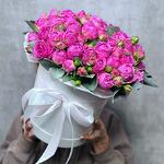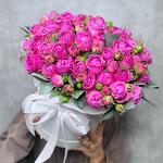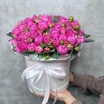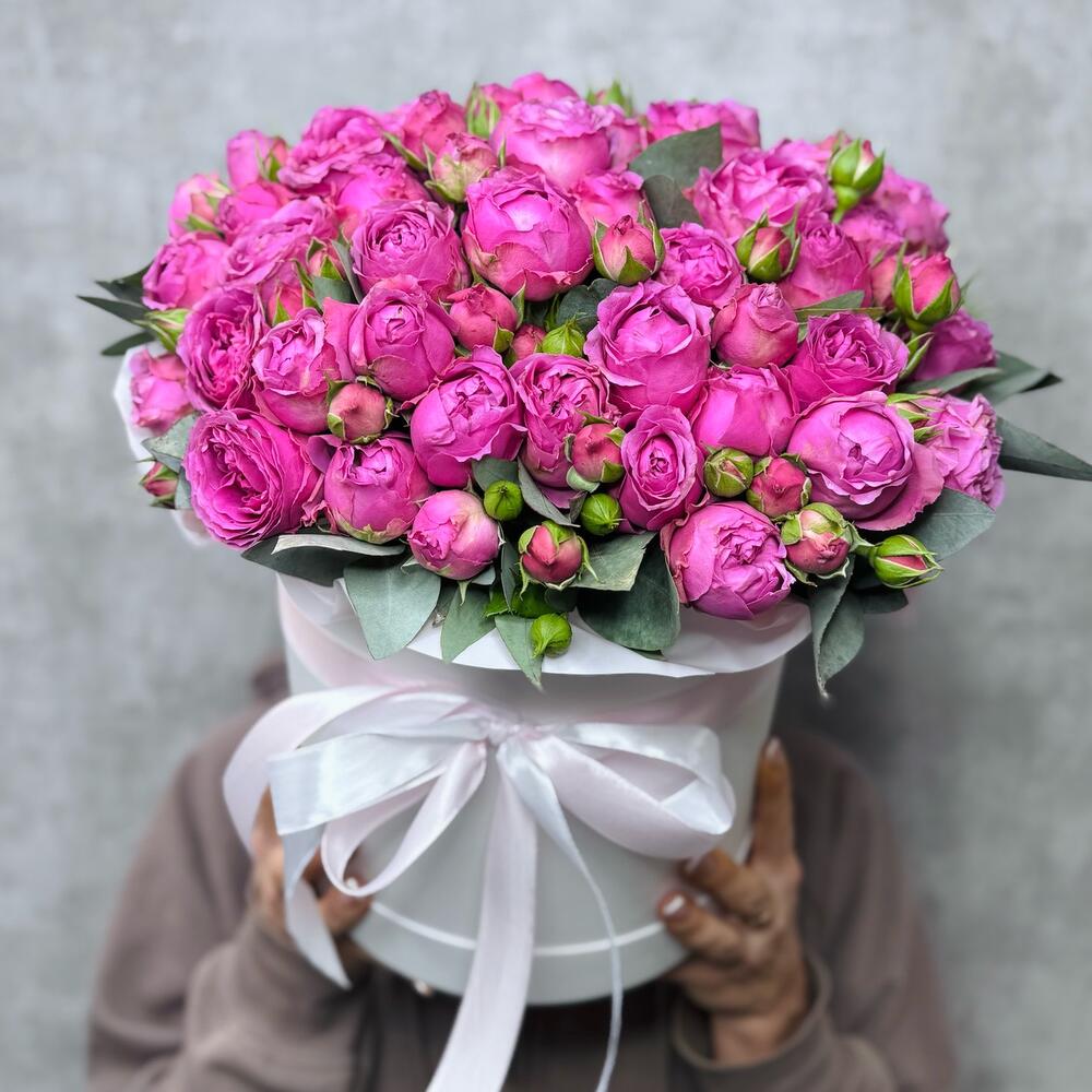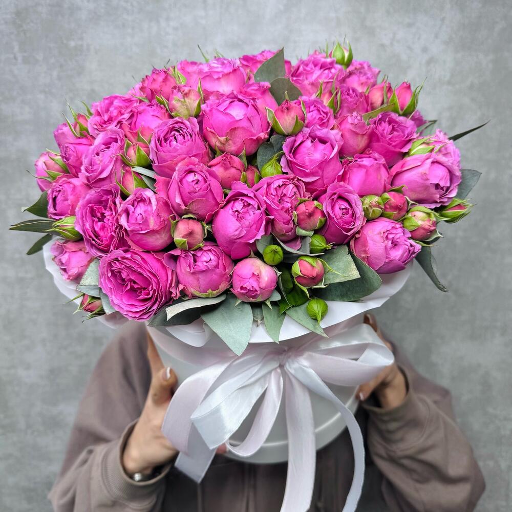 Эвкалипт - 10 шт. Коробка шляпная - 1 шт. Пионовидная кустовая роза - 15 шт. Пакет крафт - 1 шт. Оазис флористический - 1 шт. Целлофан прозрачный - 1 шт.
