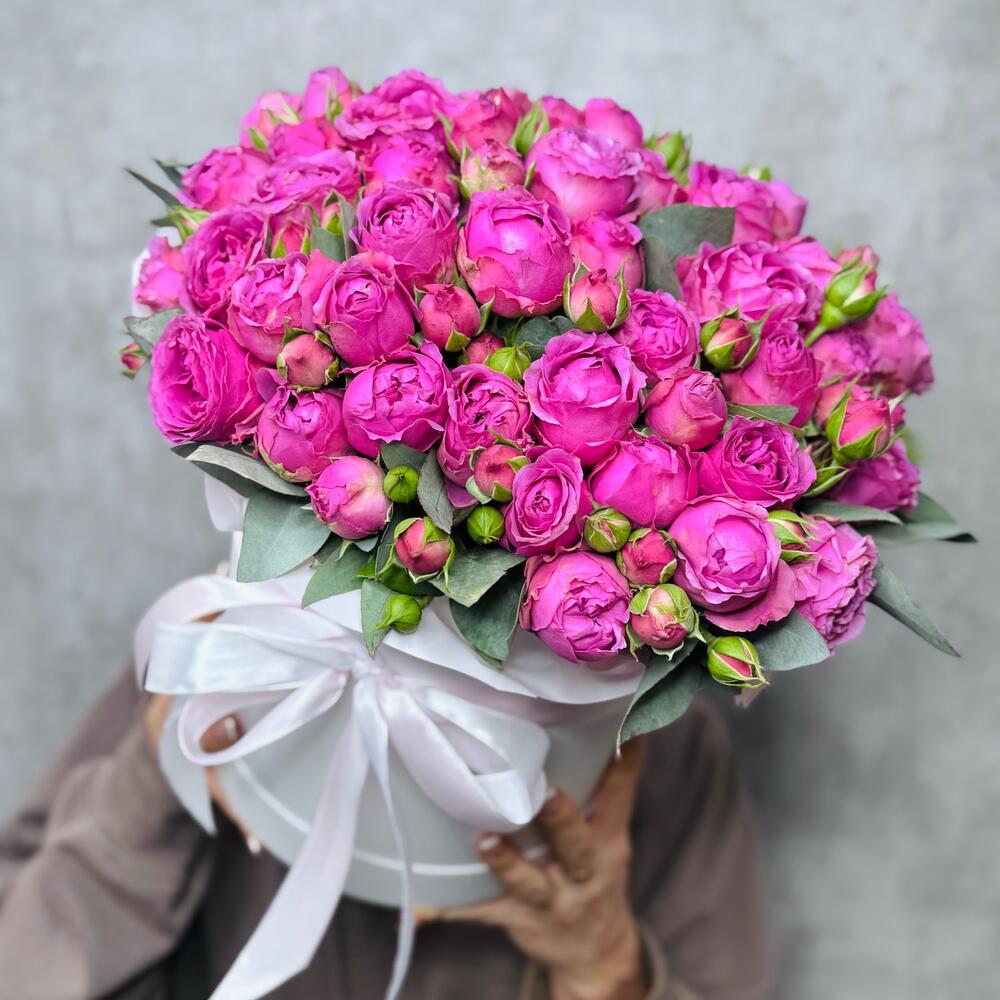Пионовидные🩷розы🌹Мисти с эвкалиптом в большой шляпной коробке размер L. Розы малиновые в коробке для любимой 🩷на День рождение
