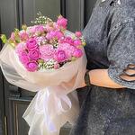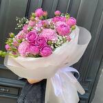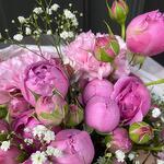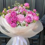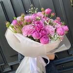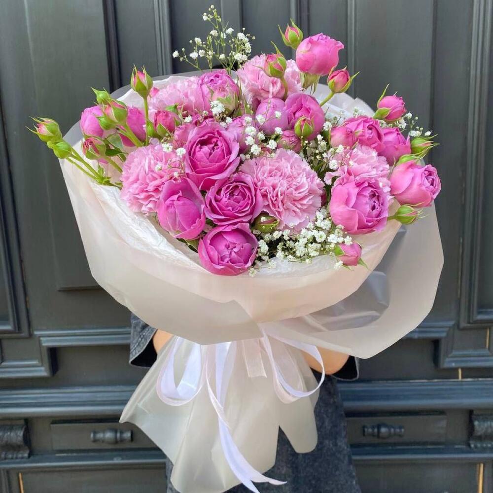 Лента атласная - 1 шт. Тишью - 1 шт. Открыточка с вашими пожеланиями - 1 шт. Диантус розовый - 5 шт. Пленка дизайнерская - 1 шт. Гипсофила Белая - 2 шт. Misty Bubbles пионовидная роза - 5 шт.