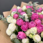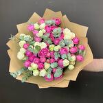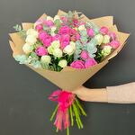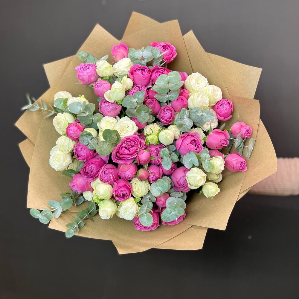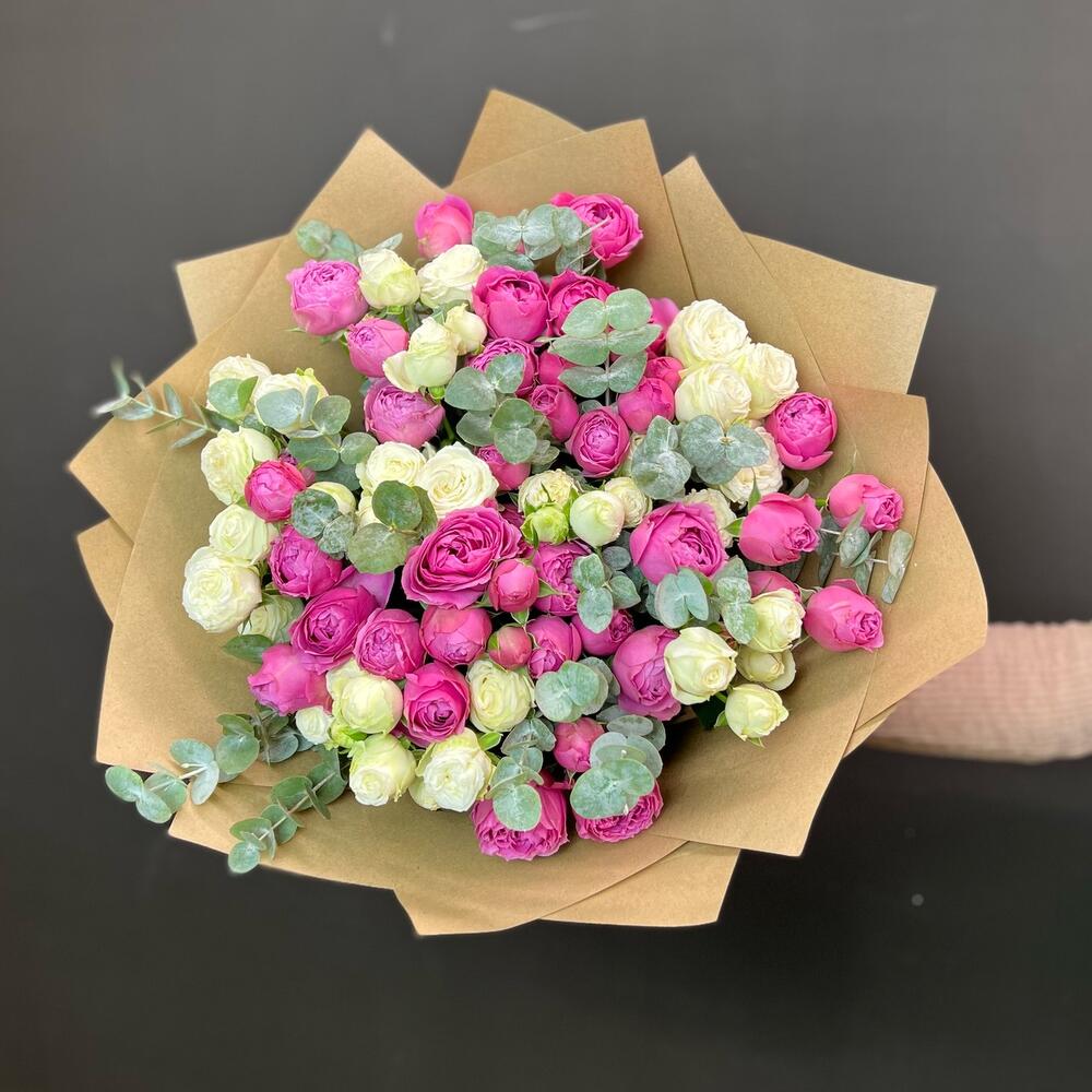Эвкалипт - 9 шт. Крафт упаковка - 1 шт. пионовидные кустовые розы - 17 шт.