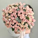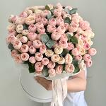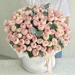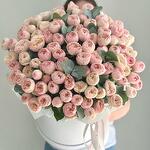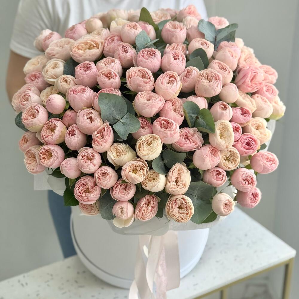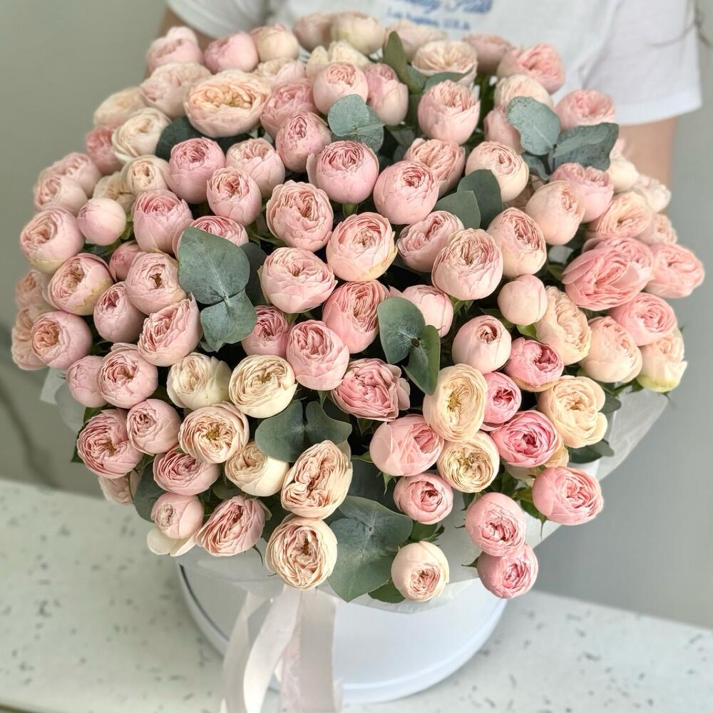 Эвкалипт - 6 шт. Коробка шляпная - 1 шт. Губка флористическая - 1 шт. кустовая пионовидная роза мэнсфилд парк - 35 шт.