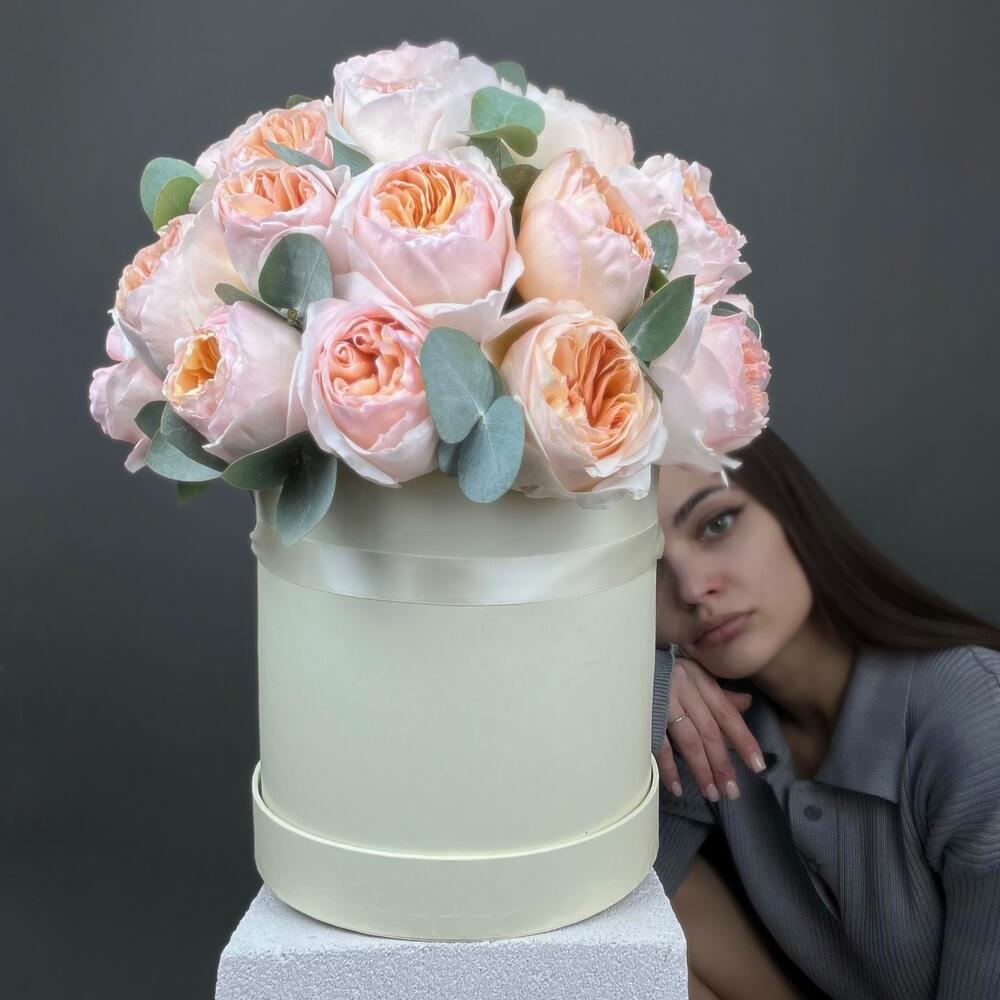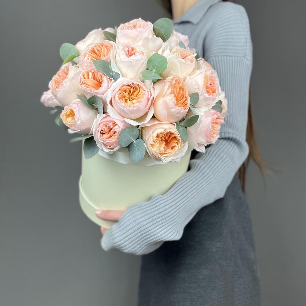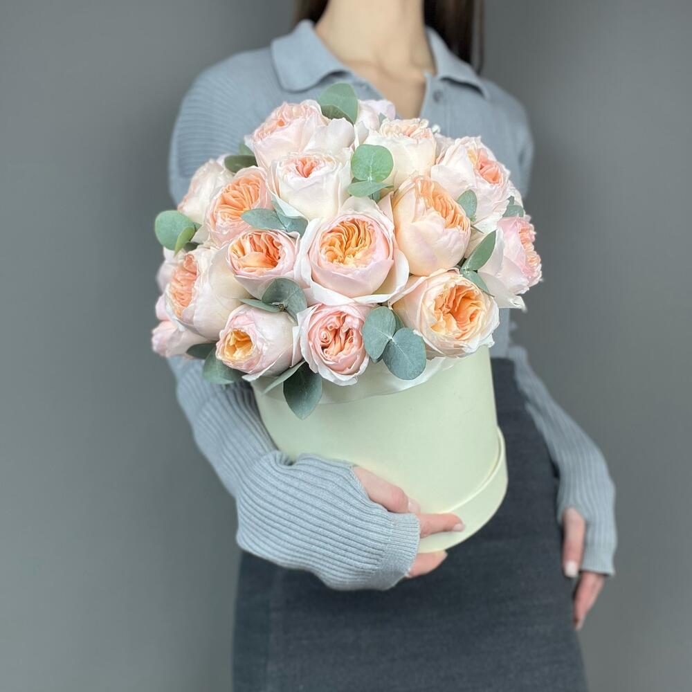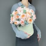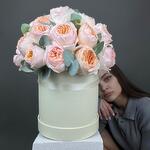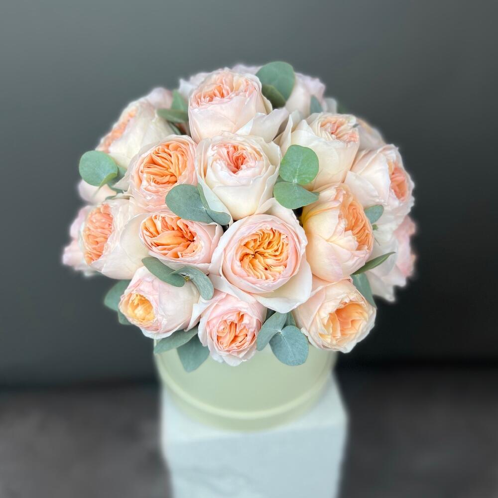Эвкалипт - 3 шт. Коробка шляпная - 1 шт. Роза пионовидная Джульетта - 29 шт. Оазис флористический - 1 шт.