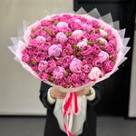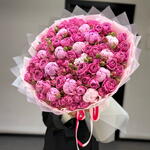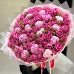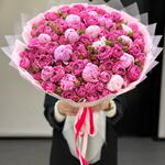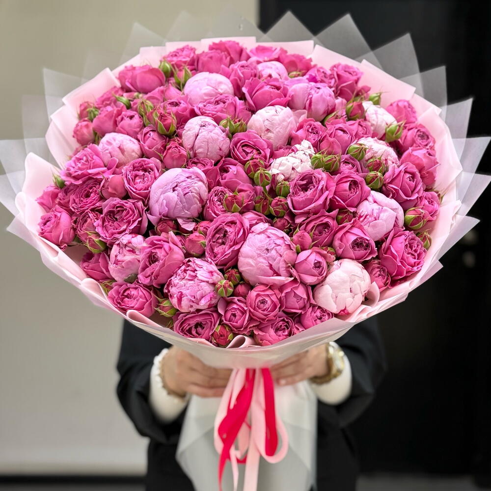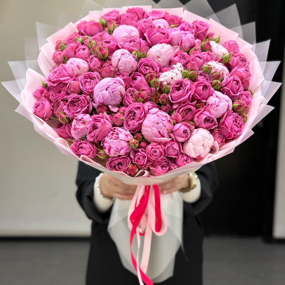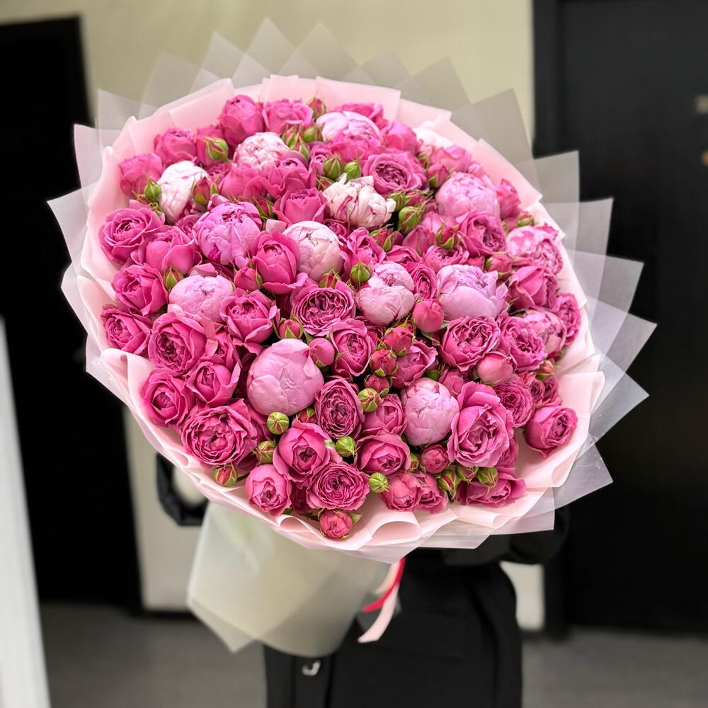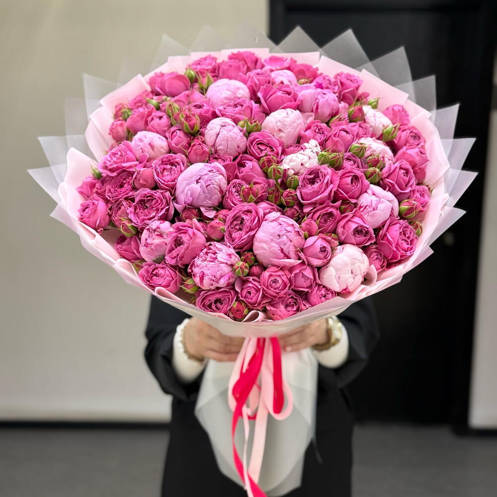 Лента атласная - 1 шт. Кустовая роза пионовидная - 20 шт. Дизайнерское оформление - 1 шт. пионы сара бернар - 15 шт. букетная записка - 1 шт.