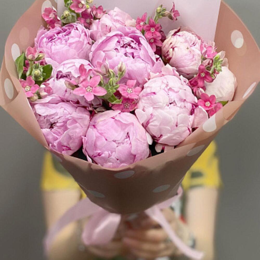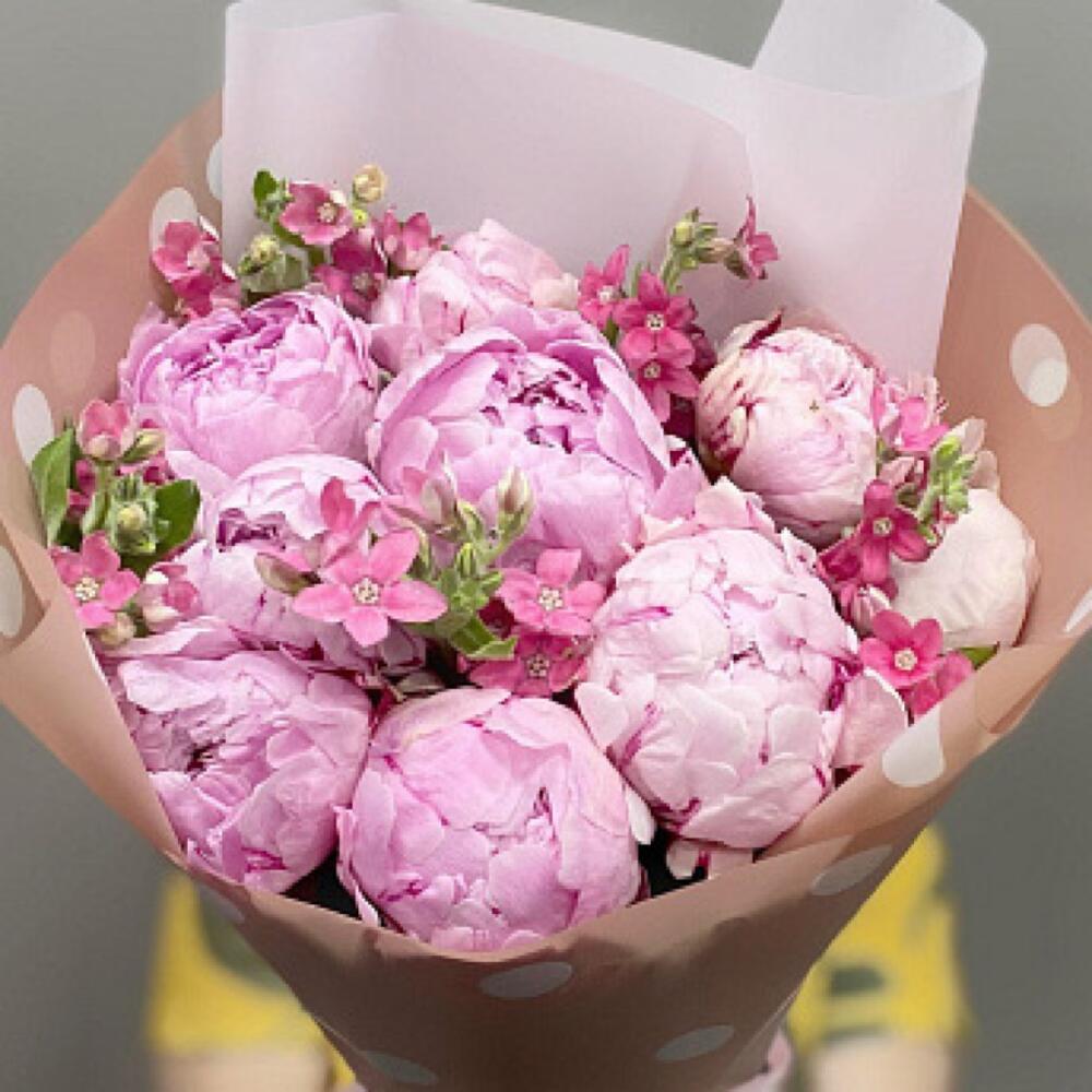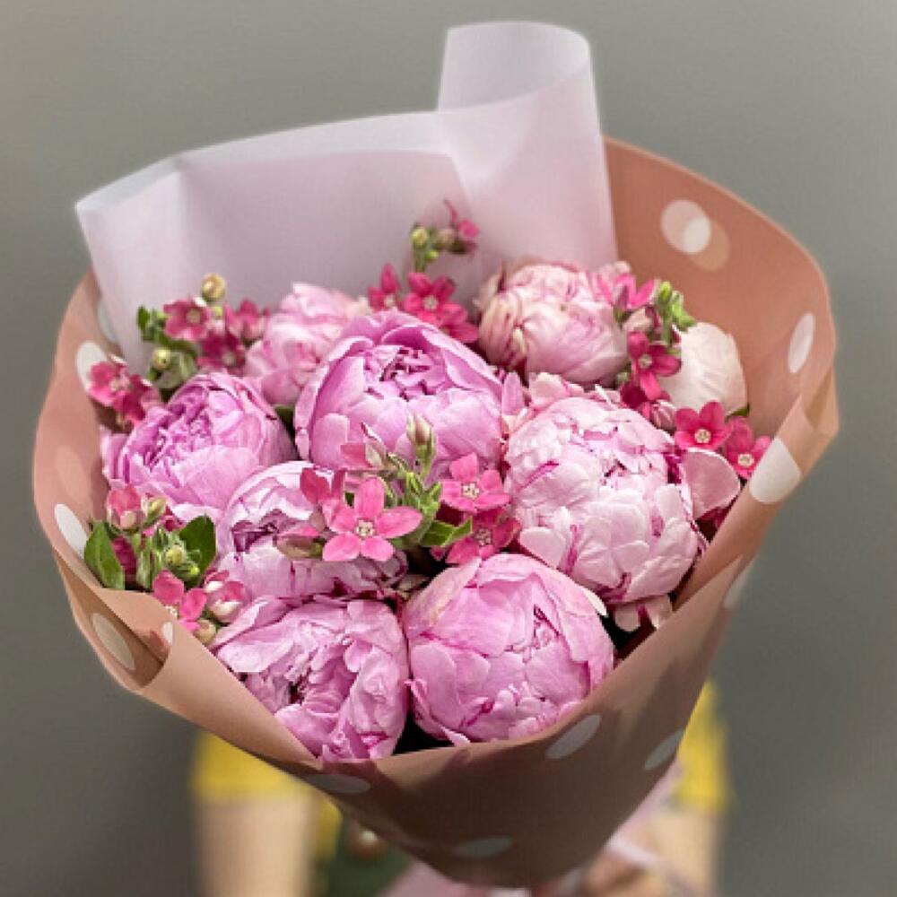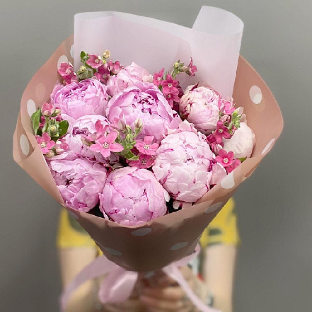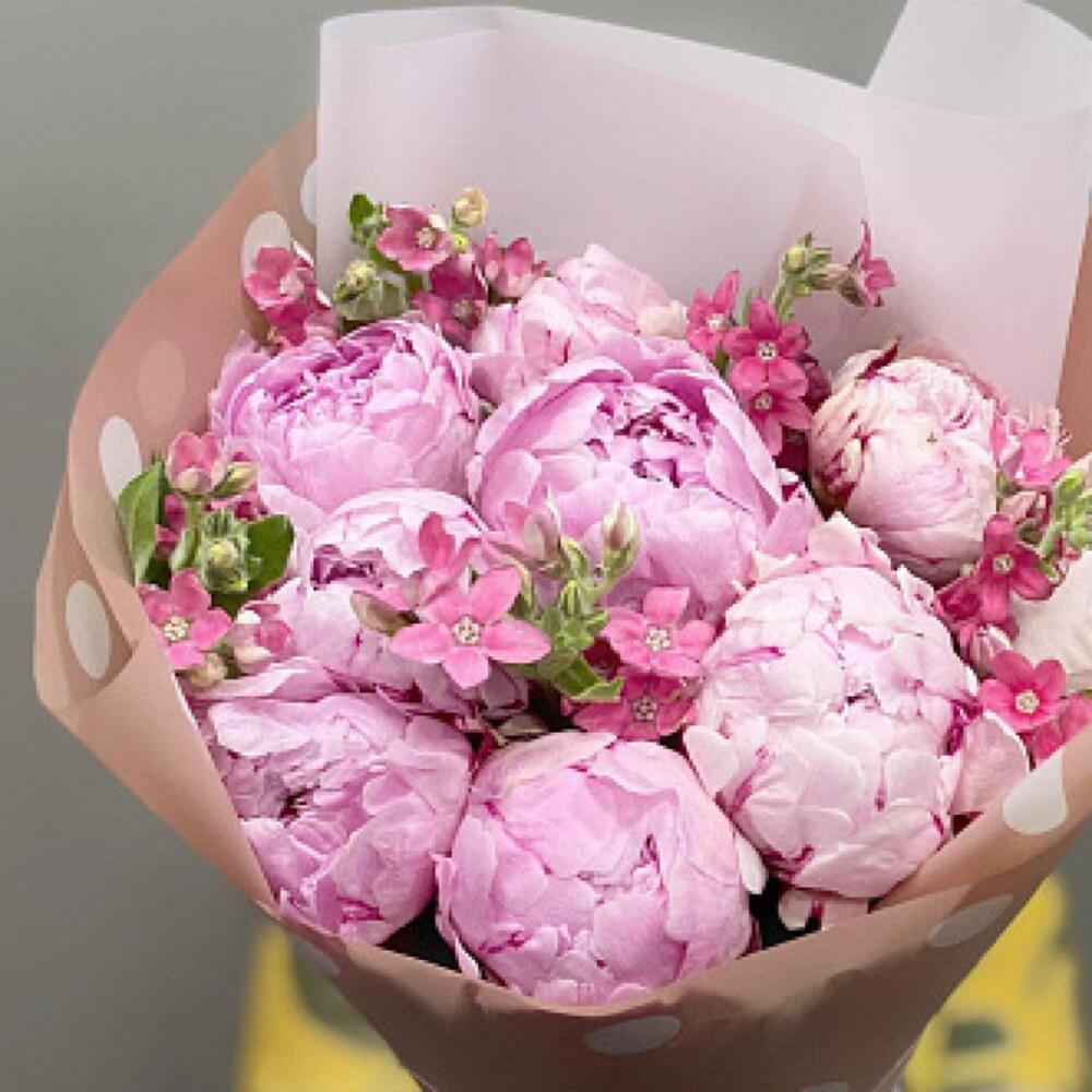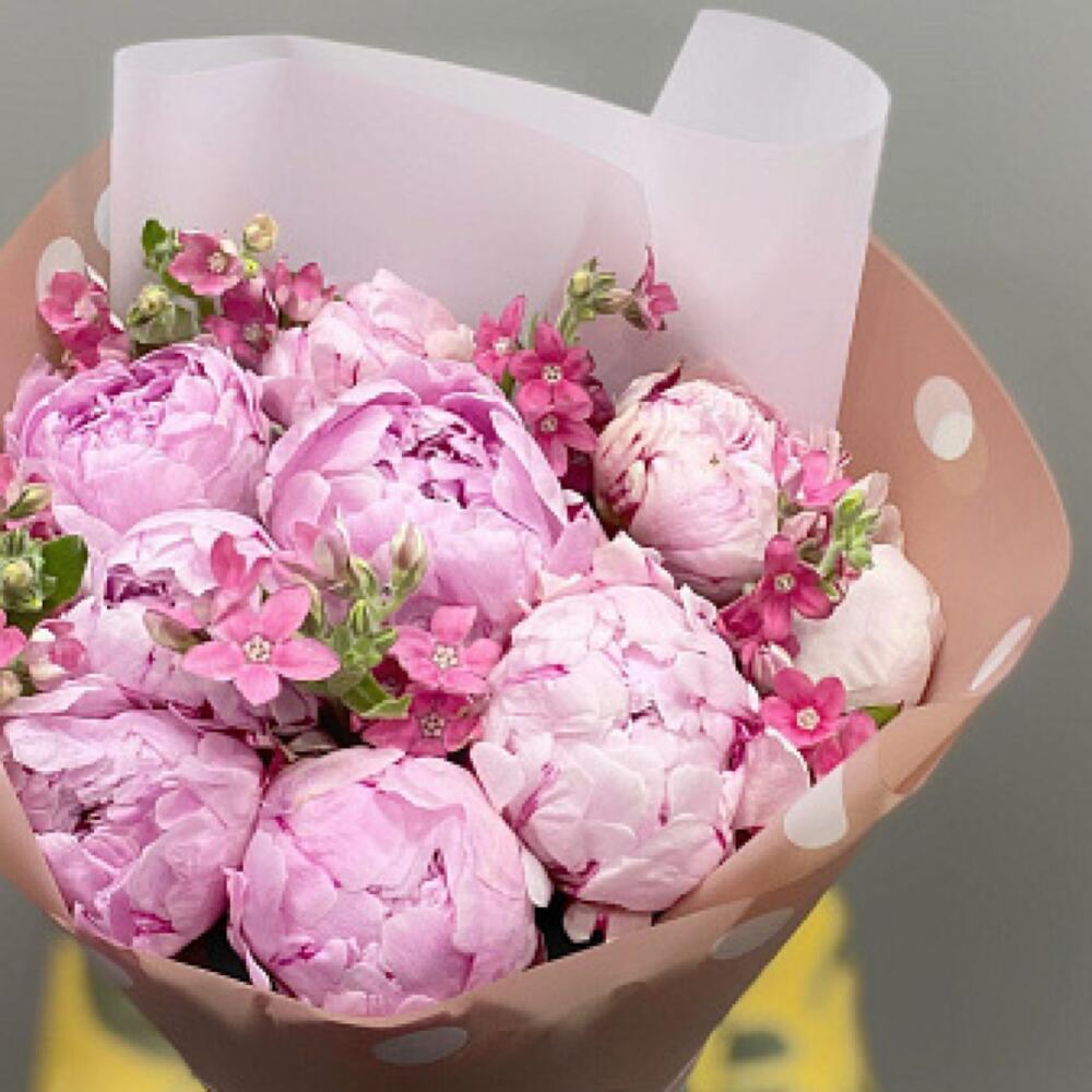 Лента атласная - 1 шт. Оксипеталум - 5 шт. Пленка дизайнерская - 1 шт. открыточка - 1 шт. пионы сара бернар - 9 шт.