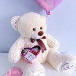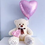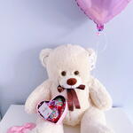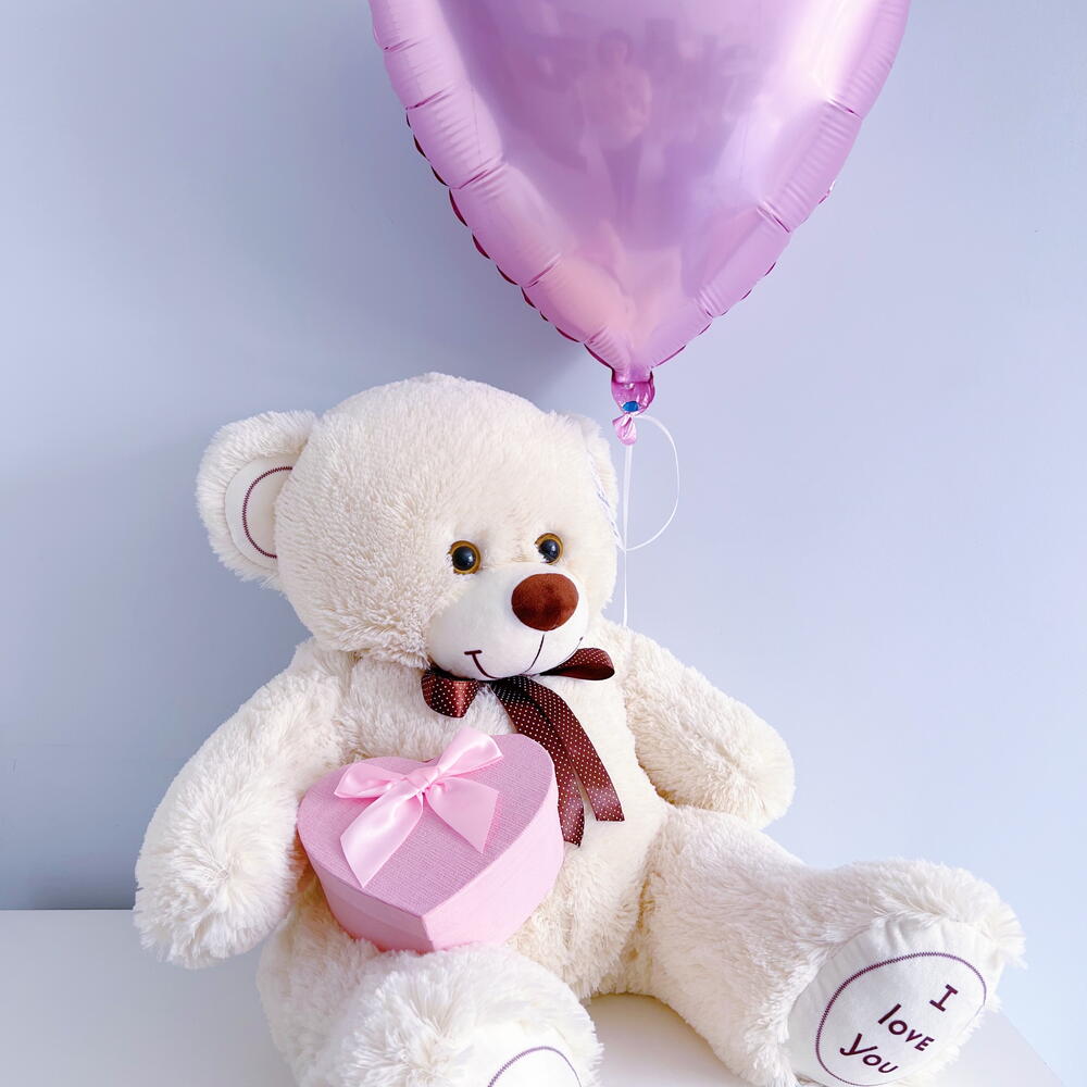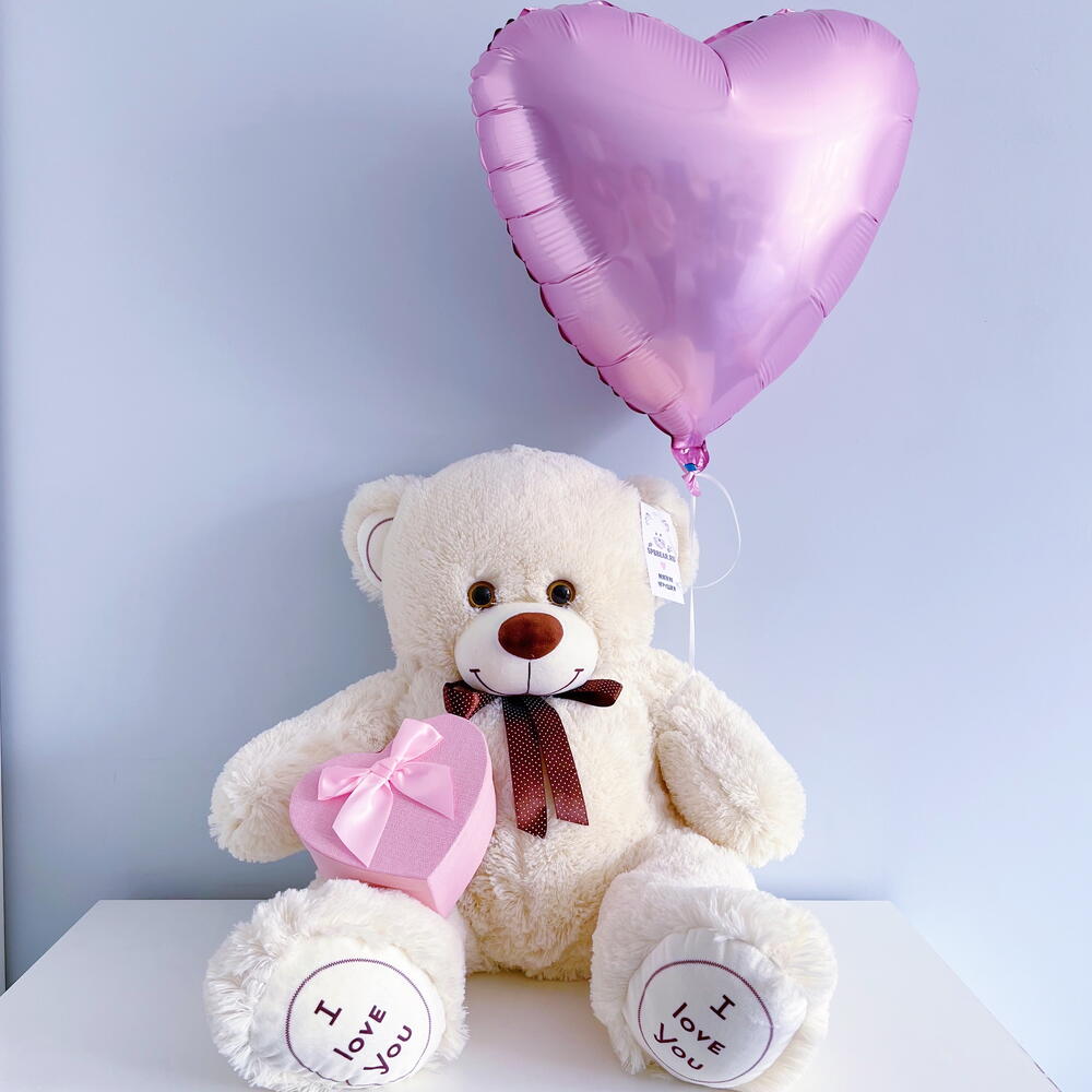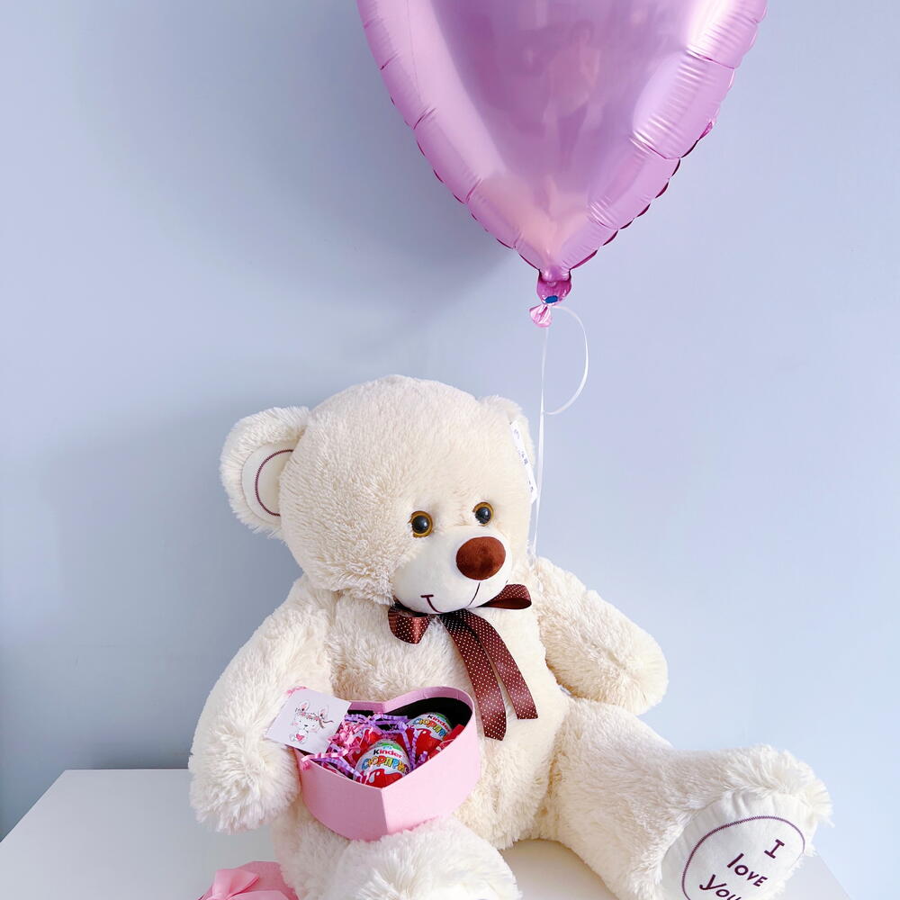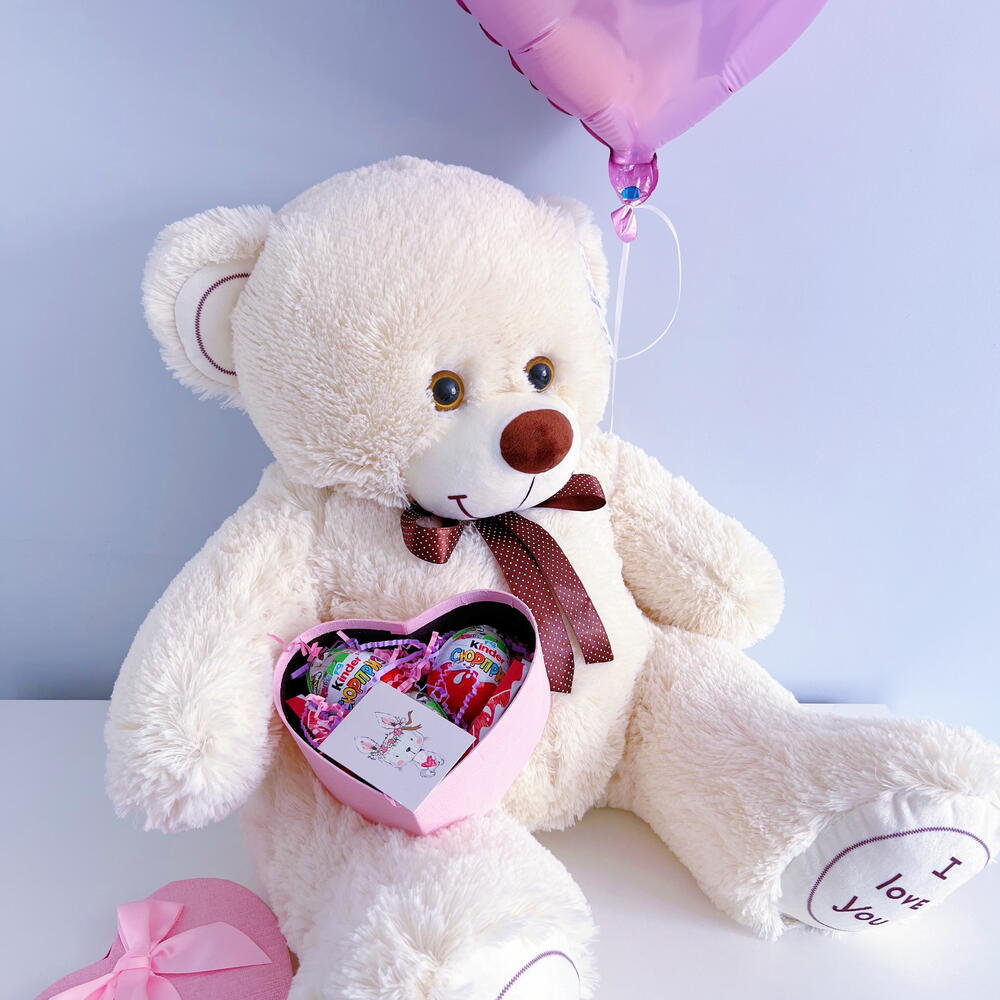 Плюшевый мишка 90 см бежевый, Шар сердце розовый, Киндербокс малый
