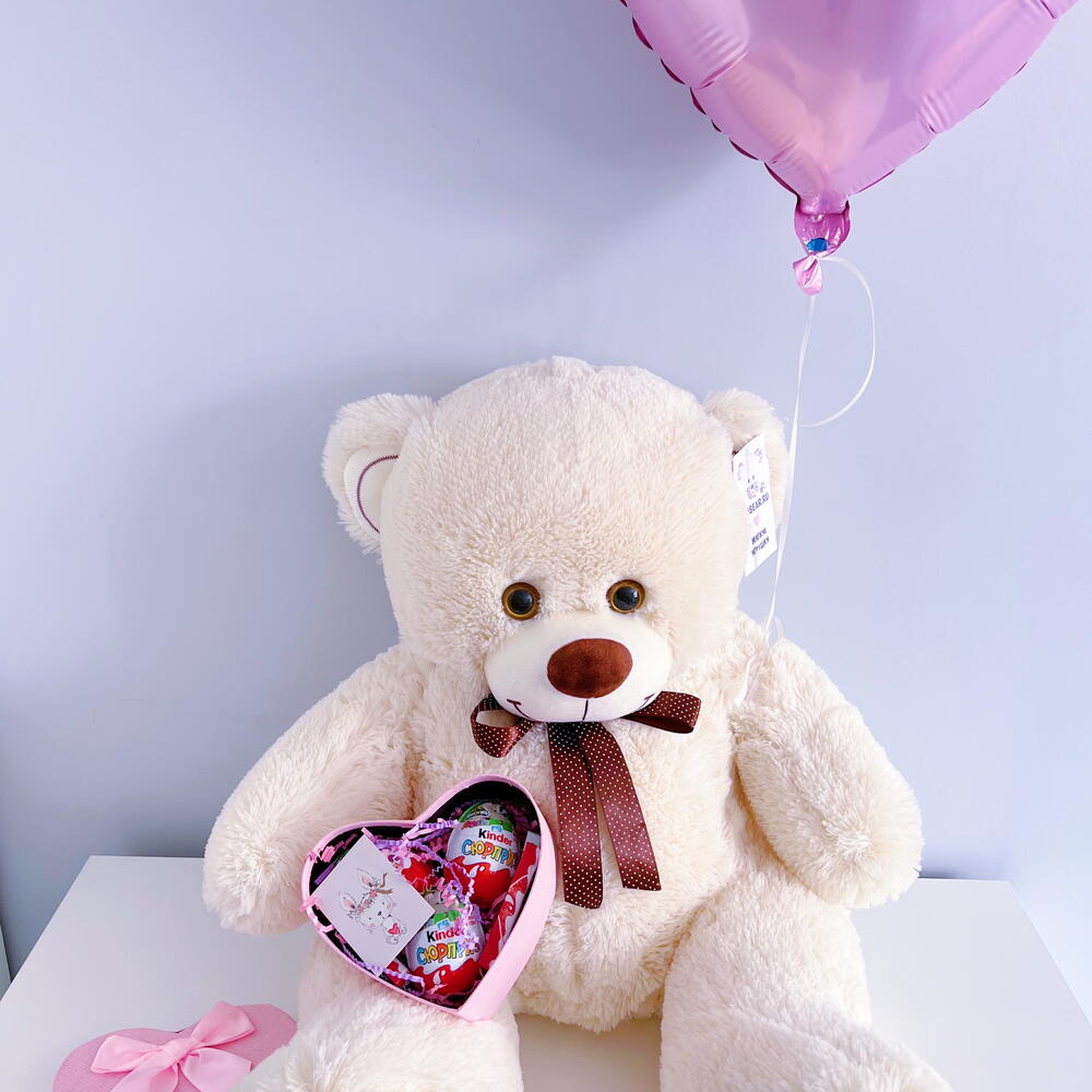 Состав подарочного набора: 1. Большая мягкая игрушка плюшевый медведь, объемный размер - 90 см. Длина игрушки (в человеческий рост) - 70 см Сидя 50 см Объемный размер учитывает толщину игрушки и состоит из суммы двух размеров: Первый размер от головы до хвоста (по спине) - 50 см Второй размер от хвоста до кончиков лап - 40 см 2. Один фольгированный шар наполненный гелием: Цвет розовый; Количество в наборе 1 шт; Размер 18 дюймов; Время полета от 5 суток; 3. Киндербокс сладкий набор малый: Шоколадное яйцо Киндер сюрприз 3 шт; Киндер шоколад 4 стика; Открытка;