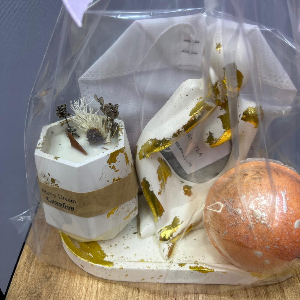 Бомбочка для ванной - 1 шт. подставка из гипса - 1 шт. фигурка из гипса ручной работы - 1 шт. свеча из кокосового воска 70 мл - 1 шт. чай для ванной 150 гр - 1 шт.