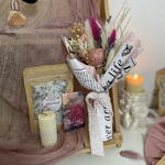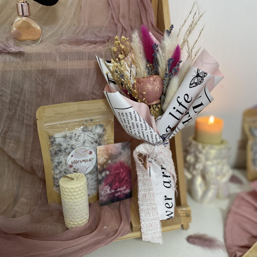 Открытка - 1 шт. морская соль для ванной - 1 шт. медовая свеча ручной работы - 1 шт. ароматическое саше - 1 шт. букет со свечой из пчелиного воска и сухоцветов - 1 шт.