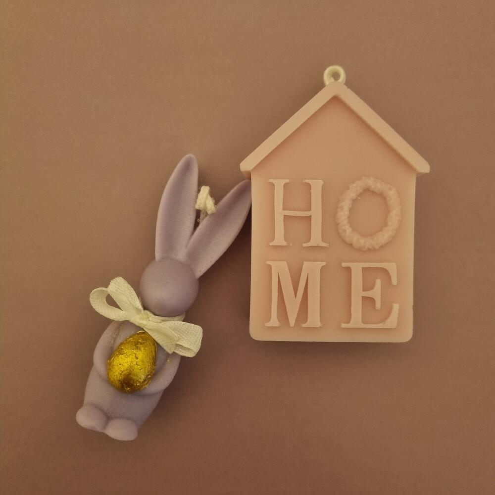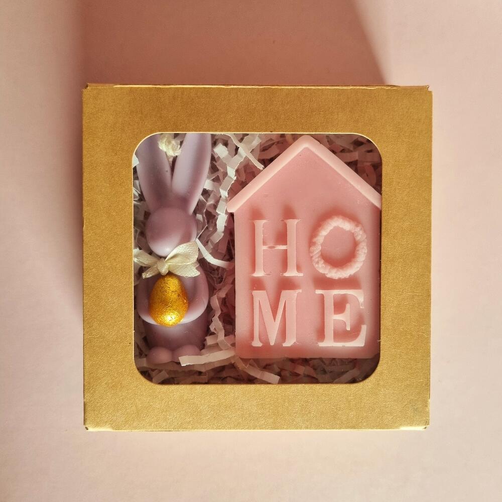 Подарочная коробка - 1 шт. Наполнитель бумажный - 1 шт. упаковочная лента - 1 шт. свеча кролик - 1 шт. домик home - 1 шт.