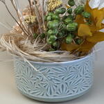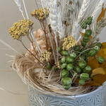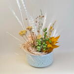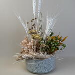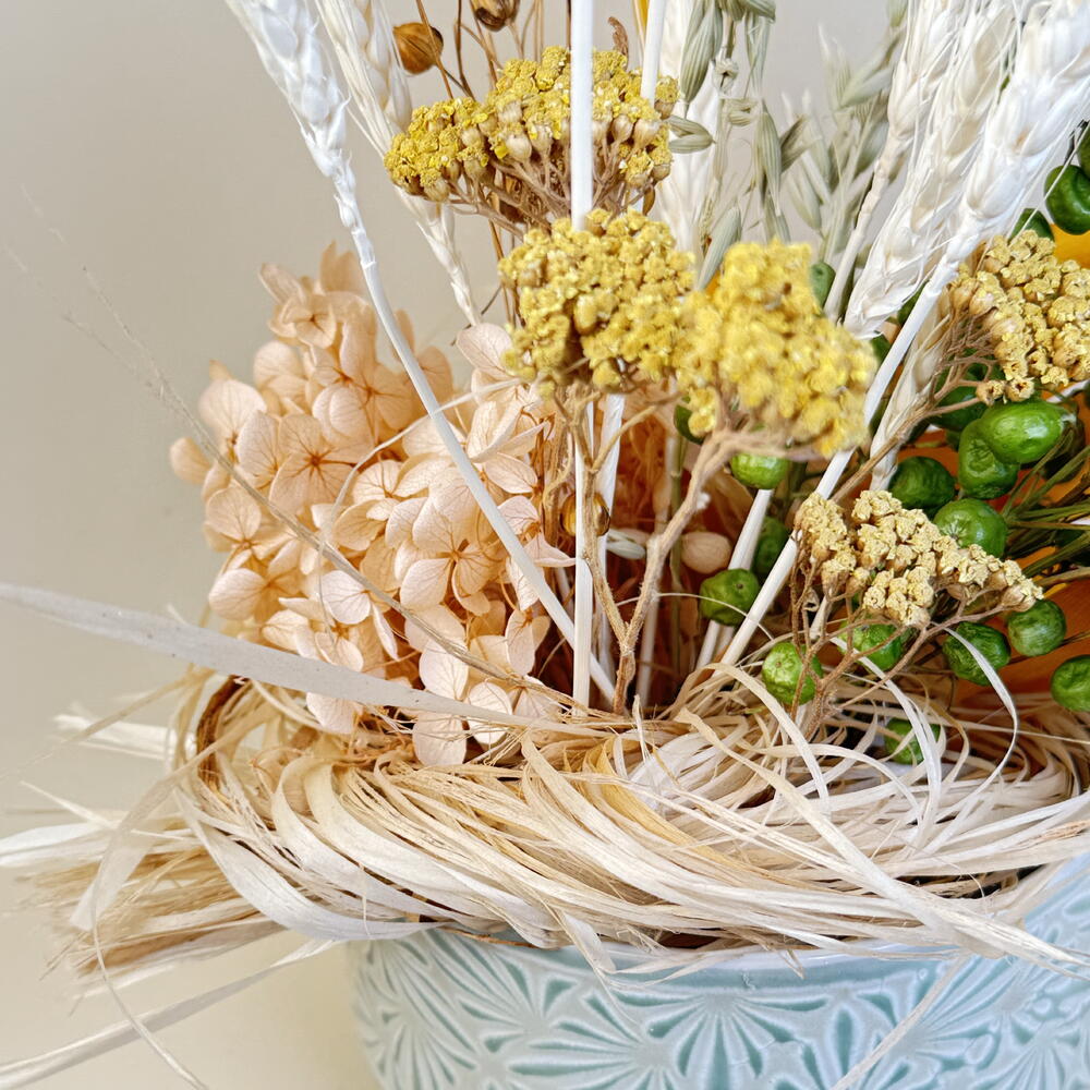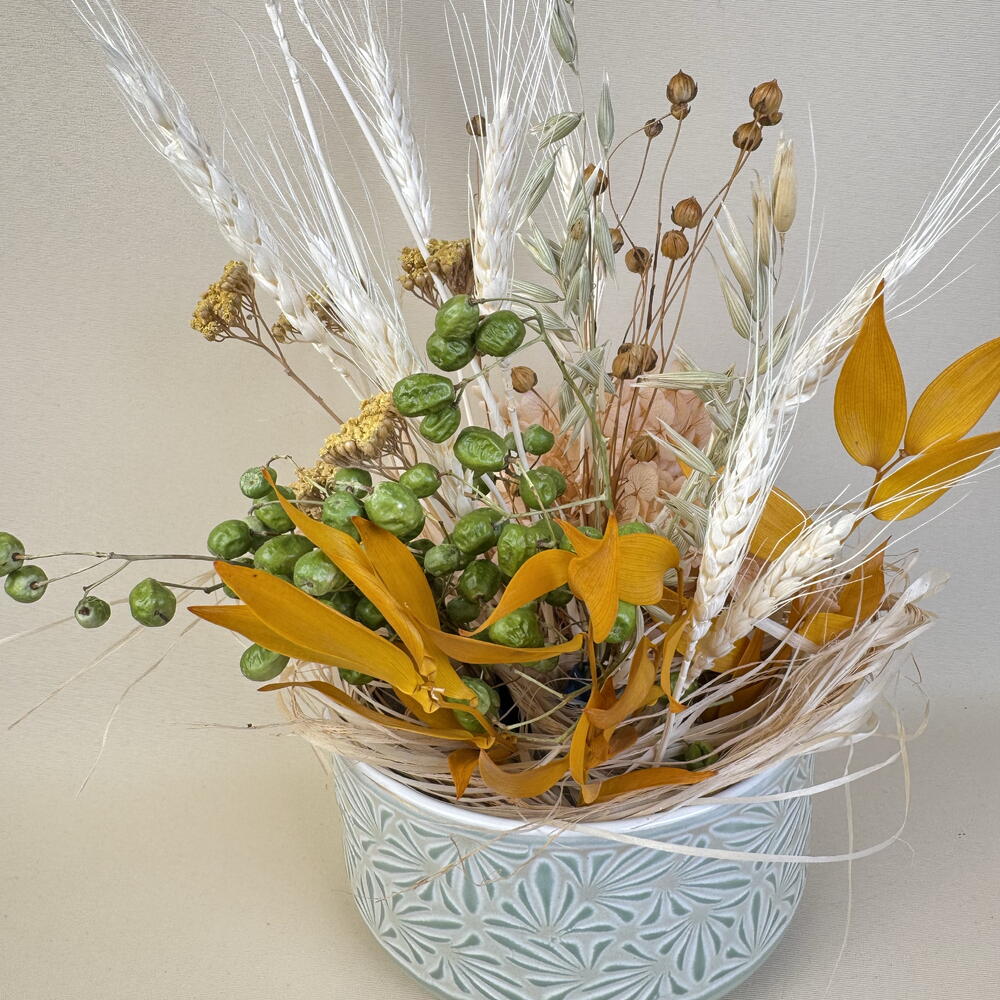Пшеница (сухоцвет) - 1 шт. овес сухоцвет - 1 шт. рускус стабилизированный - 1 шт. гортензия стабилизированная - 1 шт. лен сухоцвет - 1 шт. лыко натуральное - 1 шт. ваза фарфоровая - 1 шт. мелия сушеная - 1 шт.