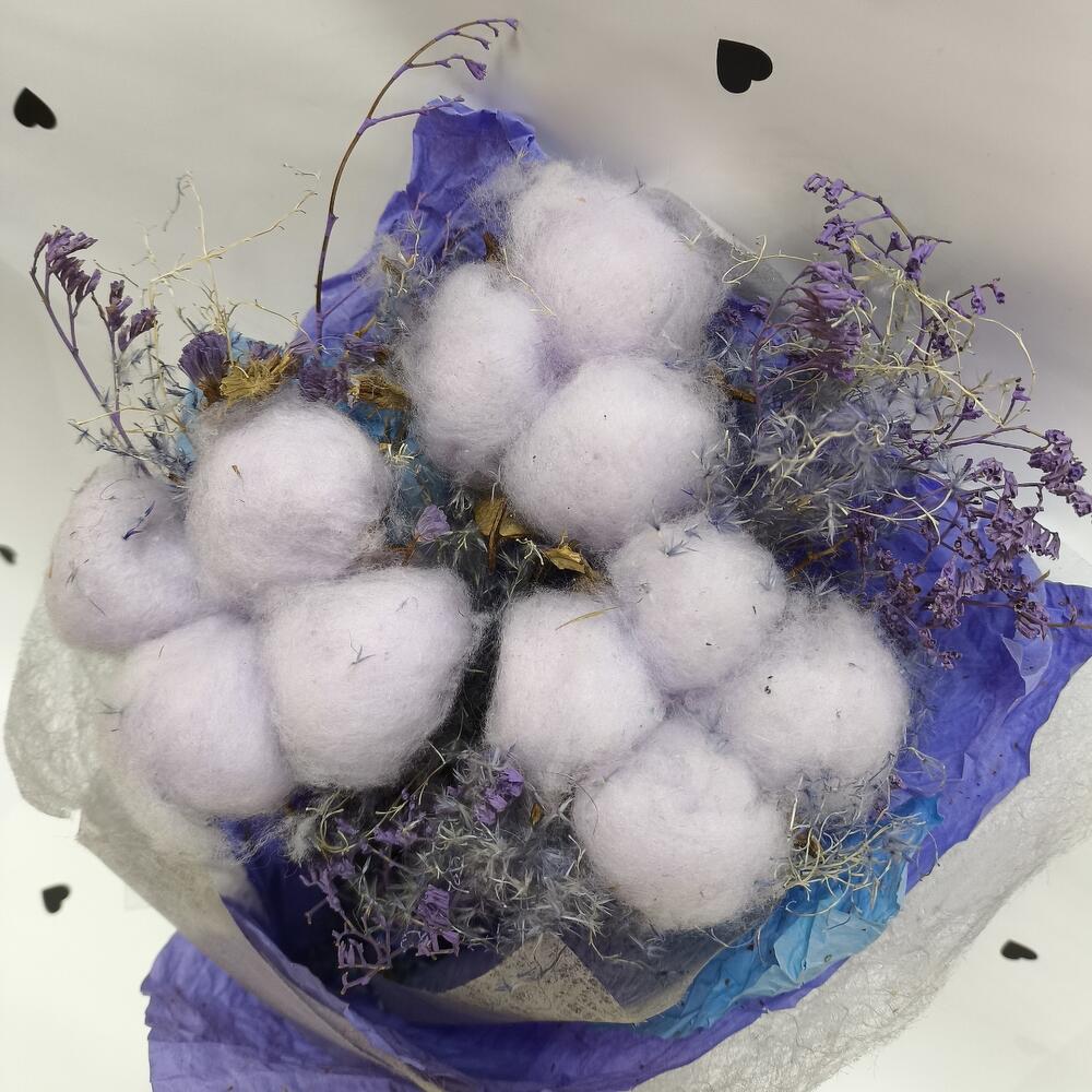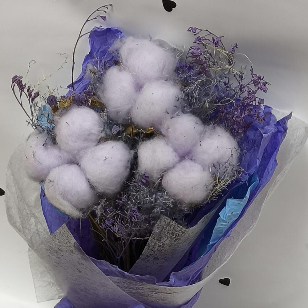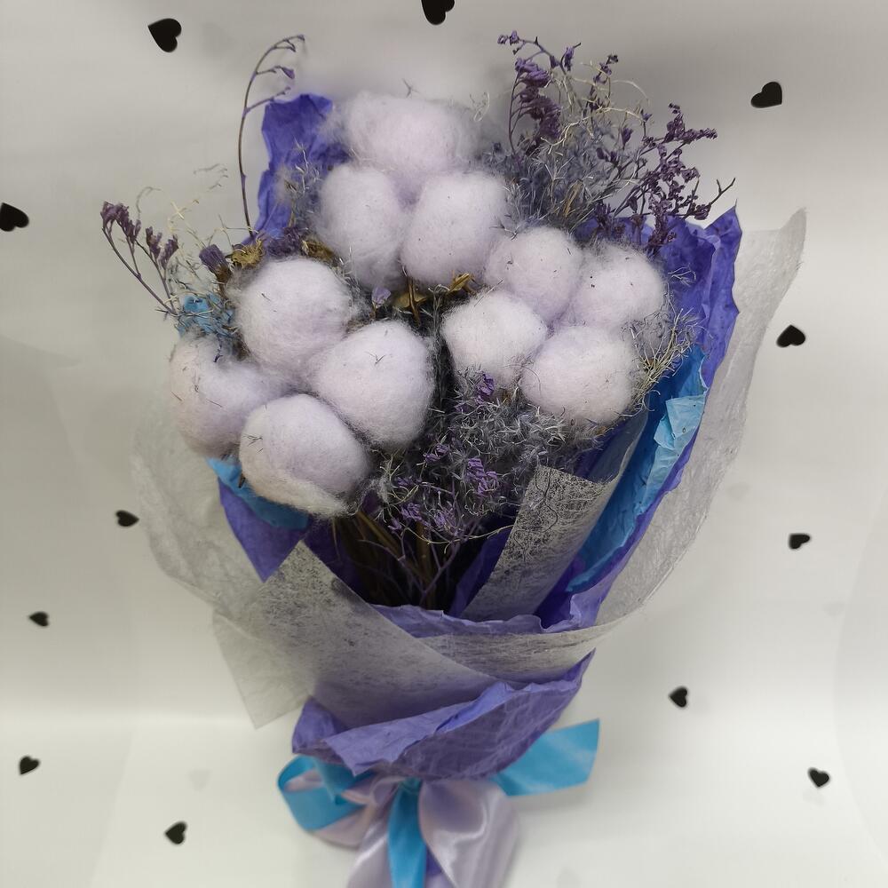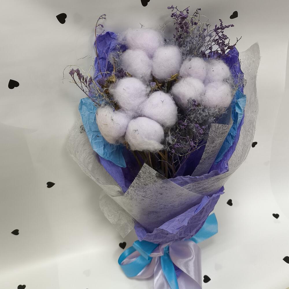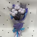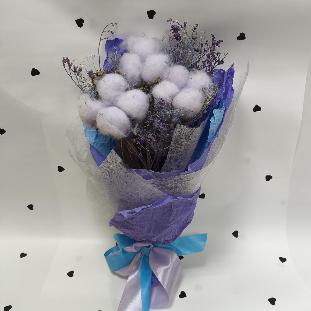 Лимониум - 2 шт. Паникум - 3 шт. Статица - 1 шт. Лента атласная - 2 шт. Упаковка дизайнерская - 2 шт. Хлопок натуральный - 3 шт.