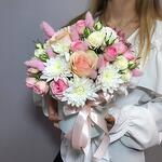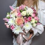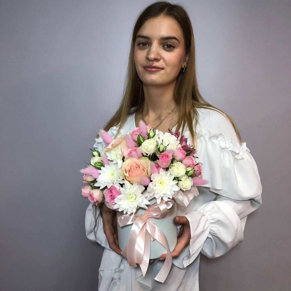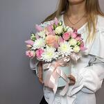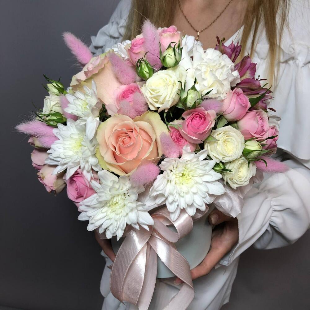Роза кустовая - 2 шт. Хризантема кустовая - 1 шт. Роза - 3 шт. Диантус - 3 шт. Шляпная коробка - 1 шт. Флористический оазис - 1 шт. Матовая пленка - 1 шт. Лагурус (сухоцвет) - 10 шт. атласный бант двойной - 1 шт.