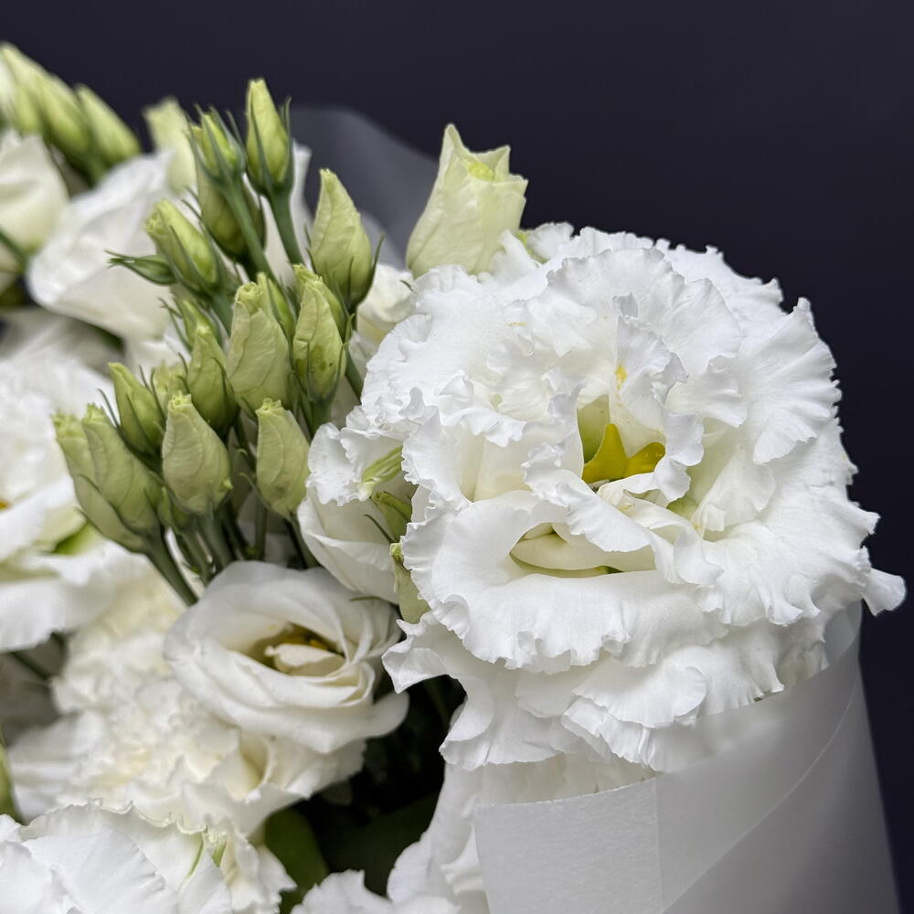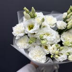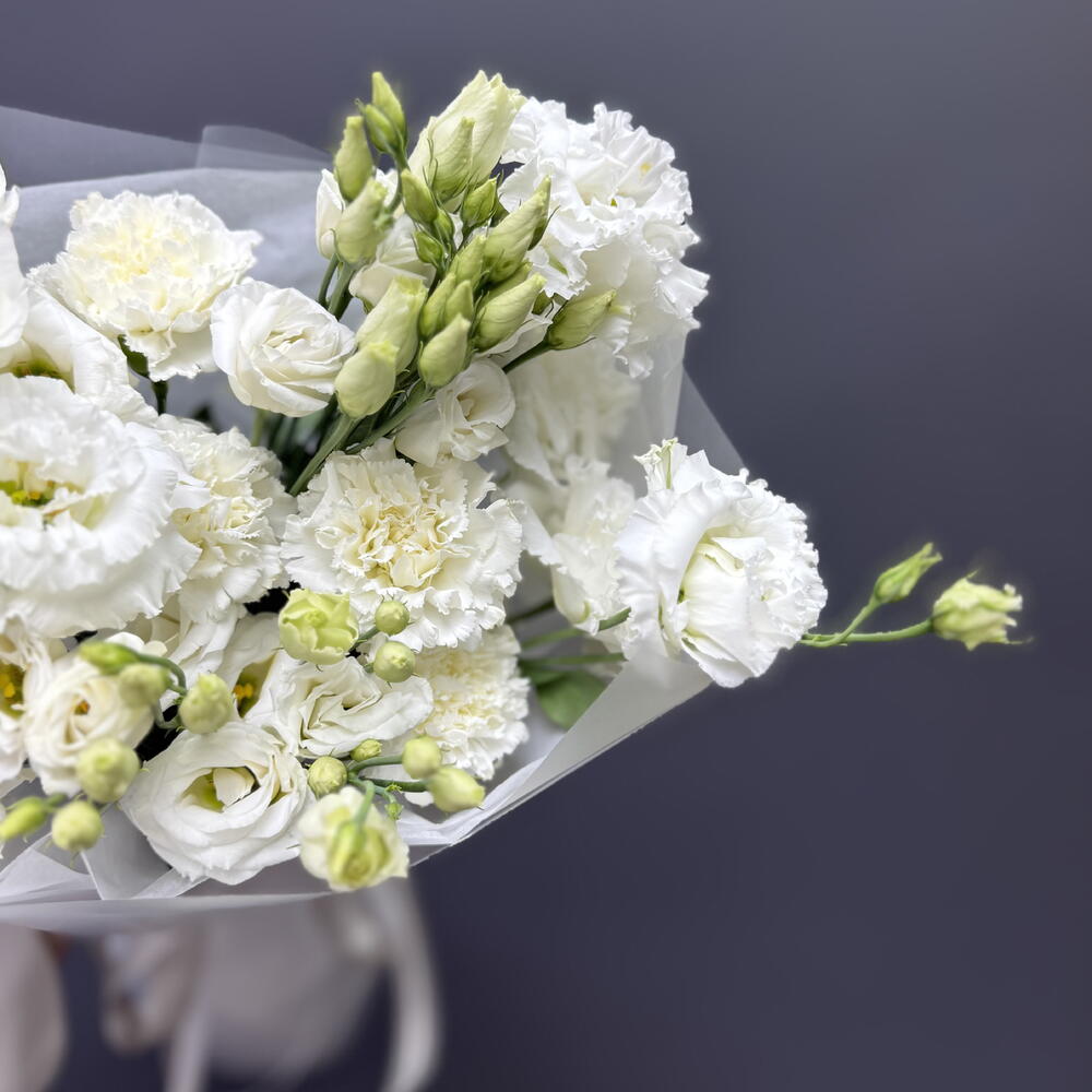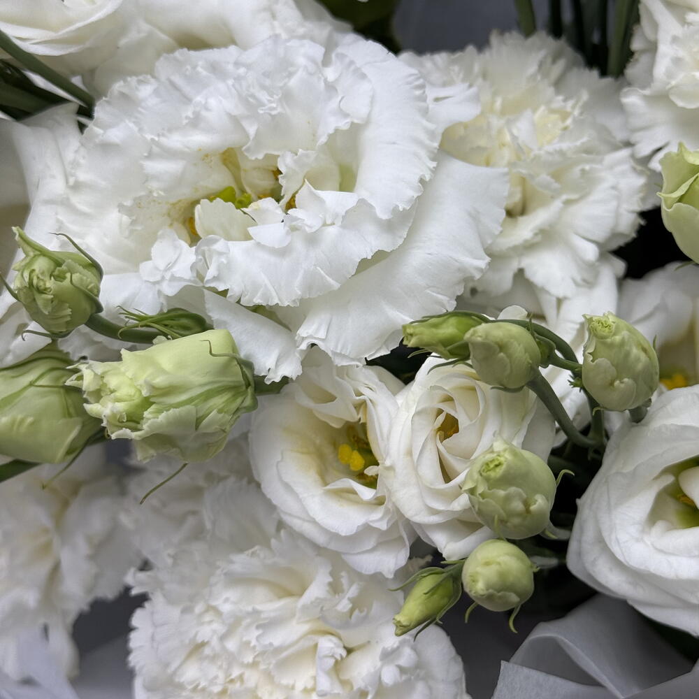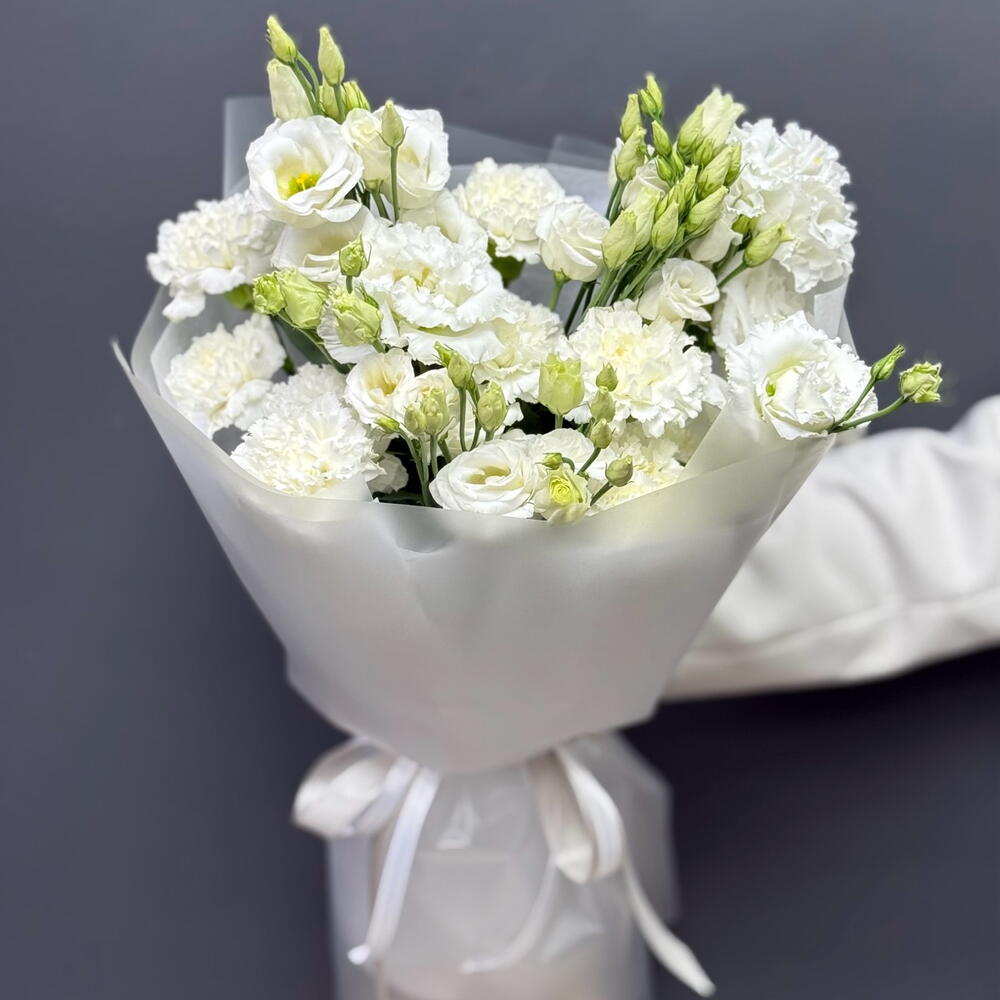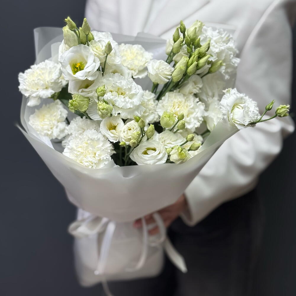 Прекрасный белый дуэт диантусов и эустомы в матовой упаковке