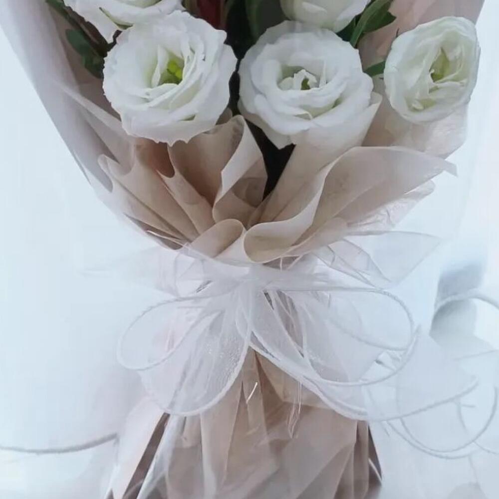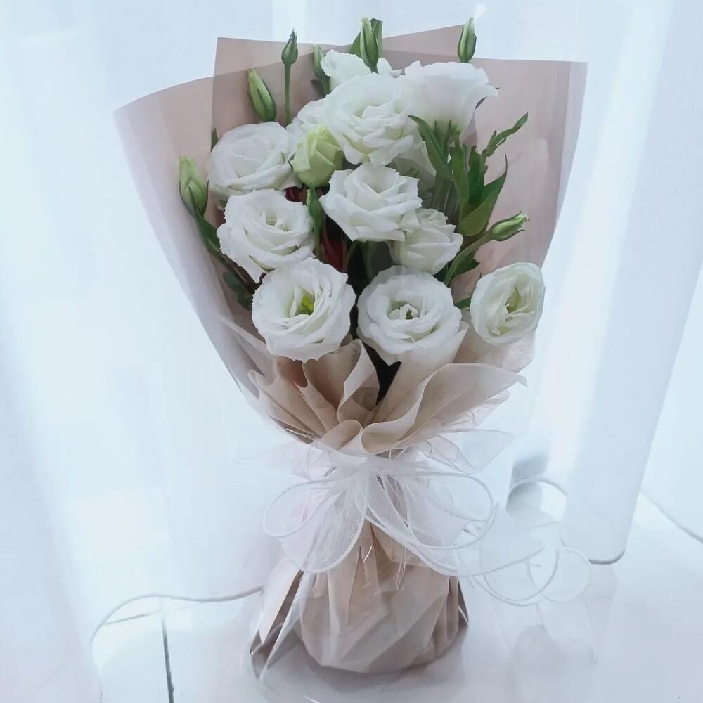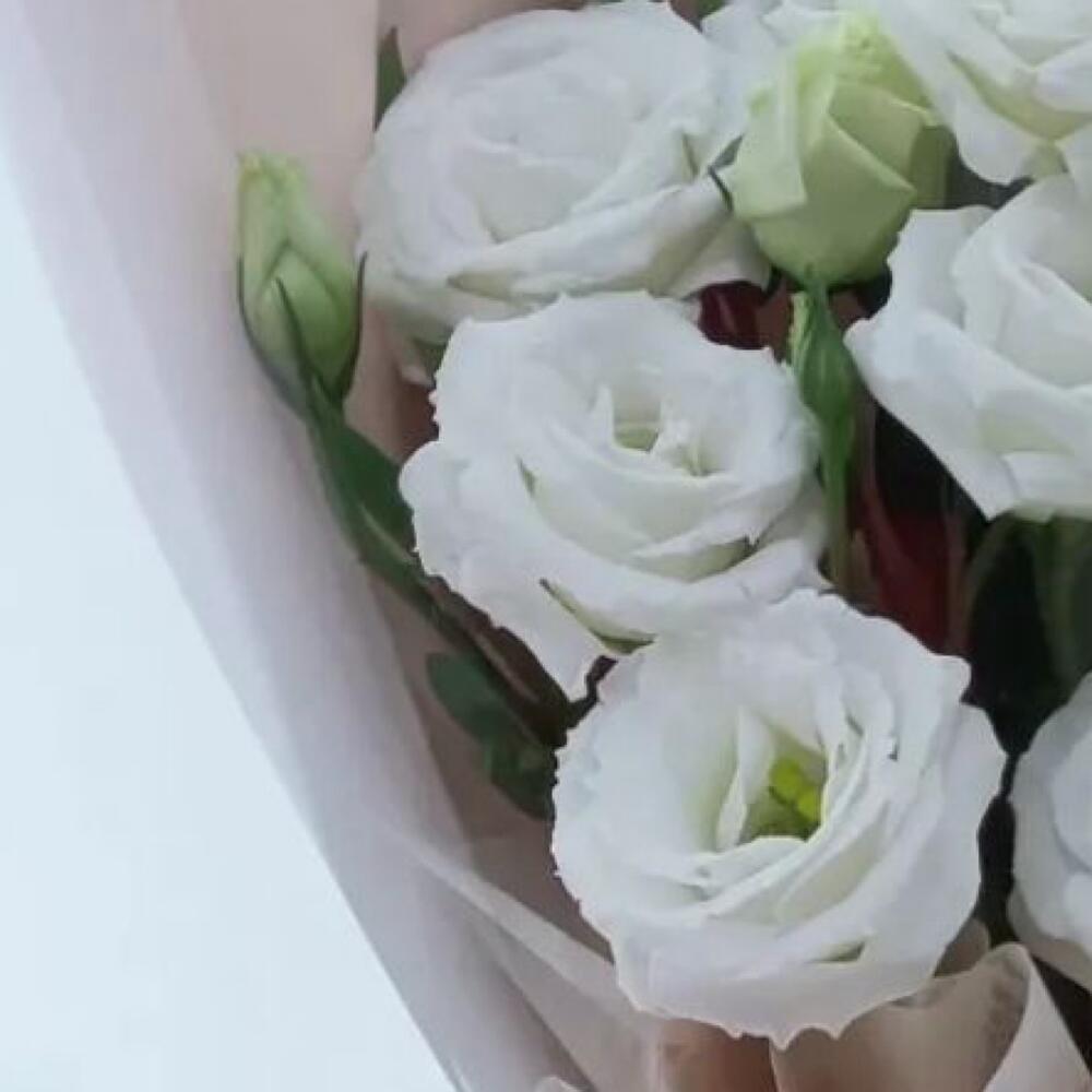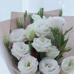 Лента - 1 шт. Упаковка дизайнерская - 1 шт. Открыточка с вашими пожеланиями - 1 шт. эустома белая кустовая - 7 шт. отличное настроение от флориста - 100 шт.