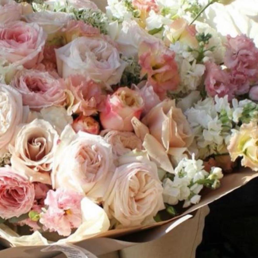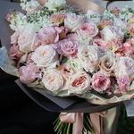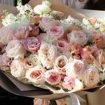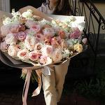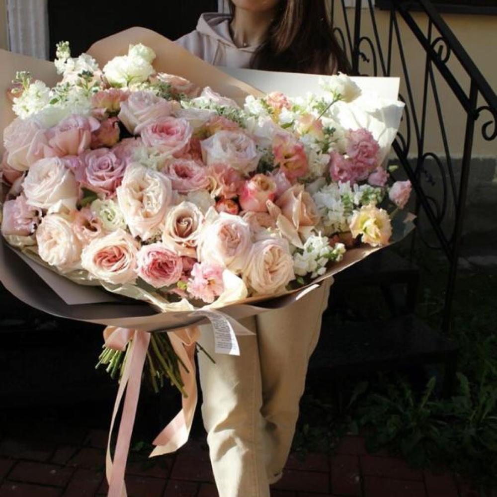 Лизиантус - 25 шт. Маттиола - 10 шт. Лента атласная - 3 шт. Роза пионовидная - 25 шт. Упаковка дизайнерская - 4 шт. зелень декоративная - 27 шт. пионы - 3 шт.