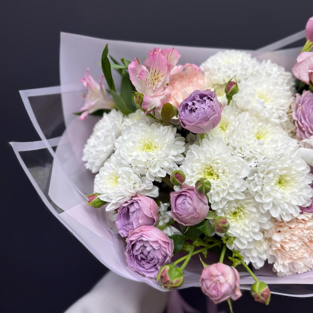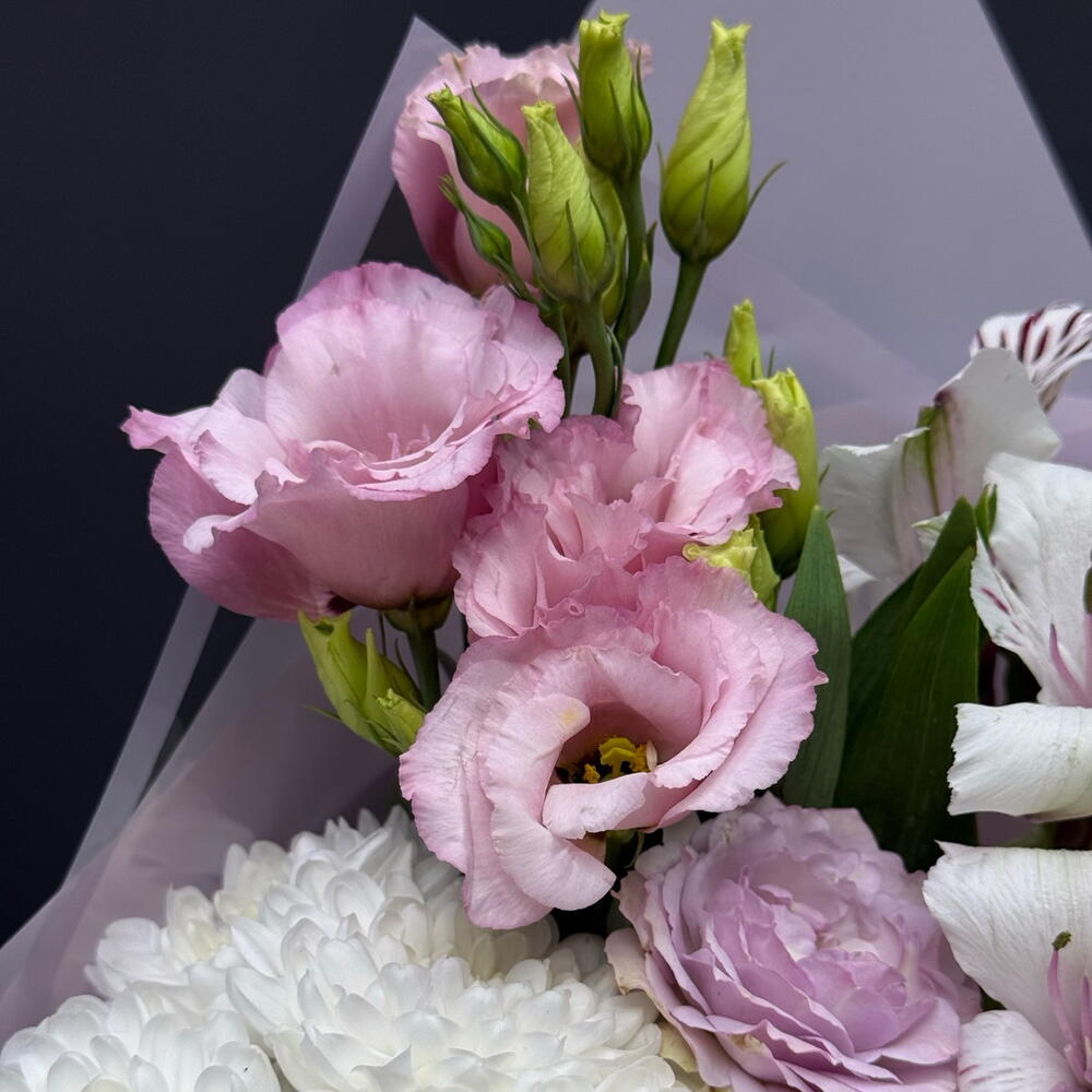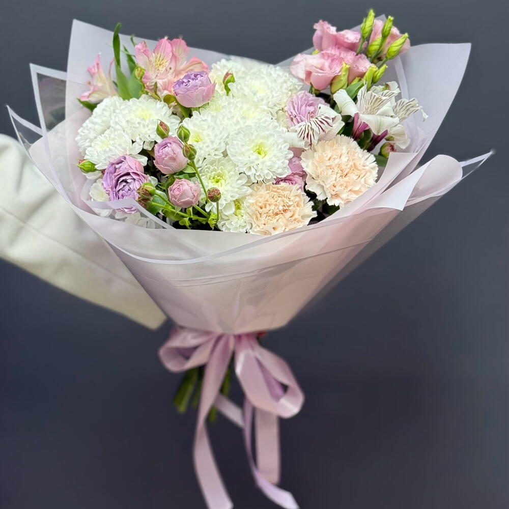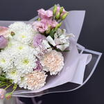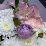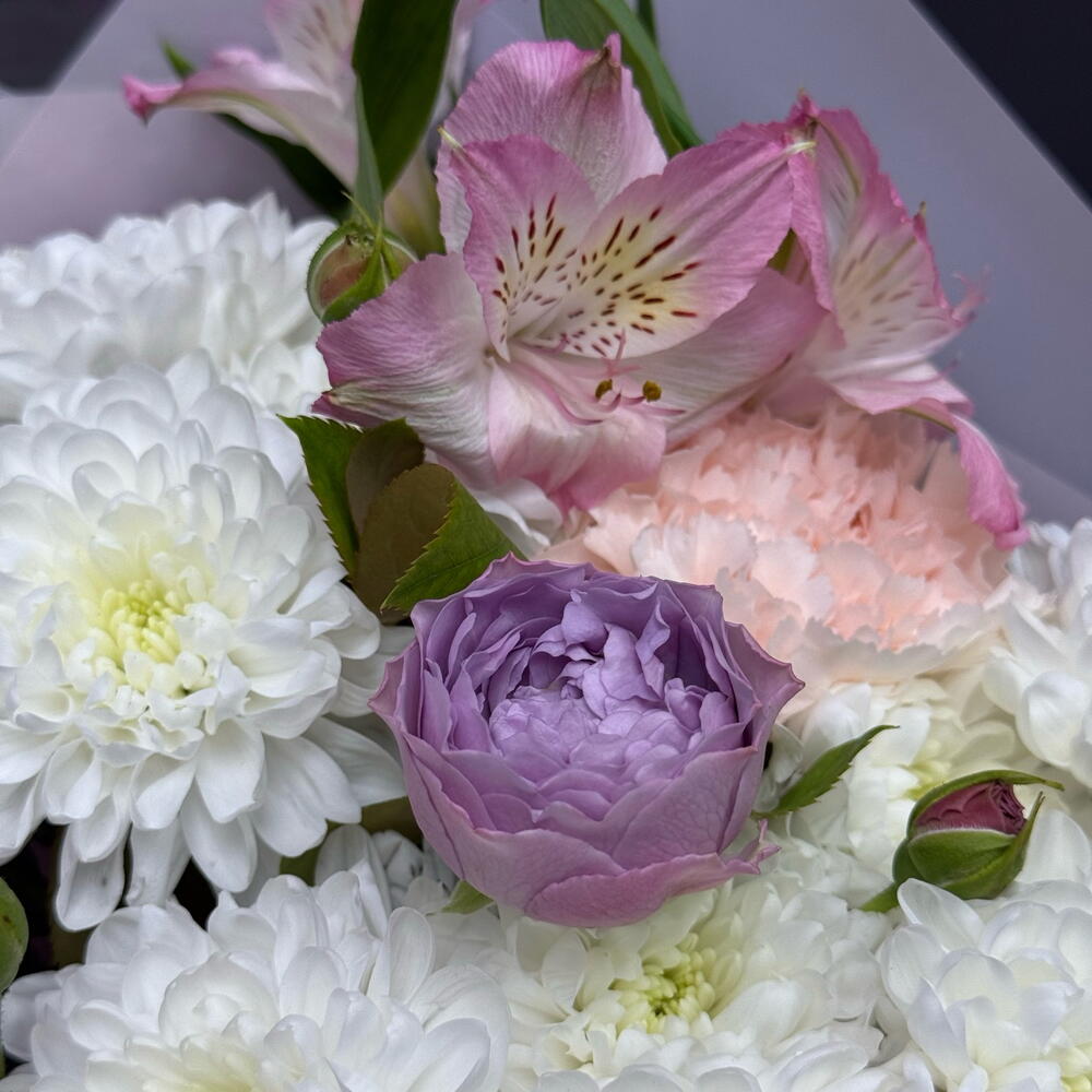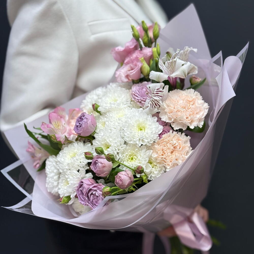 Альстромерия - 2 шт. Хризантема кустовая - 3 шт. Эустома - 1 шт. Диантус - 3 шт. Упаковка дизайнерская - 1 шт. лавендер баблс - 2 шт.