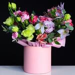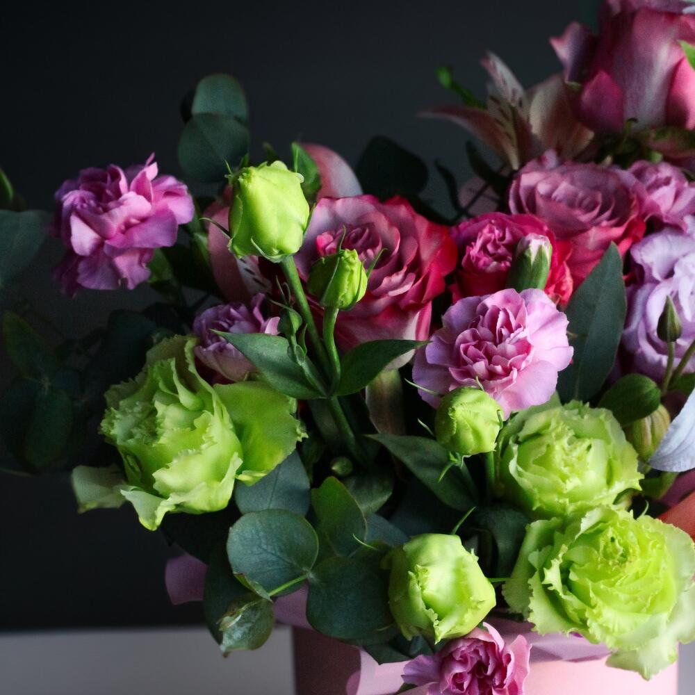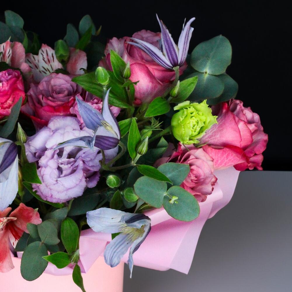 Лизиантус - 1 шт. Эвкалипт - 1 шт. Кустовая роза - 2 шт. Коробка шляпная - 1 шт. Кустовая гвоздика - 2 шт. Клематис - 1 шт. Оазис флористический - 1 шт. роза кения - 5 шт.