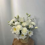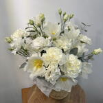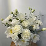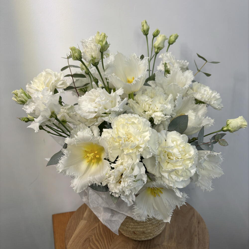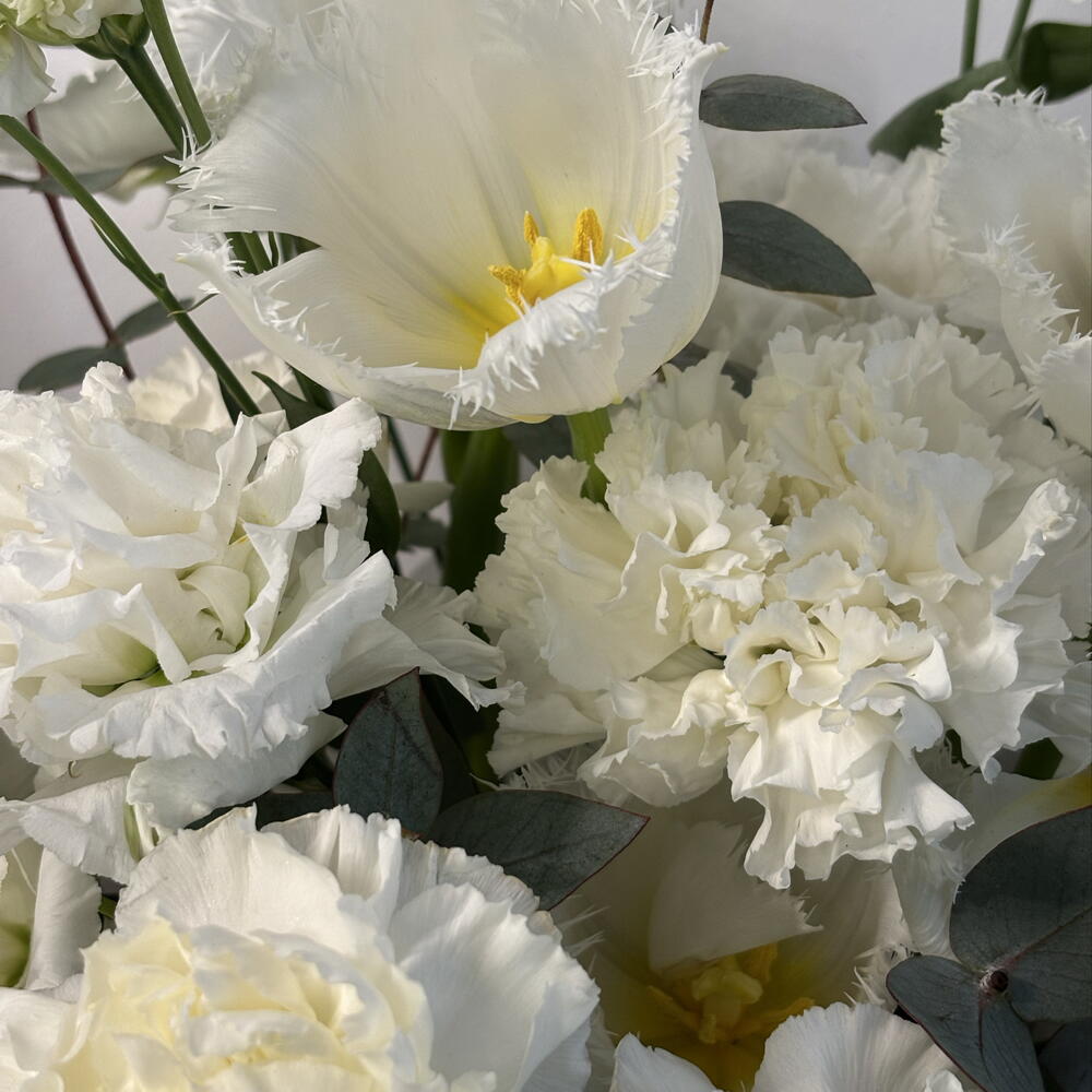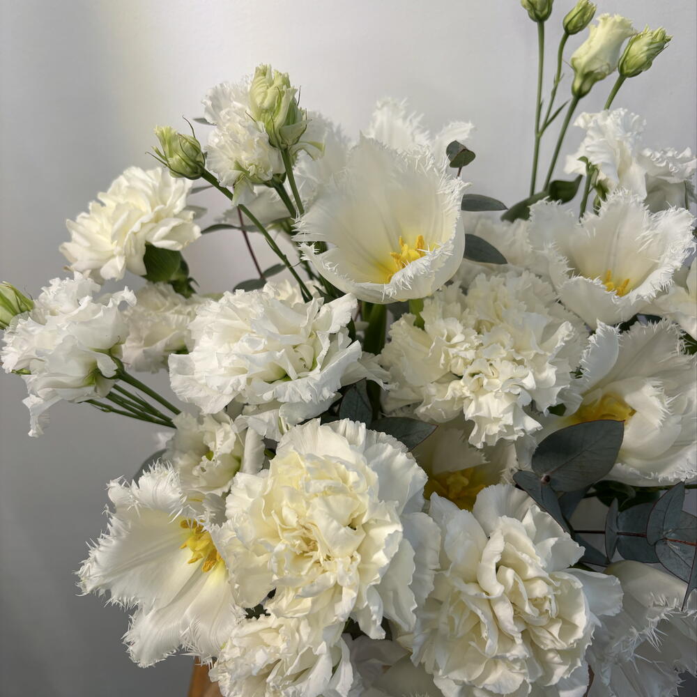 Нежная композиция из мохровых тюльпанов и воздушного лизиантуса