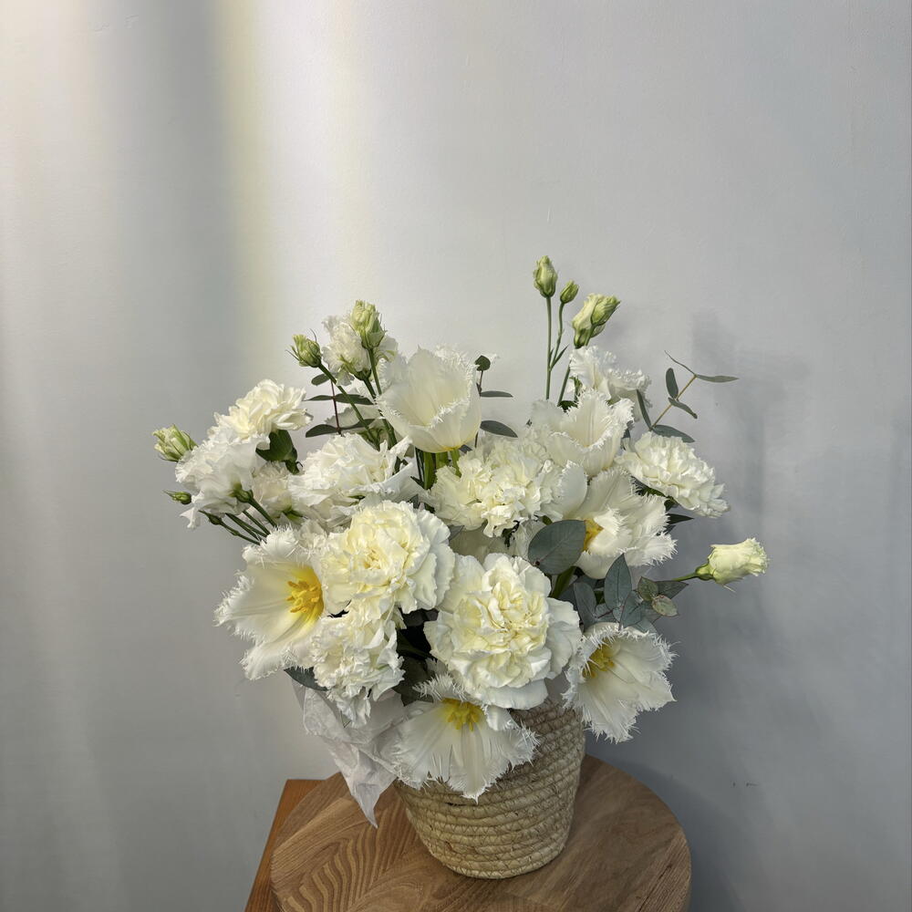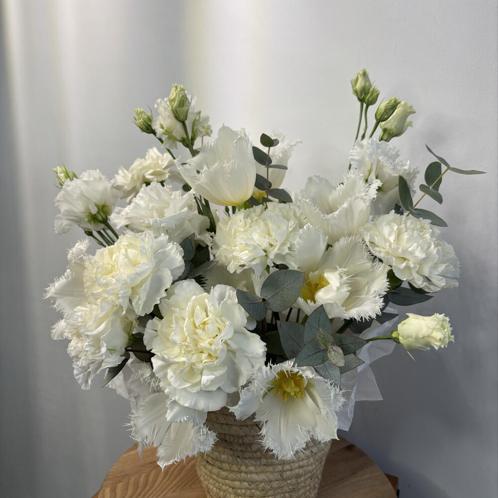 Лизиантус - 1 шт. Тюльпан - 8 шт. Диантус - 6 шт. Оазис - 1 шт. Эвкалипт Цинерея - 1 шт. джутовая корзина - 1 шт.