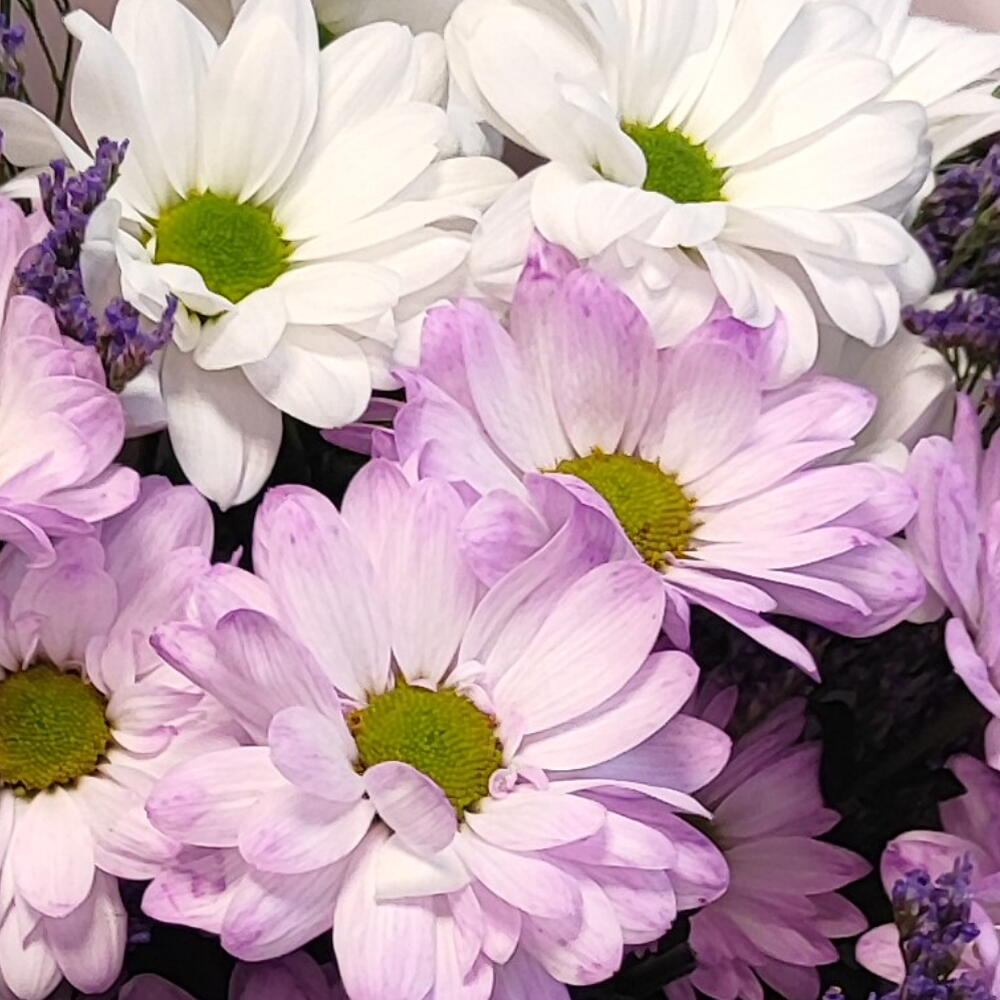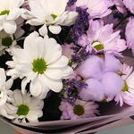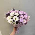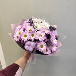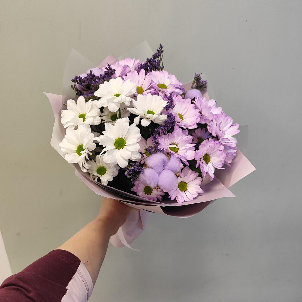 Лимониум - 2 шт. Хризантема кустовая - 3 шт. Лента атласная - 2 шт. Упаковка дизайнерская - 3 шт. Хлопок натуральный - 3 шт.