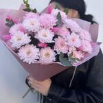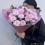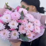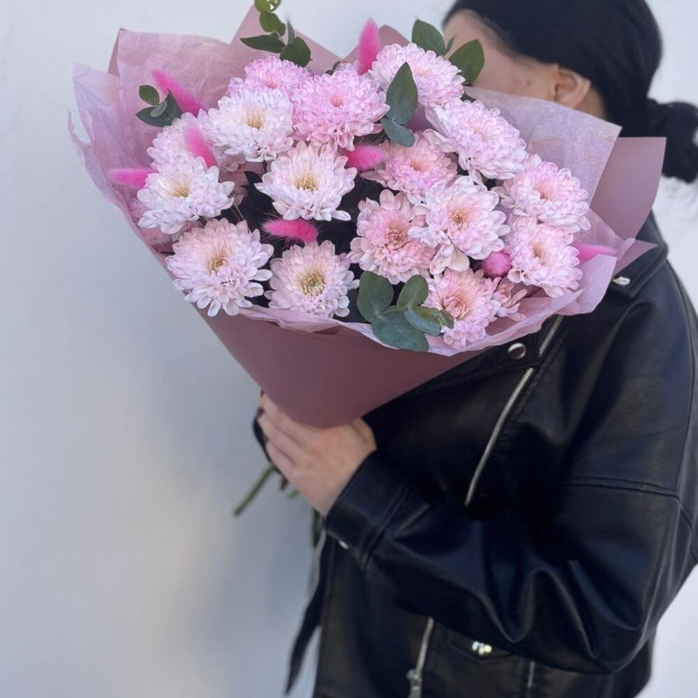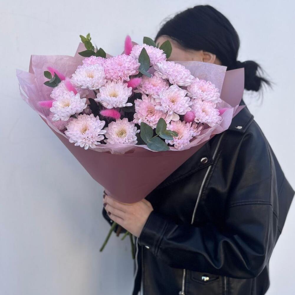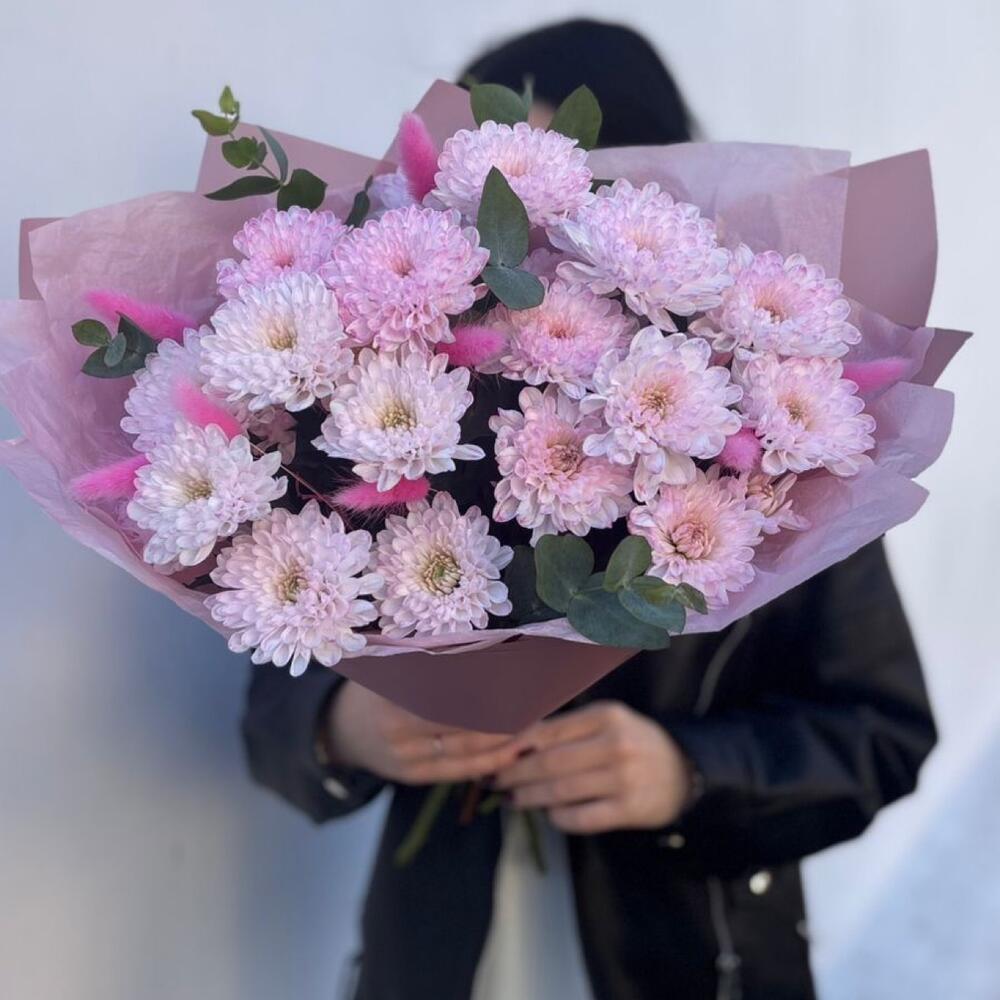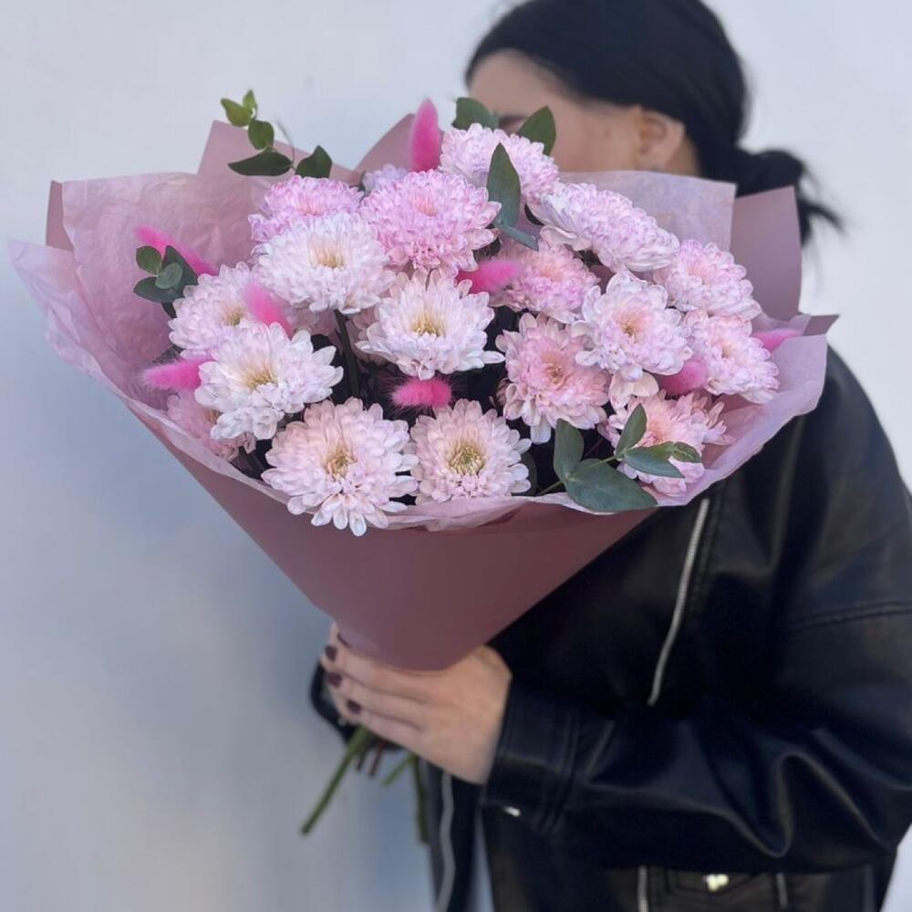 Пушистый букет с розовыми хризантемами, лагурусом и эвкалиптом