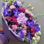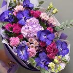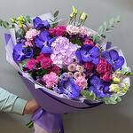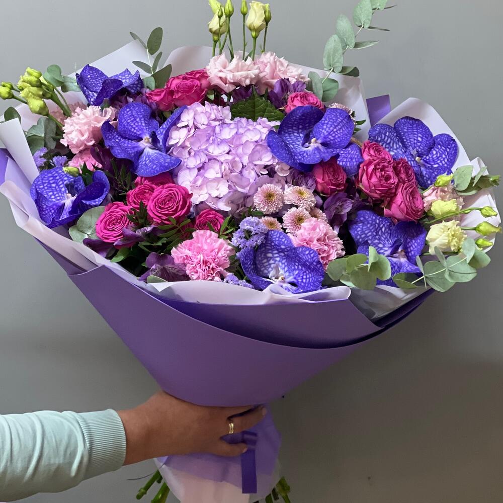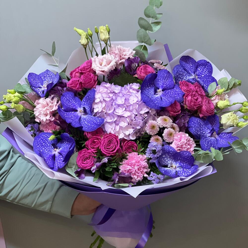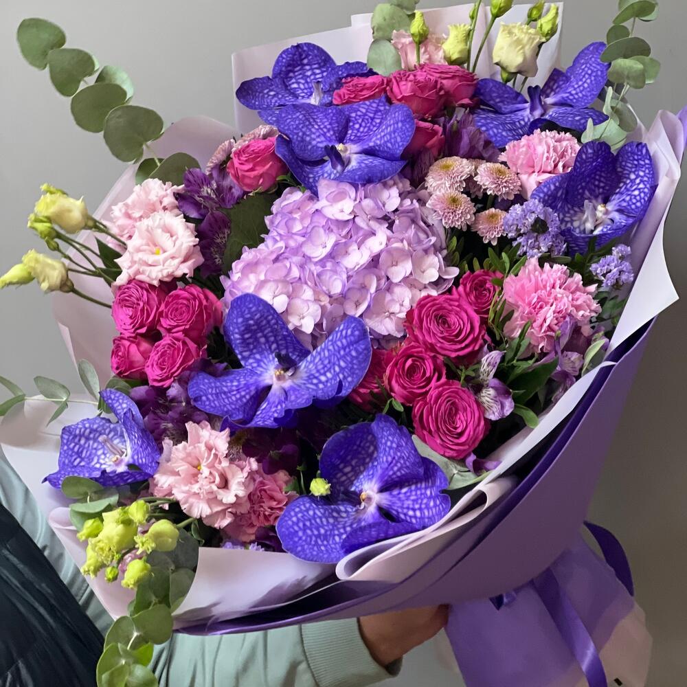 Альстромерия - 5 шт. Гортензия - 1 шт. Лизиантус - 3 шт. Статица - 2 шт. Эвкалипт - 5 шт. Лента атласная - 1 шт. Сантини - 2 шт. Роза кустовая пионовидная - 3 шт. Упаковка дизайнерская - 1 шт. Фисташка пучок - 1 шт. Диантус сортовой - 3 шт. ванда орхидея фиолетовая тайская - 7 шт.