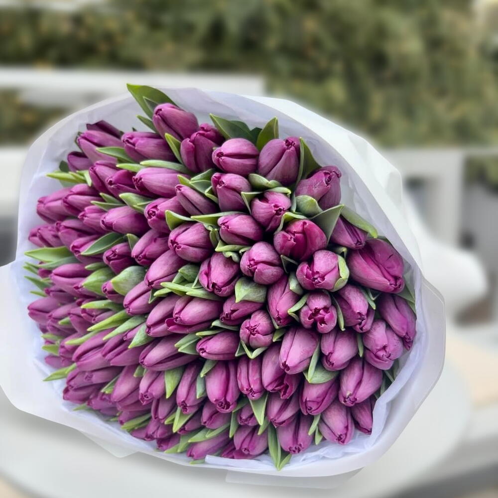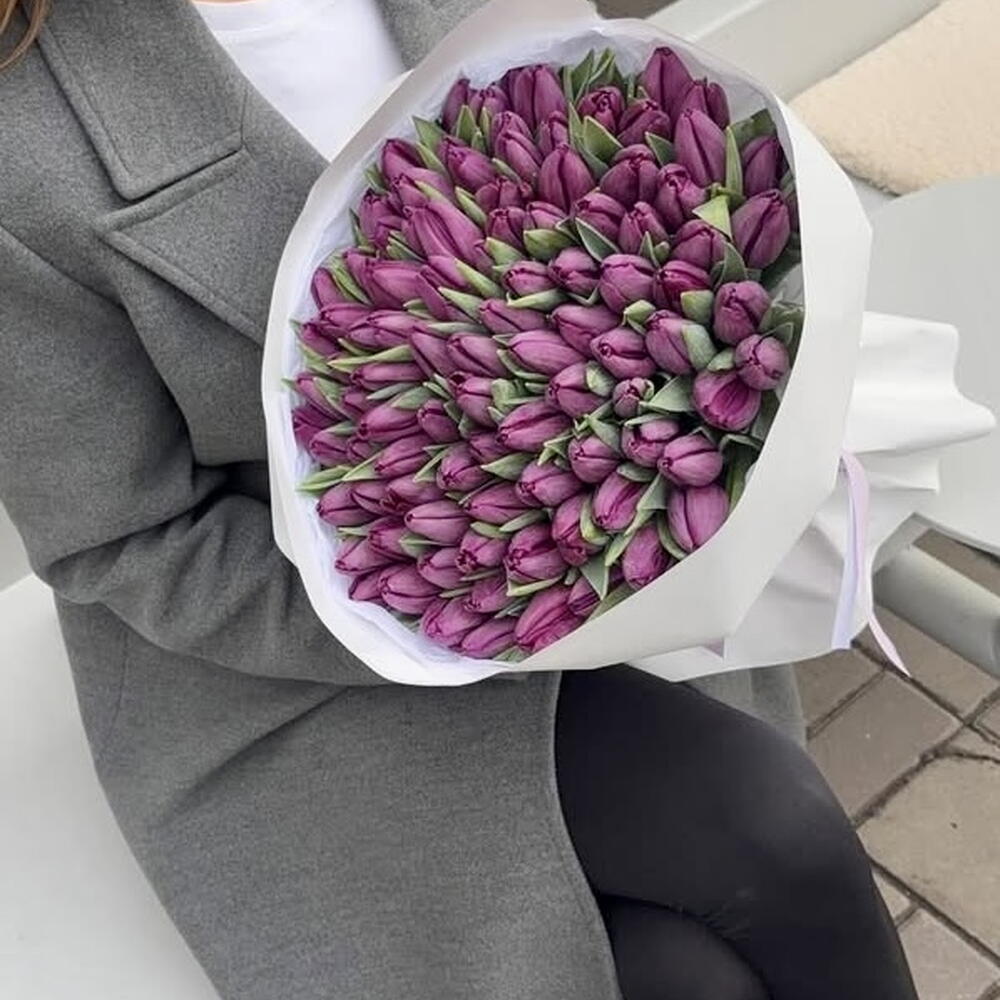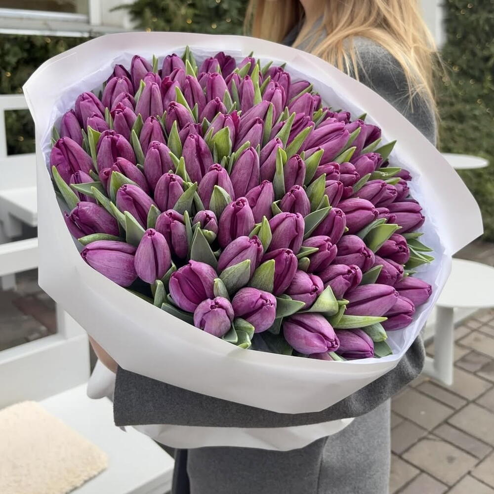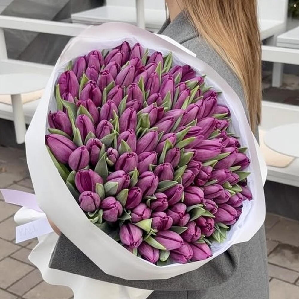 Пышный букет тюльпанов, фиолетовые тюльпаны, 101 шт