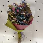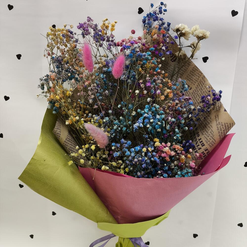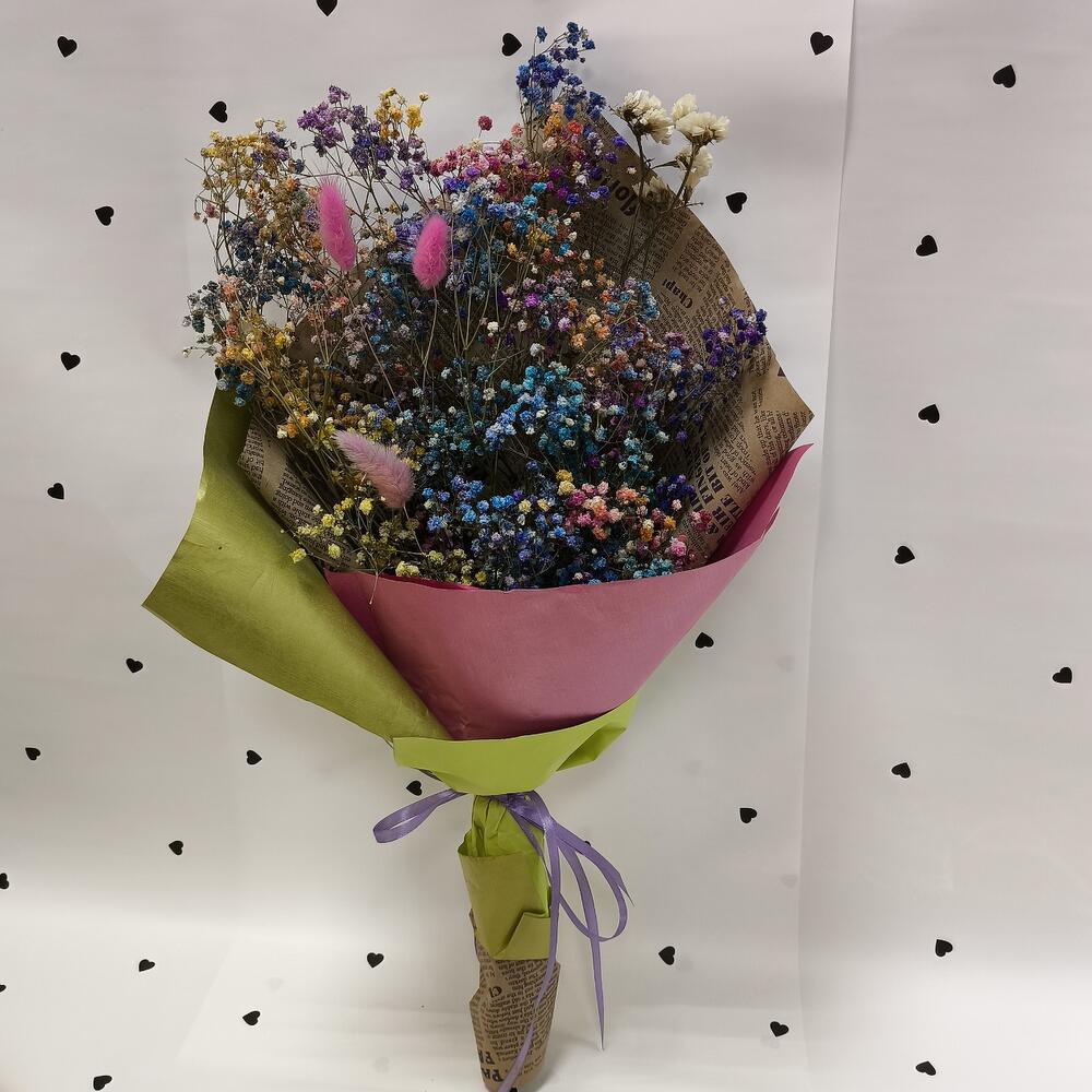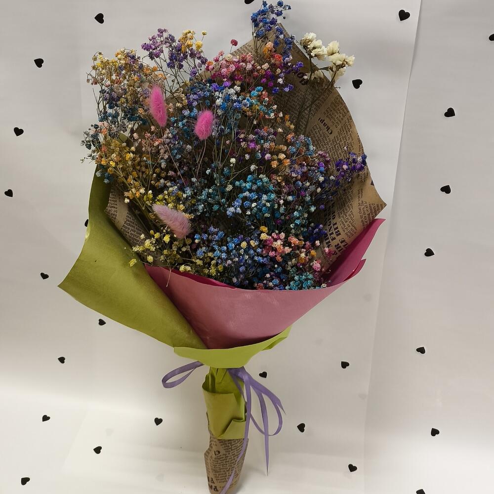 Статица - 1 шт. Лента атласная - 2 шт. Упаковка дизайнерская - 2 шт. Лагурус (сухоцвет) - 3 шт. гипсофила радужная - 5 шт.