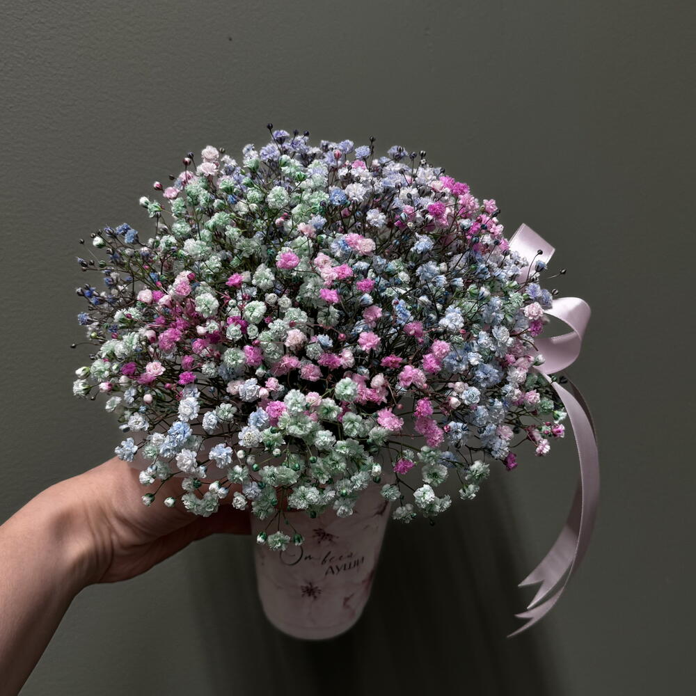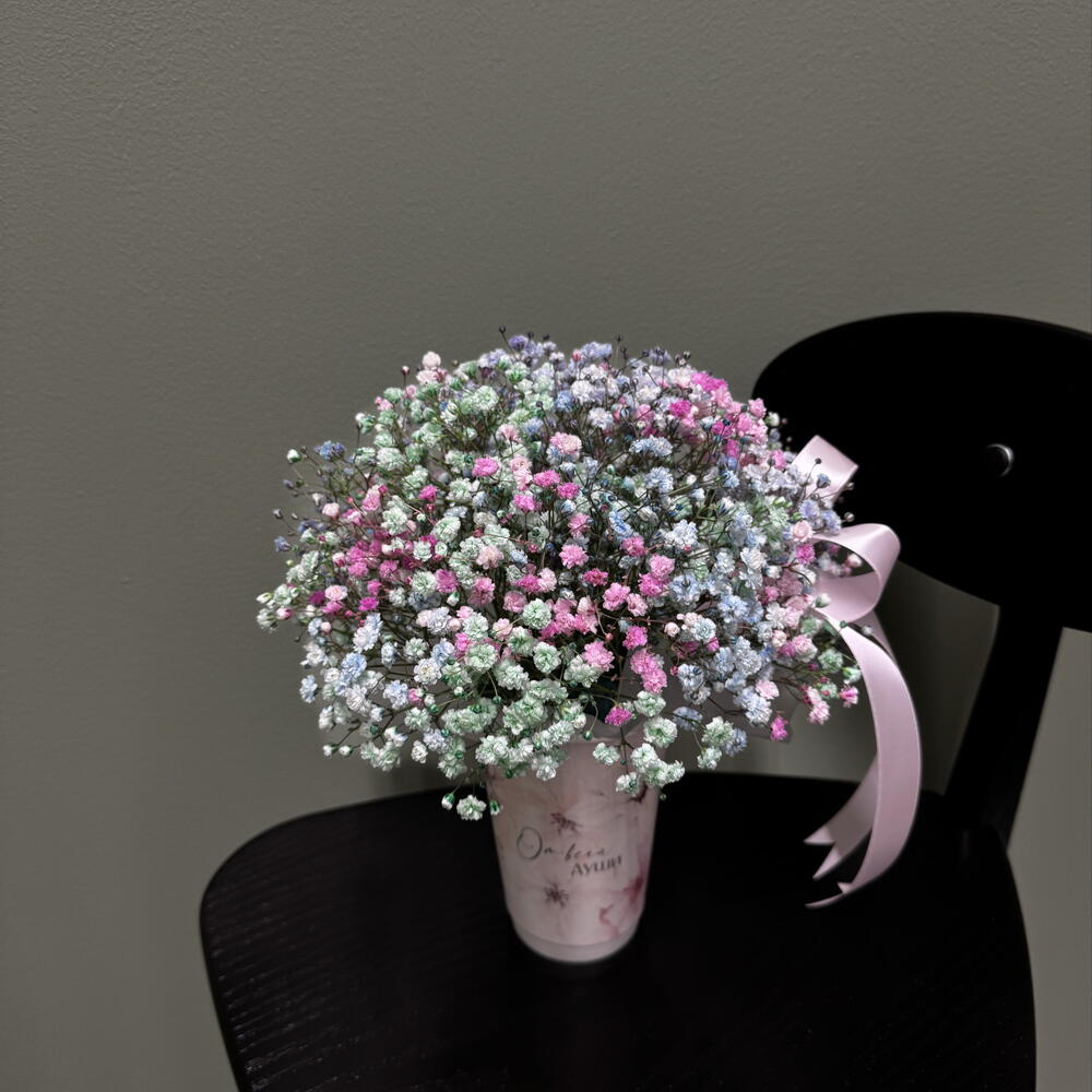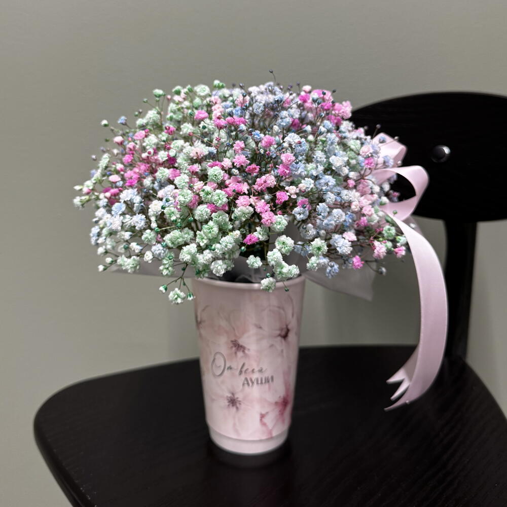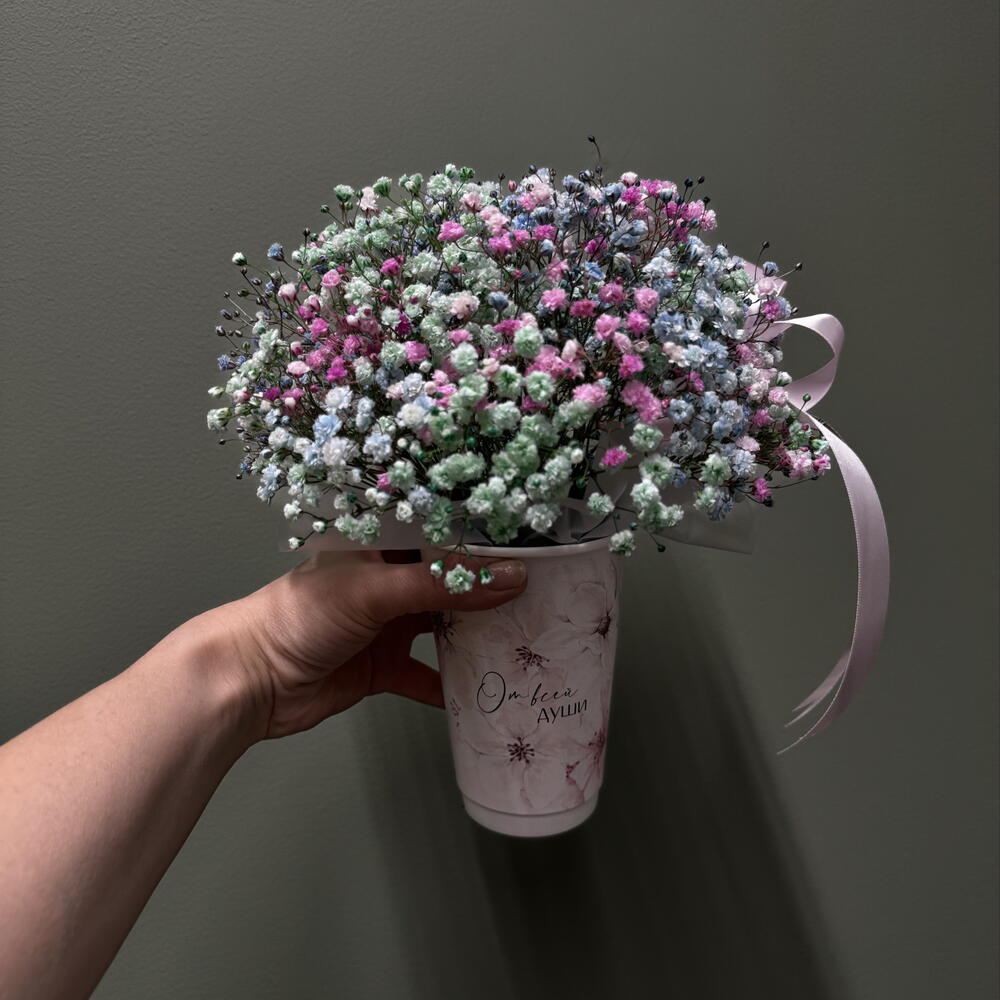 Крафт пакет - 1 шт. Оазис флористический - 1 шт. Стакан крафт дизайнерский - 1 шт. гипсофила краш. микс - 3 шт.