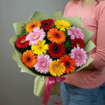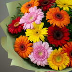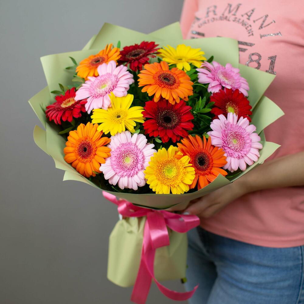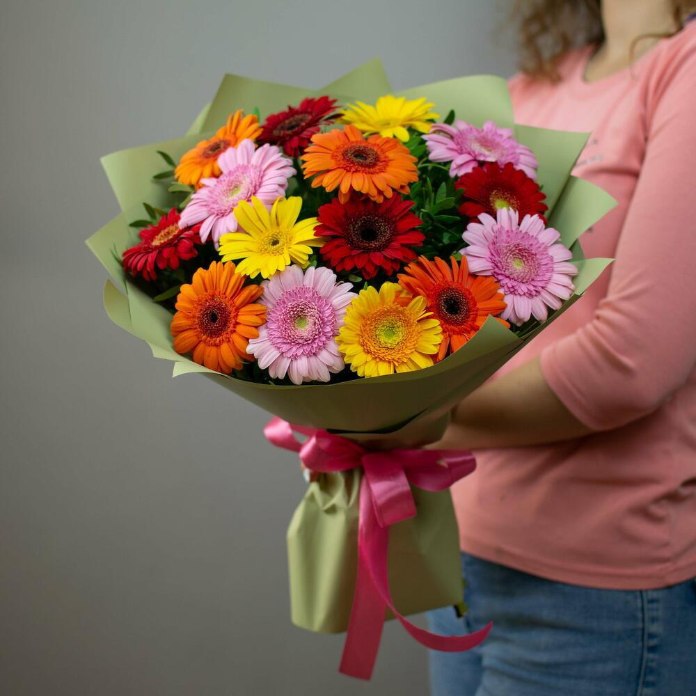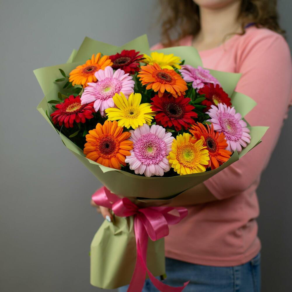 Атласная лента - 1 шт. Дизайнерская упаковка - 1 шт. зелень писташ - 3 шт. гербера мини микс - 15 шт.