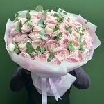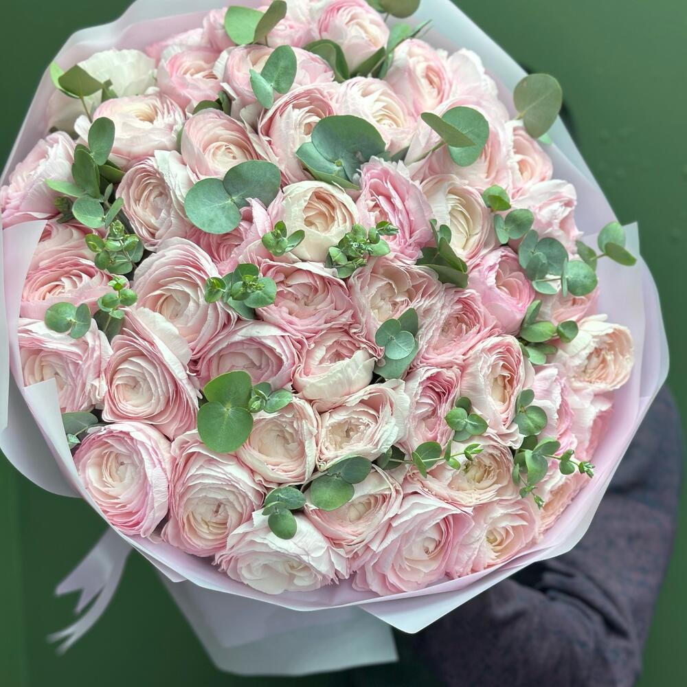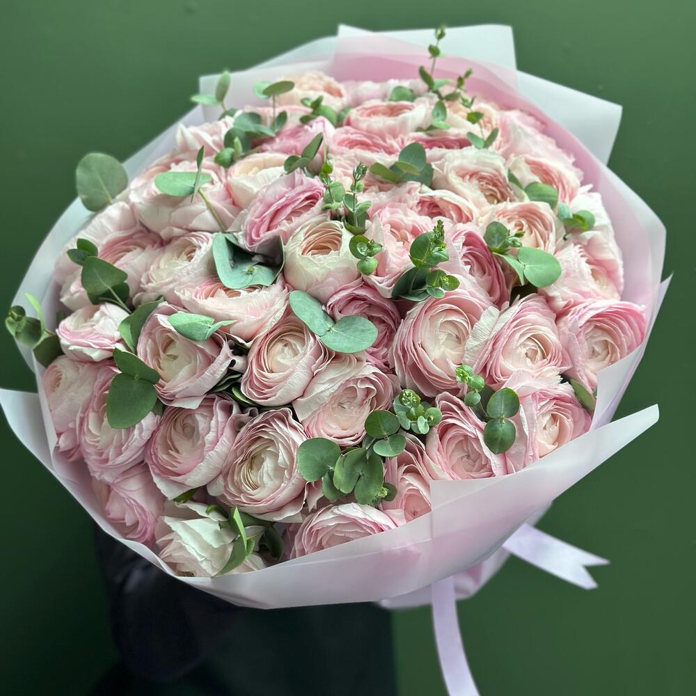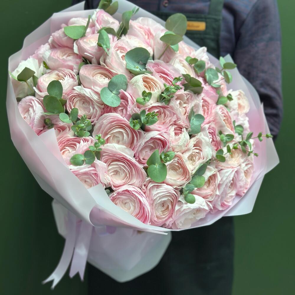 Лента атласная - 1 шт. Ранункулюс - 51 шт. Упаковка дизайнерская - 5 шт.