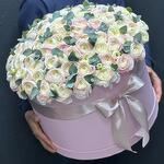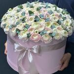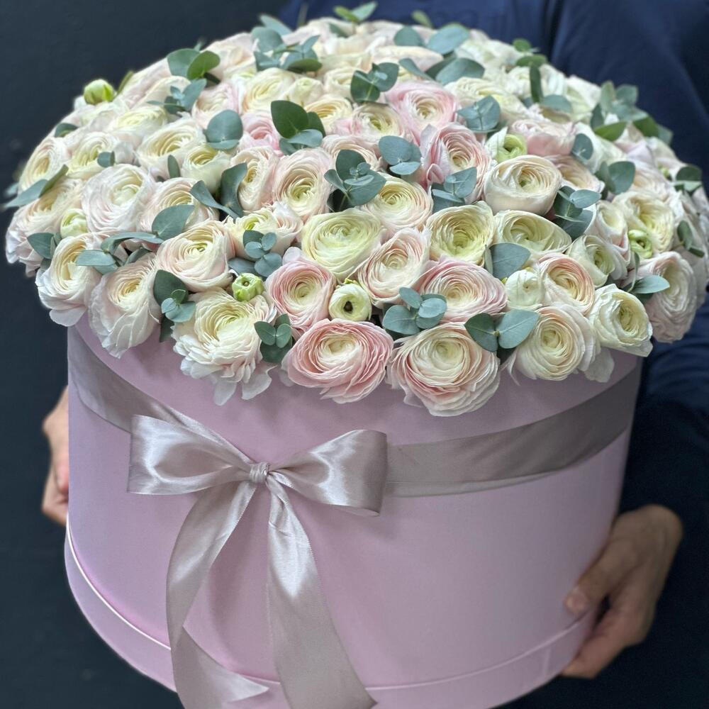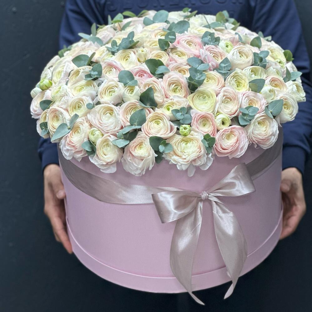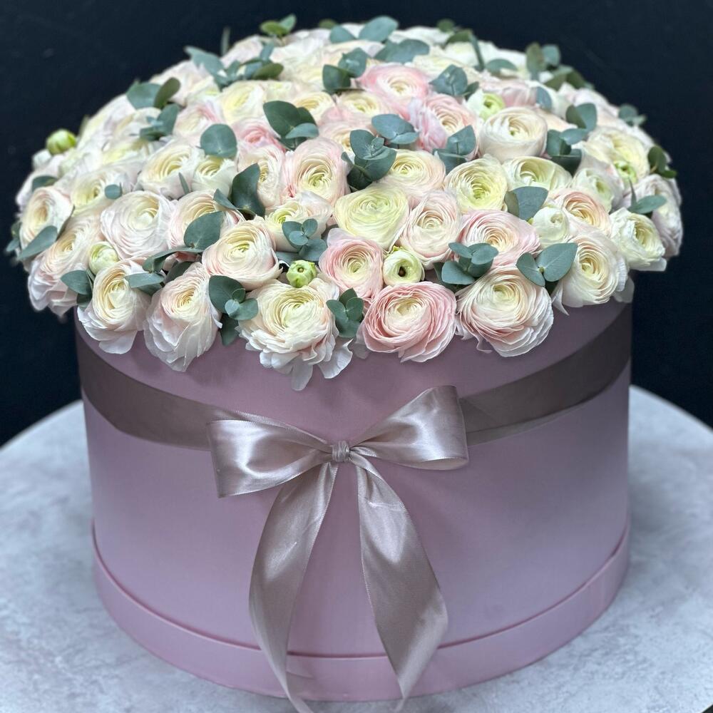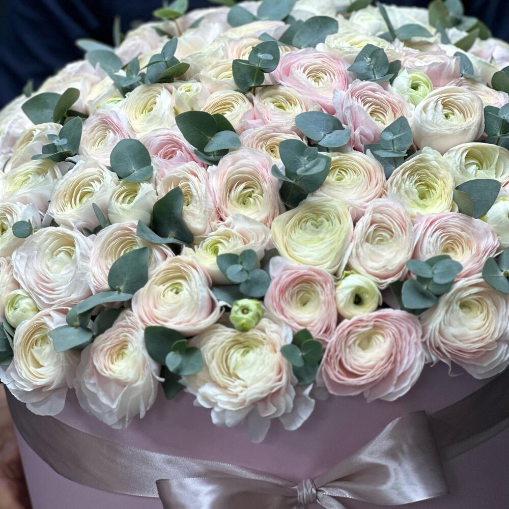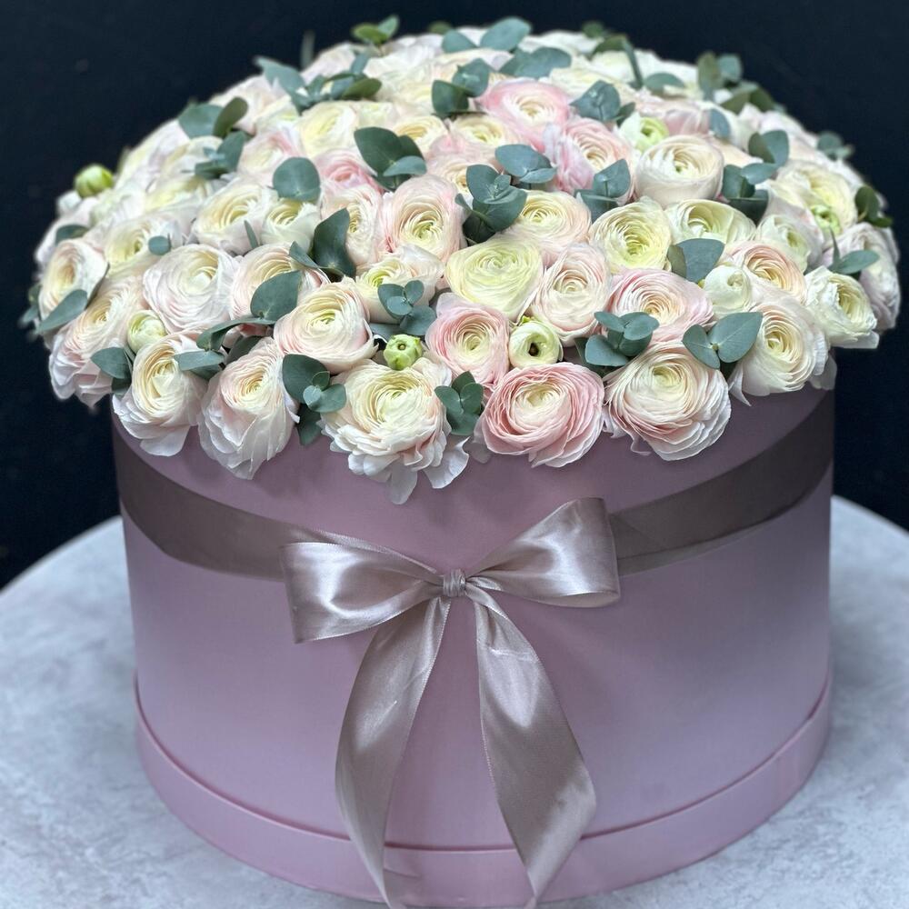 Лента атласная - 1 шт. Шляпная коробка - 1 шт. Ранункулюс - 101 шт. Губка флористическая - 5 шт.