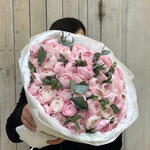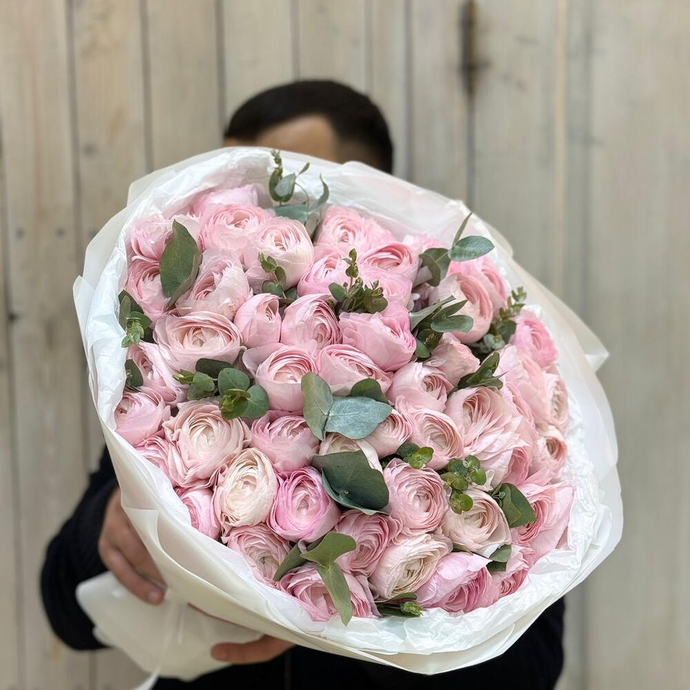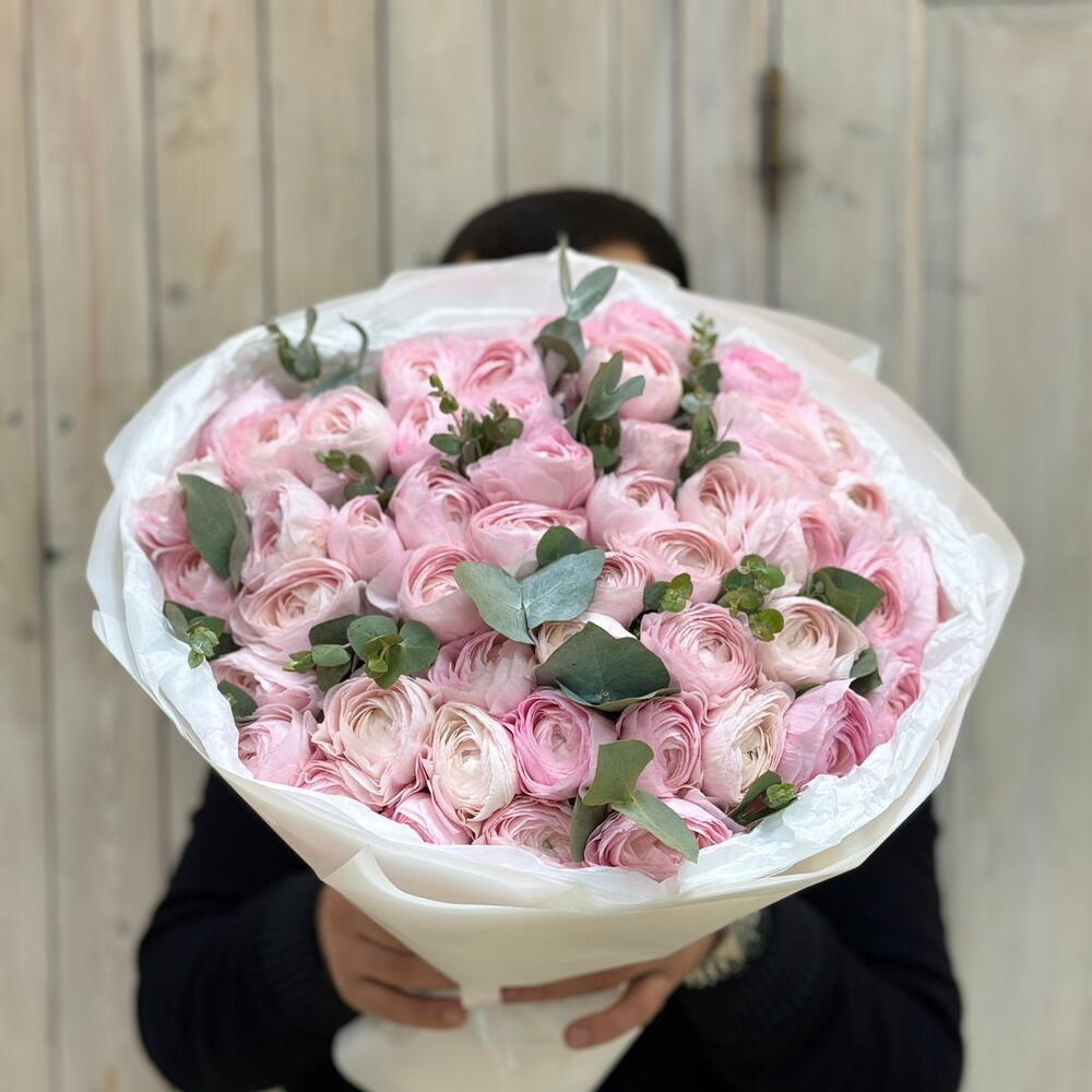 Эвкалипт - 10 шт. Лента атласная - 1 шт. Ранункулюс - 51 шт. Упаковка дизайнерская - 6 шт.
