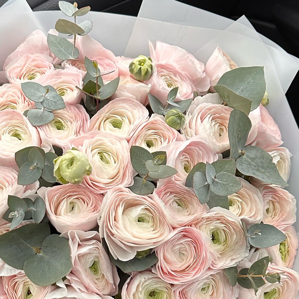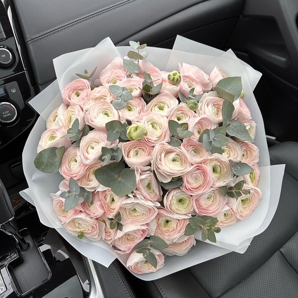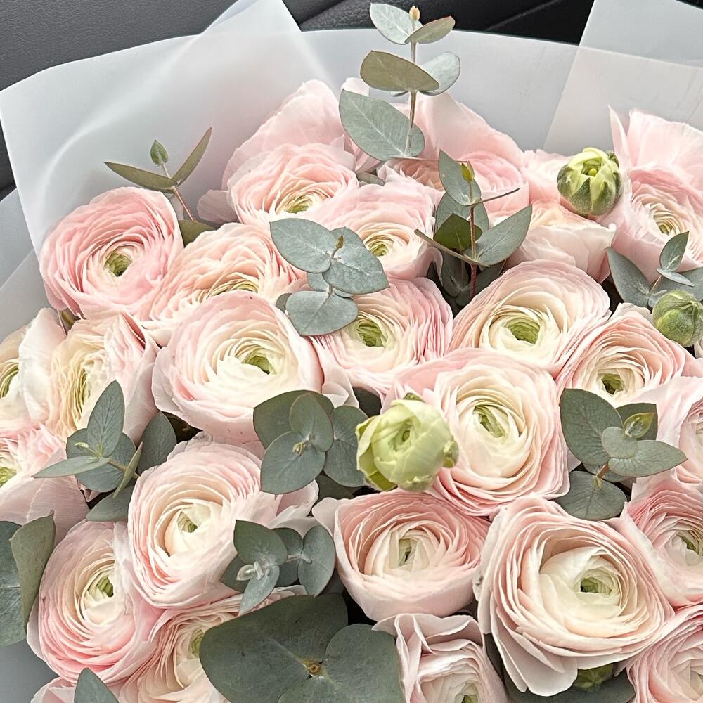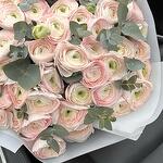 Лента атласная - 1 шт. Упаковка дизайнерская - 1 шт. Ранункулюс ханой - 51 шт.