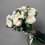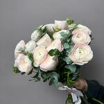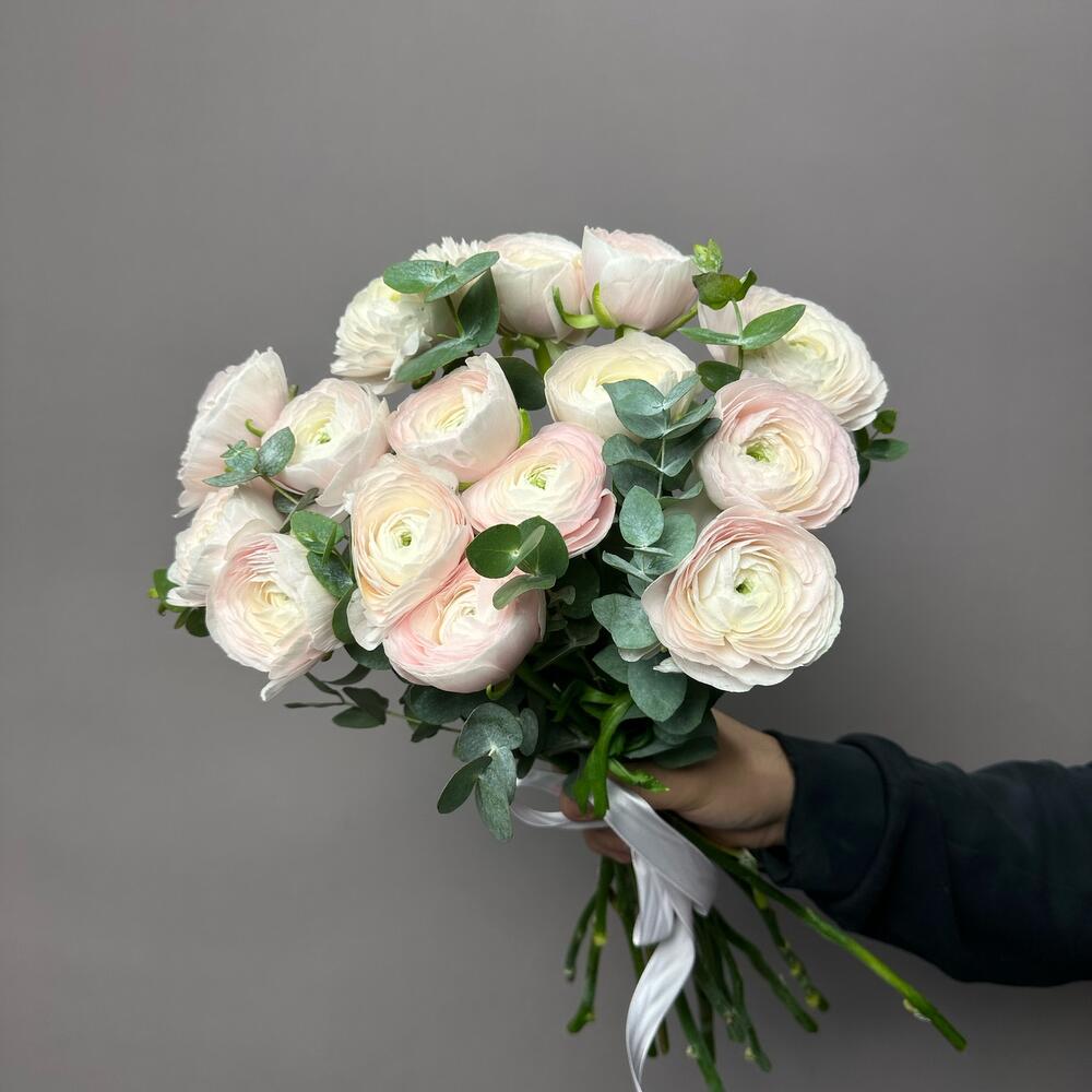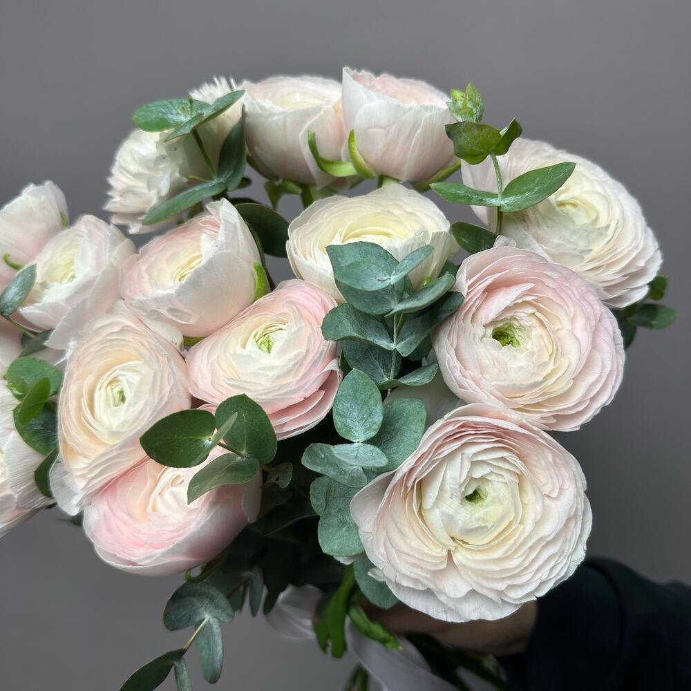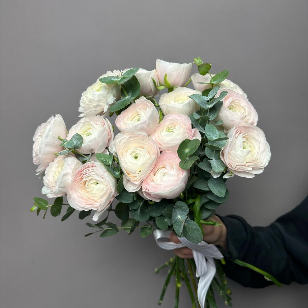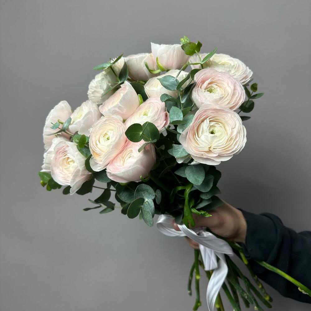 Эвкалипт - 10 шт. Лента атласная - 4 шт. Ранункулюс ханой - 15 шт.