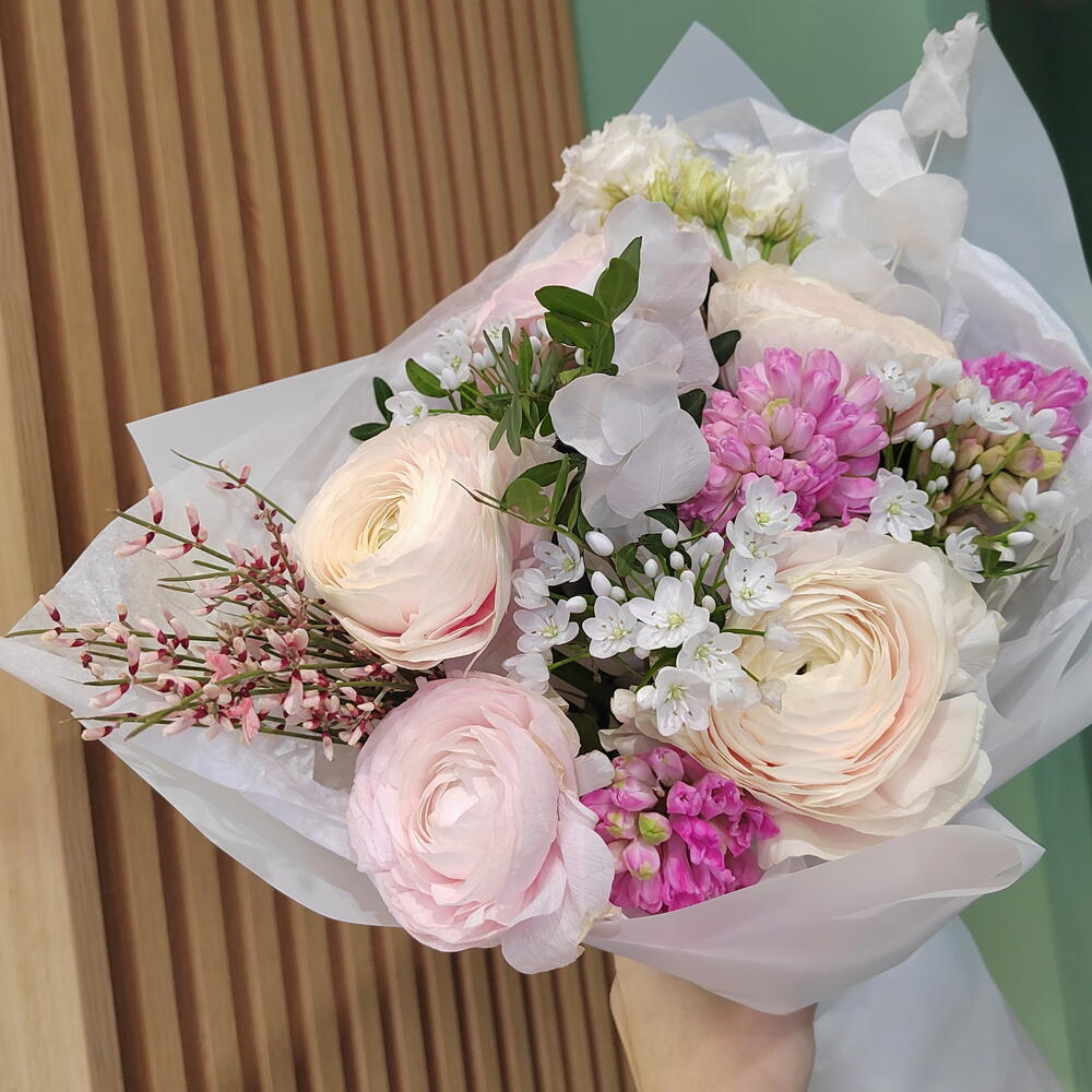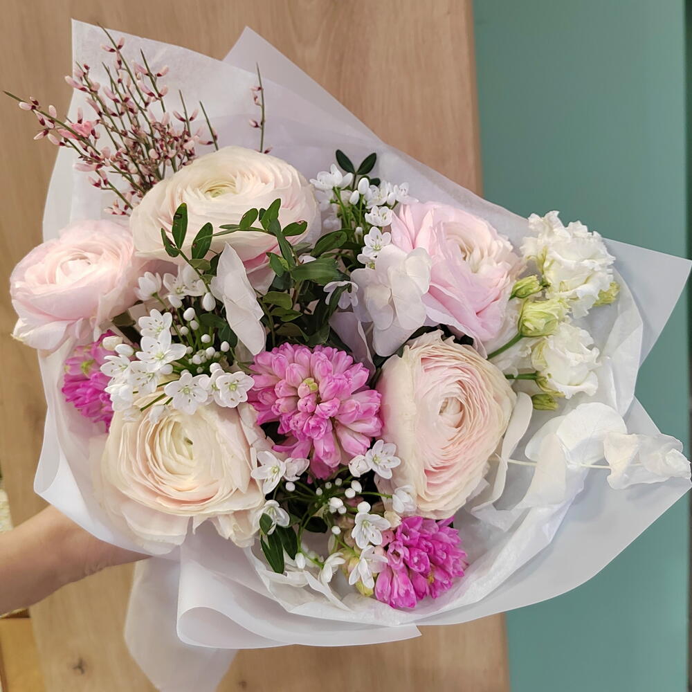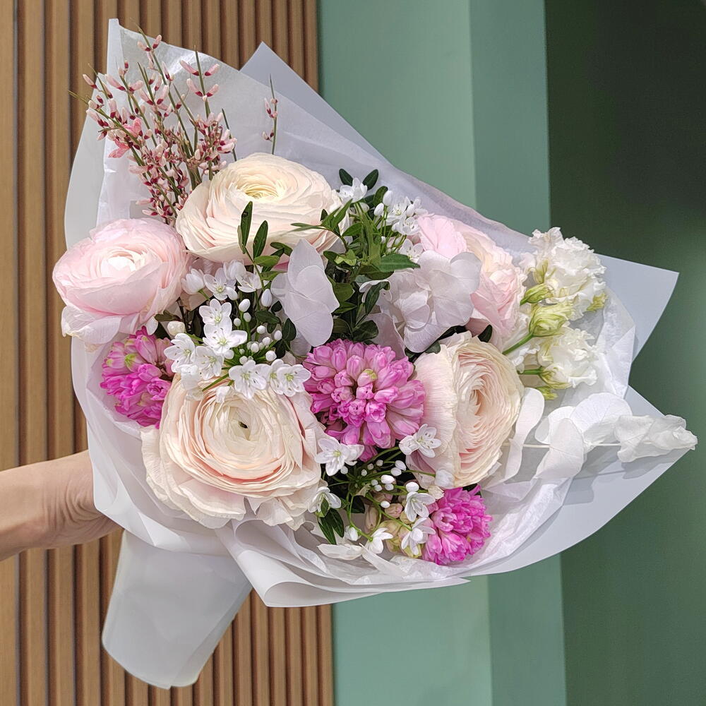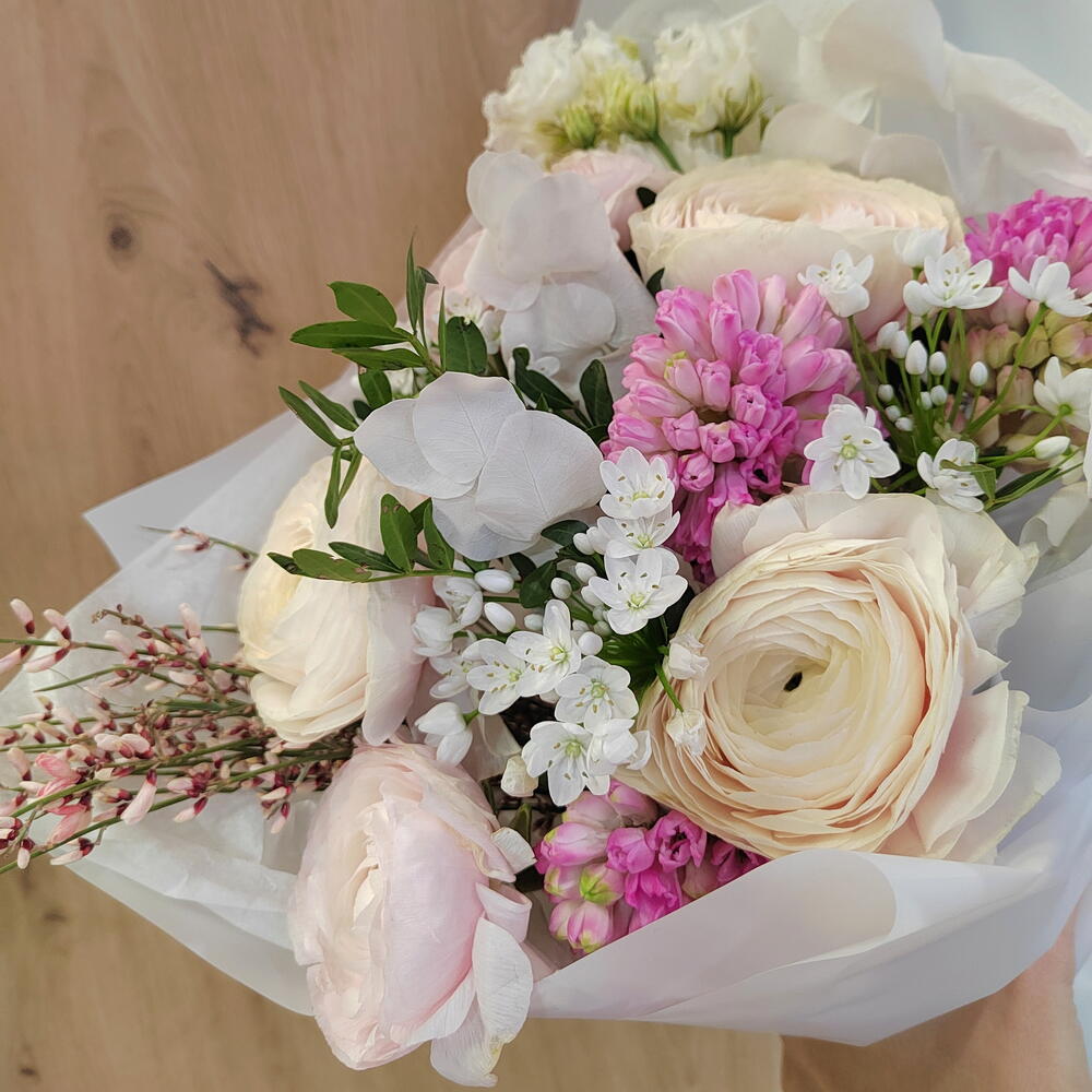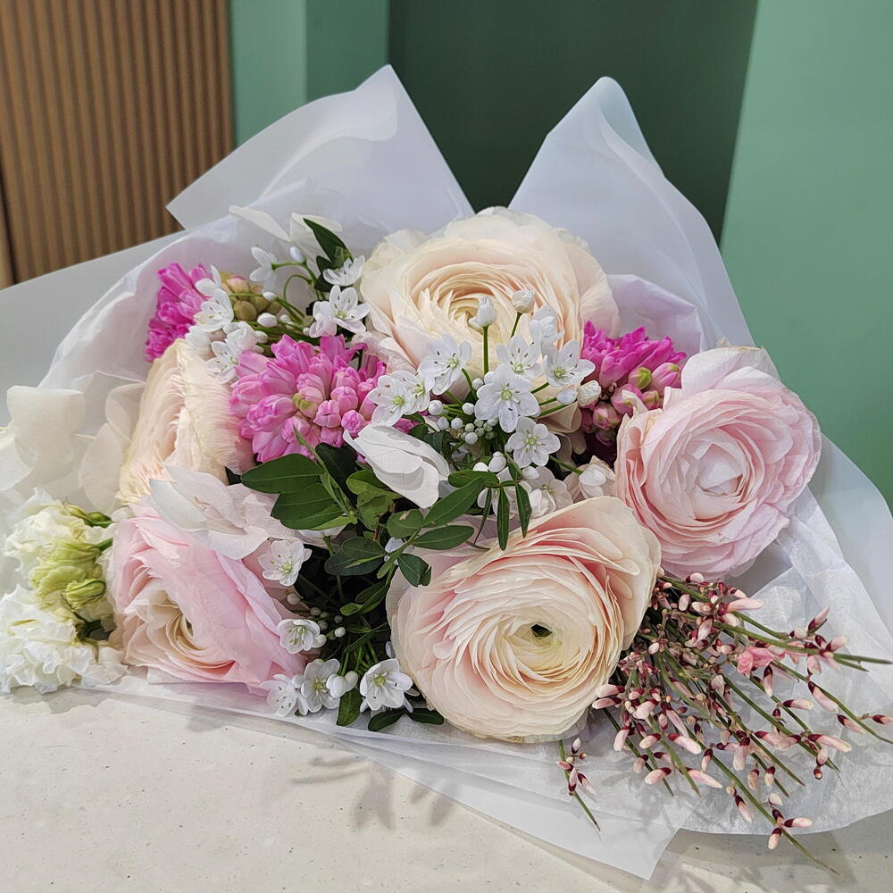 Ранункулюсы, гиацинты, аллиум, "МонАмур" букет из весенних цветов 8 марта