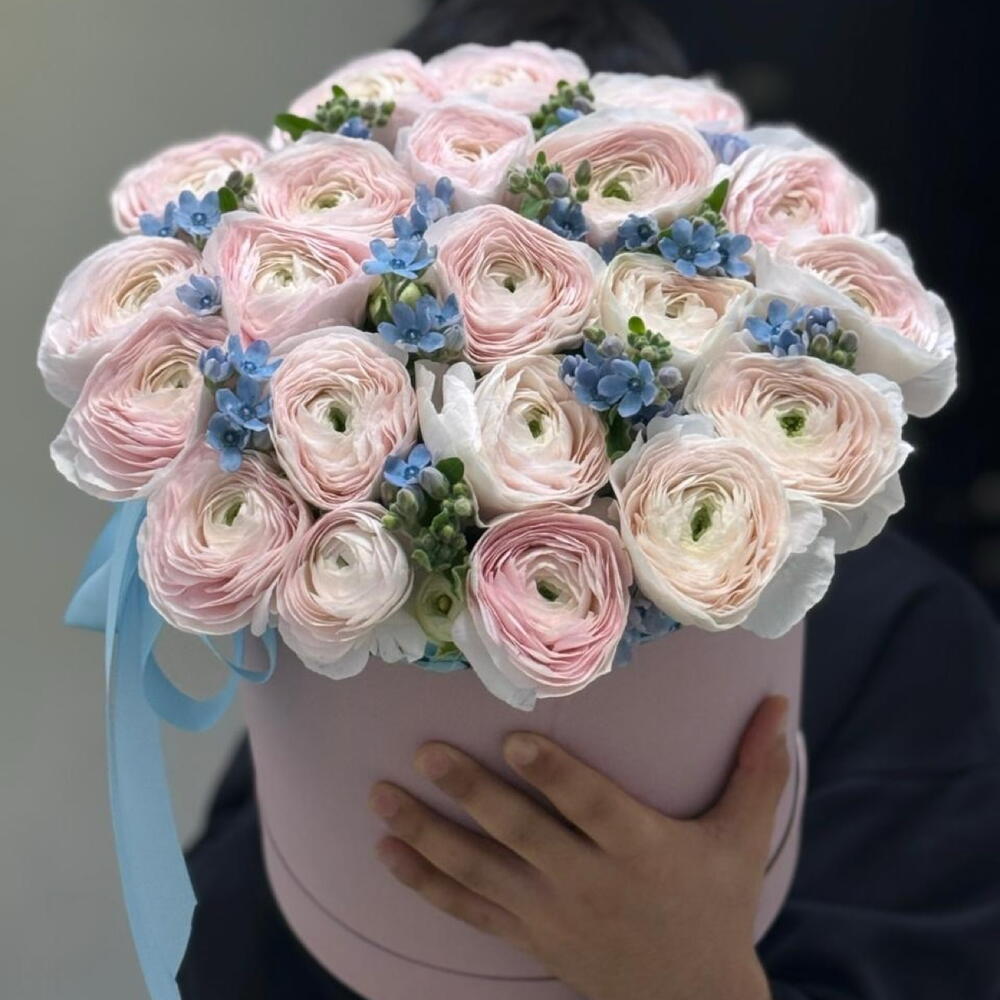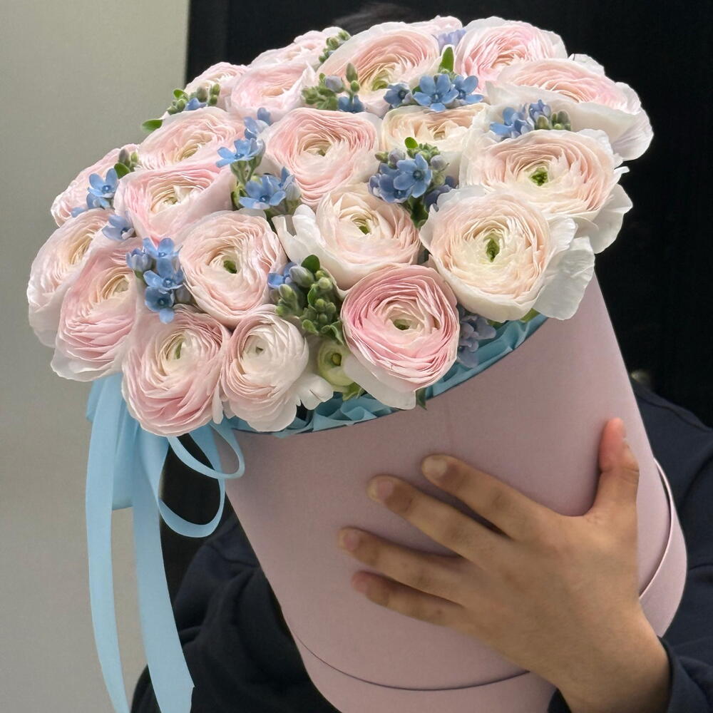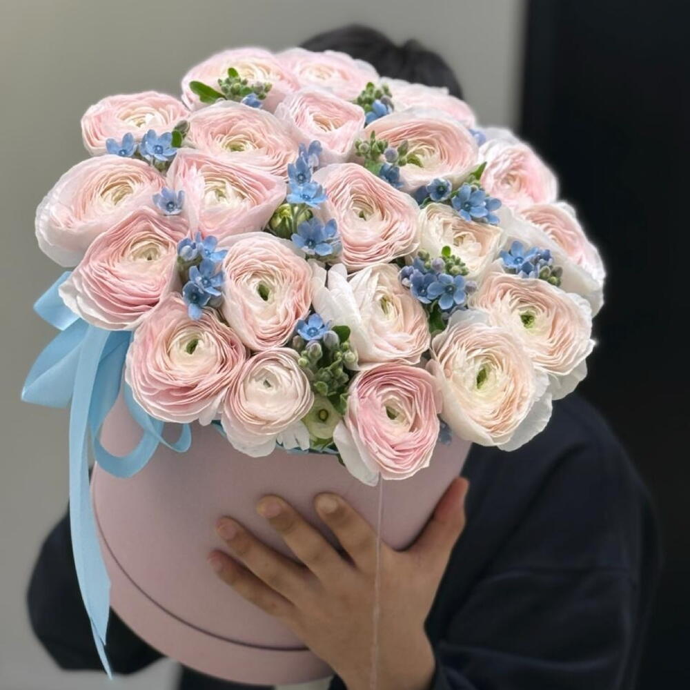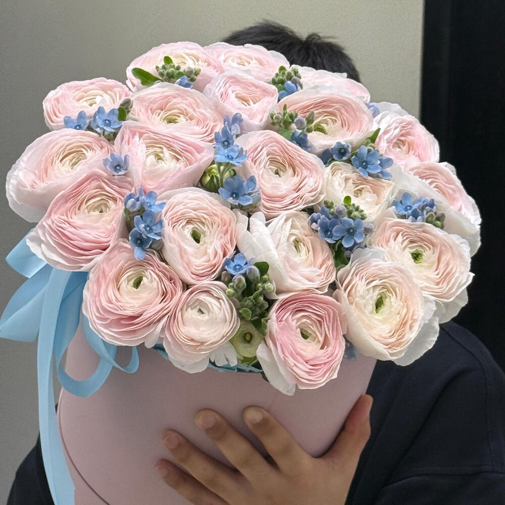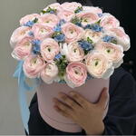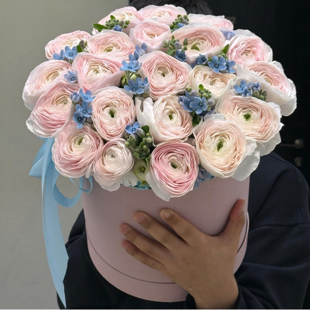 Лента атласная - 1 шт. Коробка шляпная - 1 шт. Ранункулюс - 19 шт. Оксипеталум - 10 шт. Оазис флористический - 1 шт. Дизайнерское оформление - 1 шт. букетная записка - 1 шт.