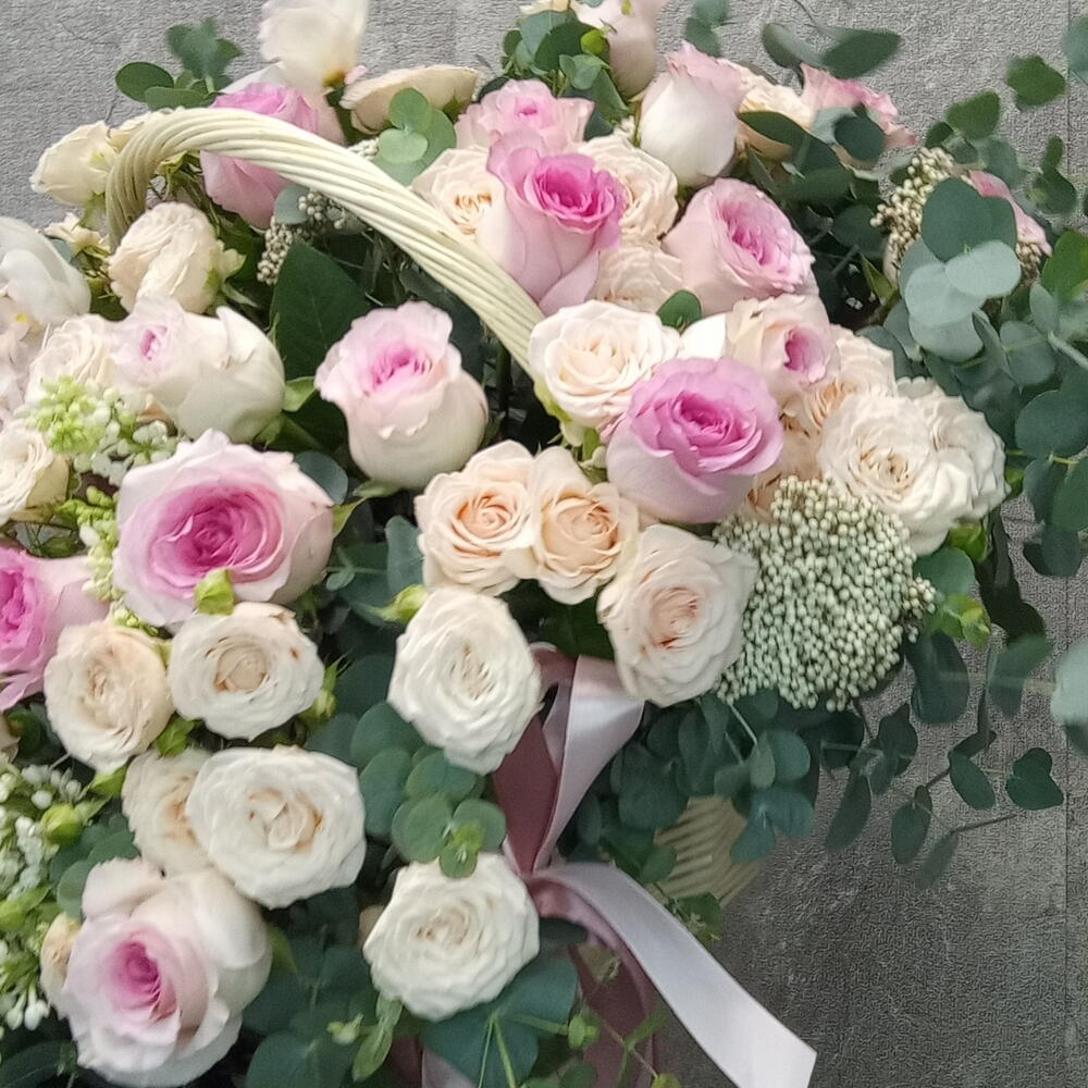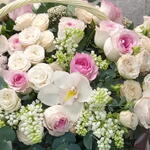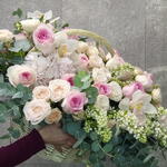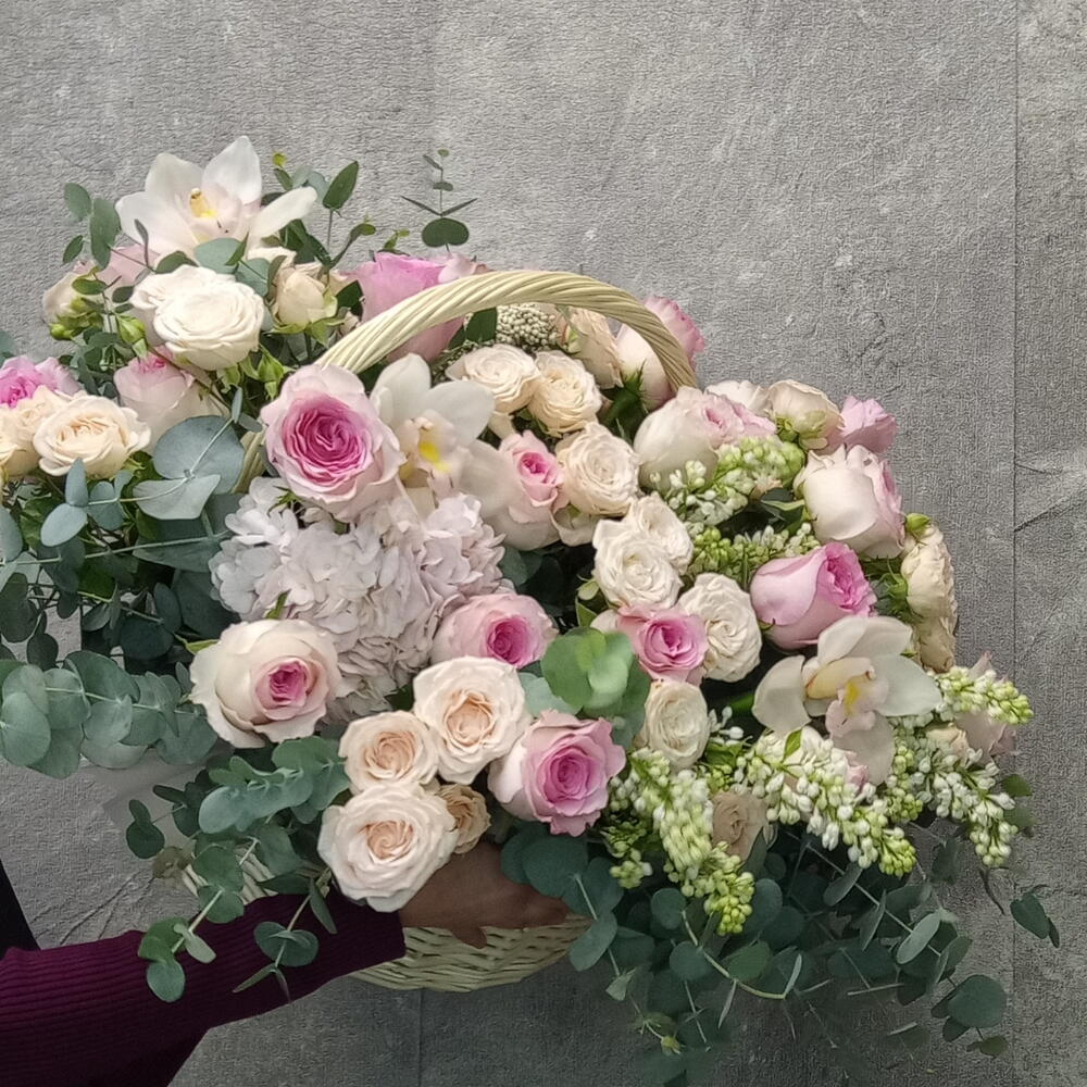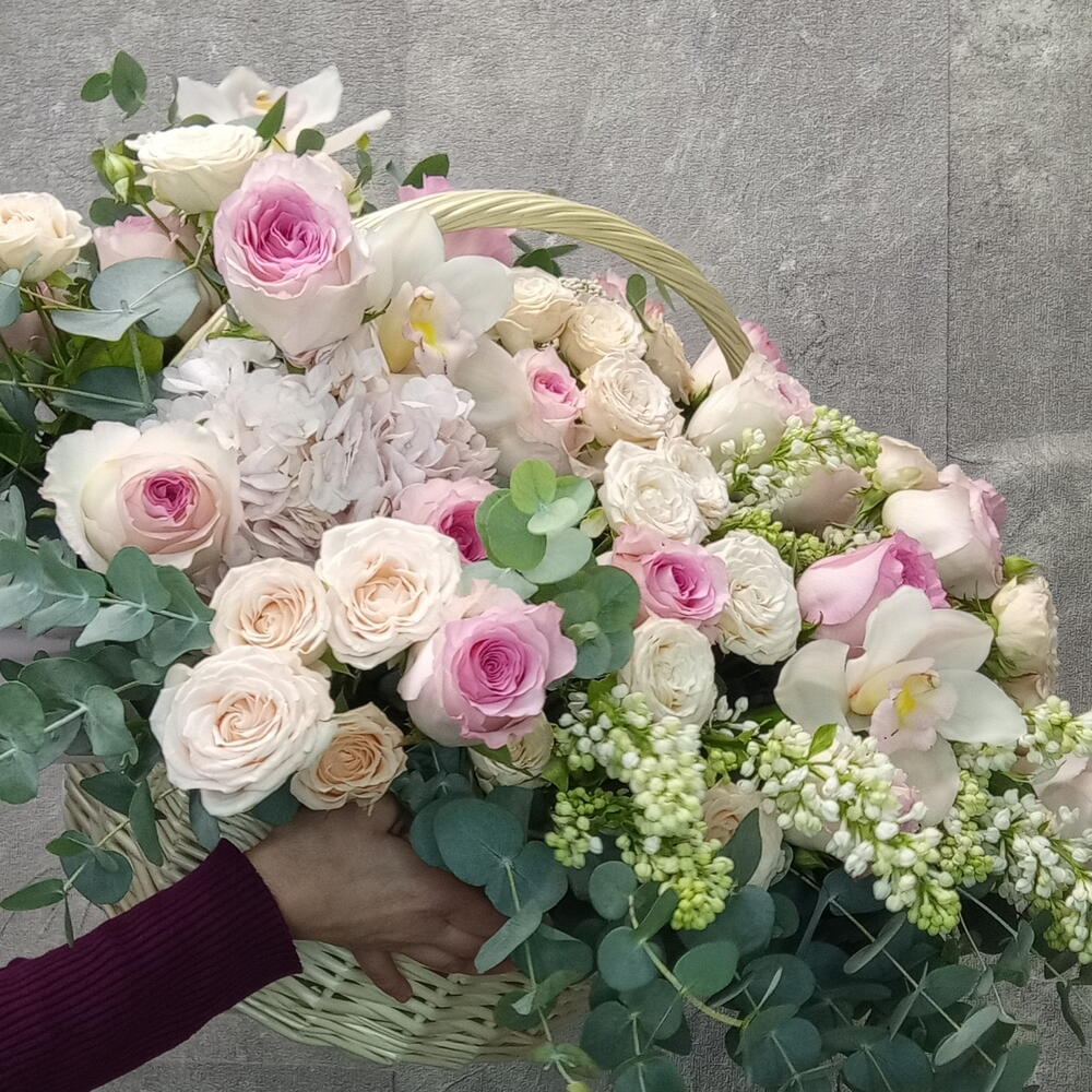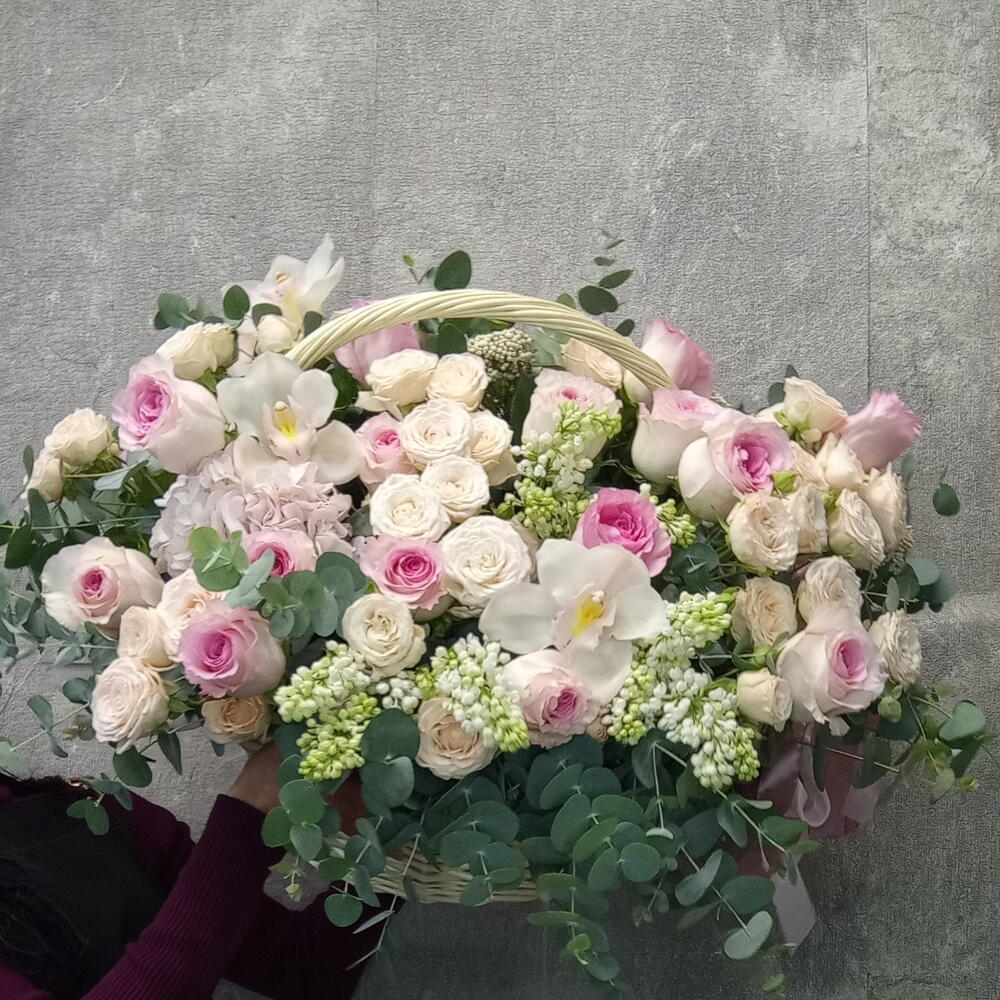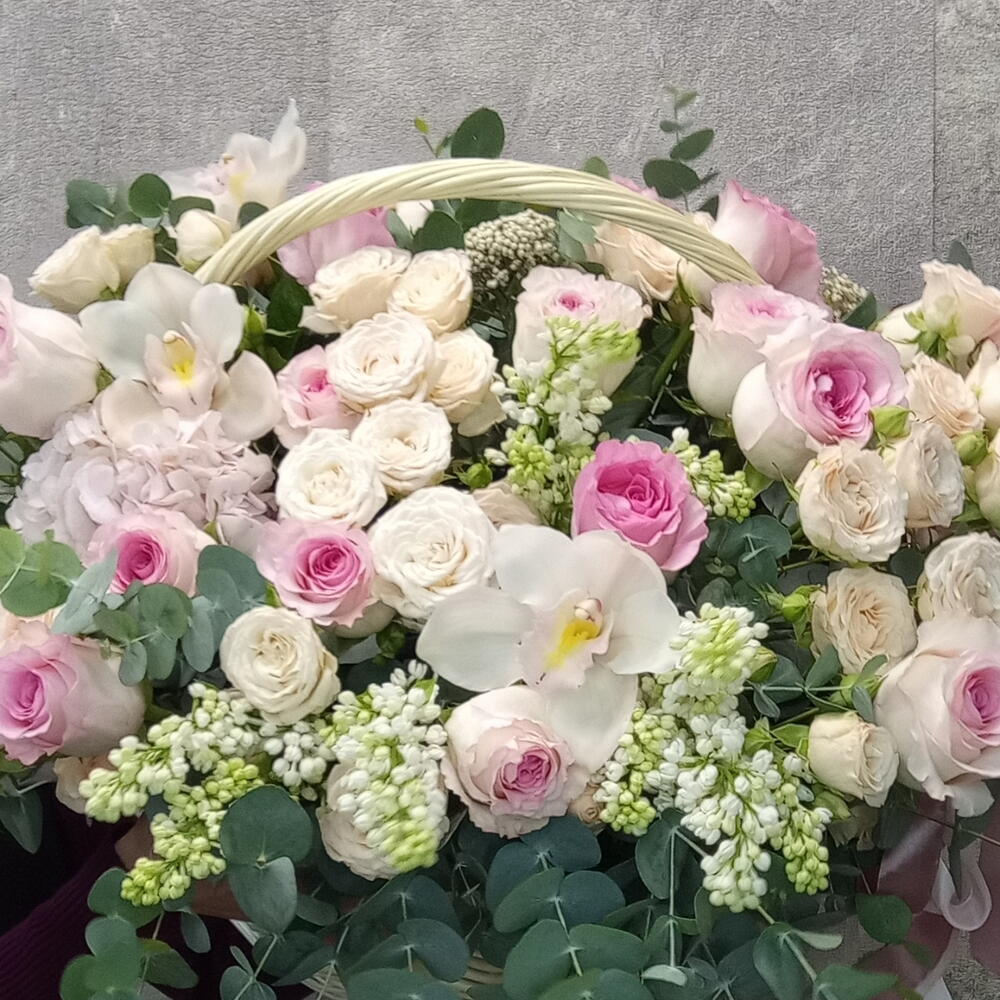 Роскошная Корзина Цветов- это щедрая корзина – настоящее воплощение весенней сказки и изысканной элегантности. Нежно-розовые розы, словно утренний рассвет, сочетаются с воздушной белой сиренью, наполняя воздух тонким ароматом. Пышная гортензия добавляет объема и воздушности, а утонченные белые орхидеи привносят нотку экзотики и роскоши. Легкие веточки озатамуса и свежий эвкалипт завершают композицию, придавая ей завершенность и естественную грацию. **Кому подойдет:Этот величественный букет в корзине – идеальный подарок для выражения глубоких чувств, признательности и восхищения. Он подойдёт для Мамы, бабушки, жены, любимых женщин.Официальных мероприятий, для создания атмосферы. Такая корзина будет радовать до 14 дней, при поливе флористической губке внутри через 1-2 дня и при умеренной температуре в помещении. На доставку бережно упаковываем🤗