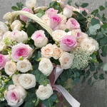Озотамнус - 3 шт. Орхидея Цимбидиум - 3 шт. Роза кустовая - 10 шт. Роза Эквадор - 25 шт. Сирень белая - 3 шт. Эвкалипт пучок - 1 шт. Корзина плетеная большая - 1 шт. Оазис флористический - 4 шт.
