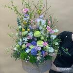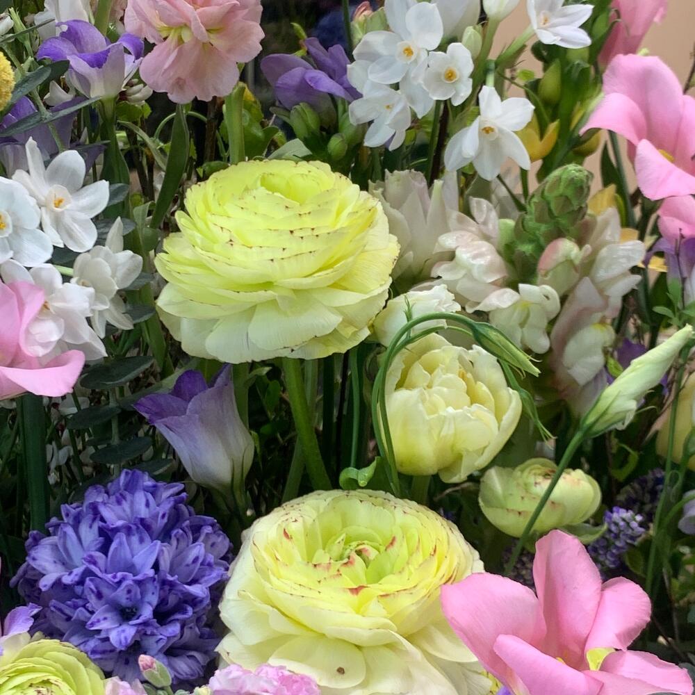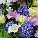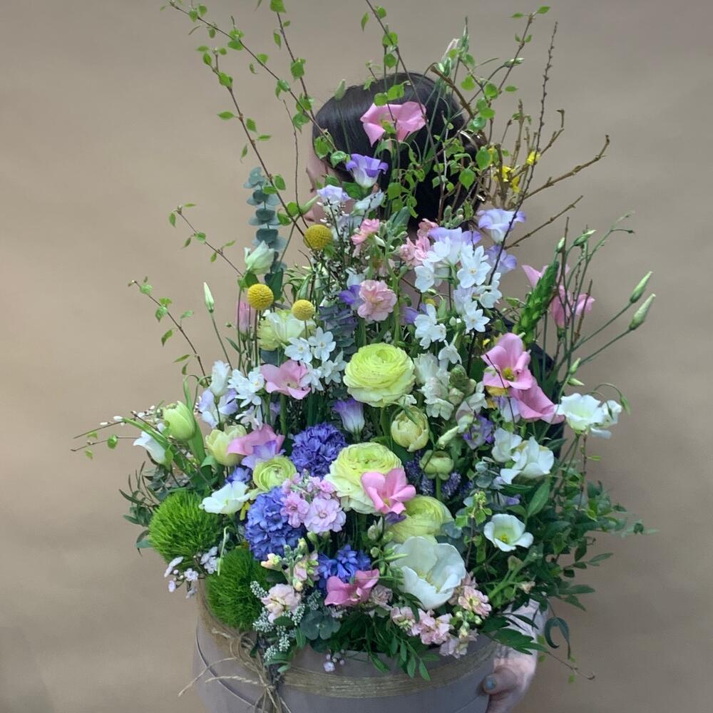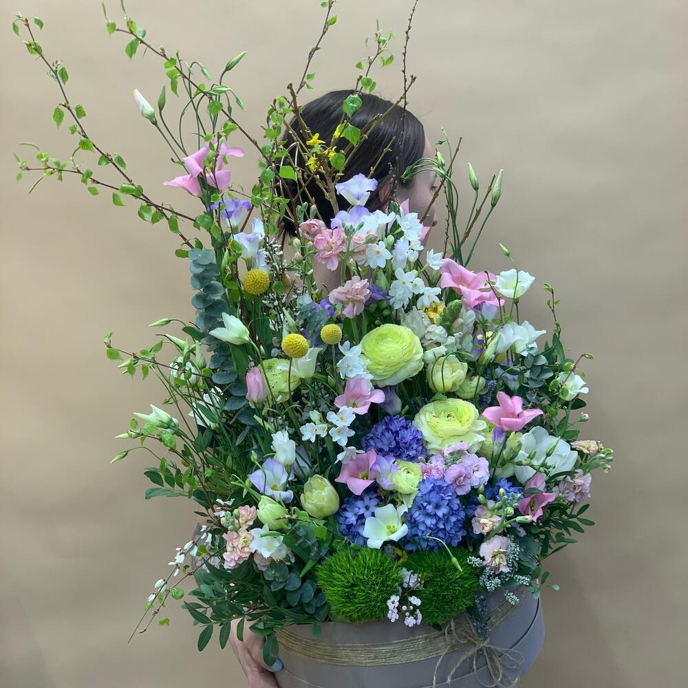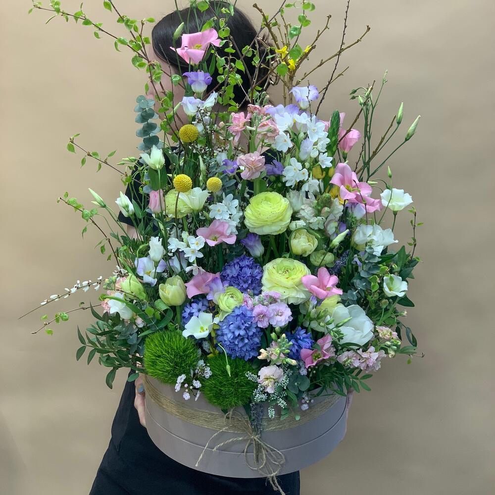 Гиацинт - 4 шт. Краспедия - 3 шт. Лизиантус - 4 шт. Маттиола - 2 шт. Нарцисс - 4 шт. Тюльпан - 4 шт. Орнитогалум - 1 шт. Коробка шляпная - 1 шт. Ранункулюс - 4 шт. Форзиция - 1 шт. зелень декоративная - 10 шт. барбадос - 2 шт. декор натуральный лаванда - 1 шт. вечерника - 2 шт.