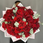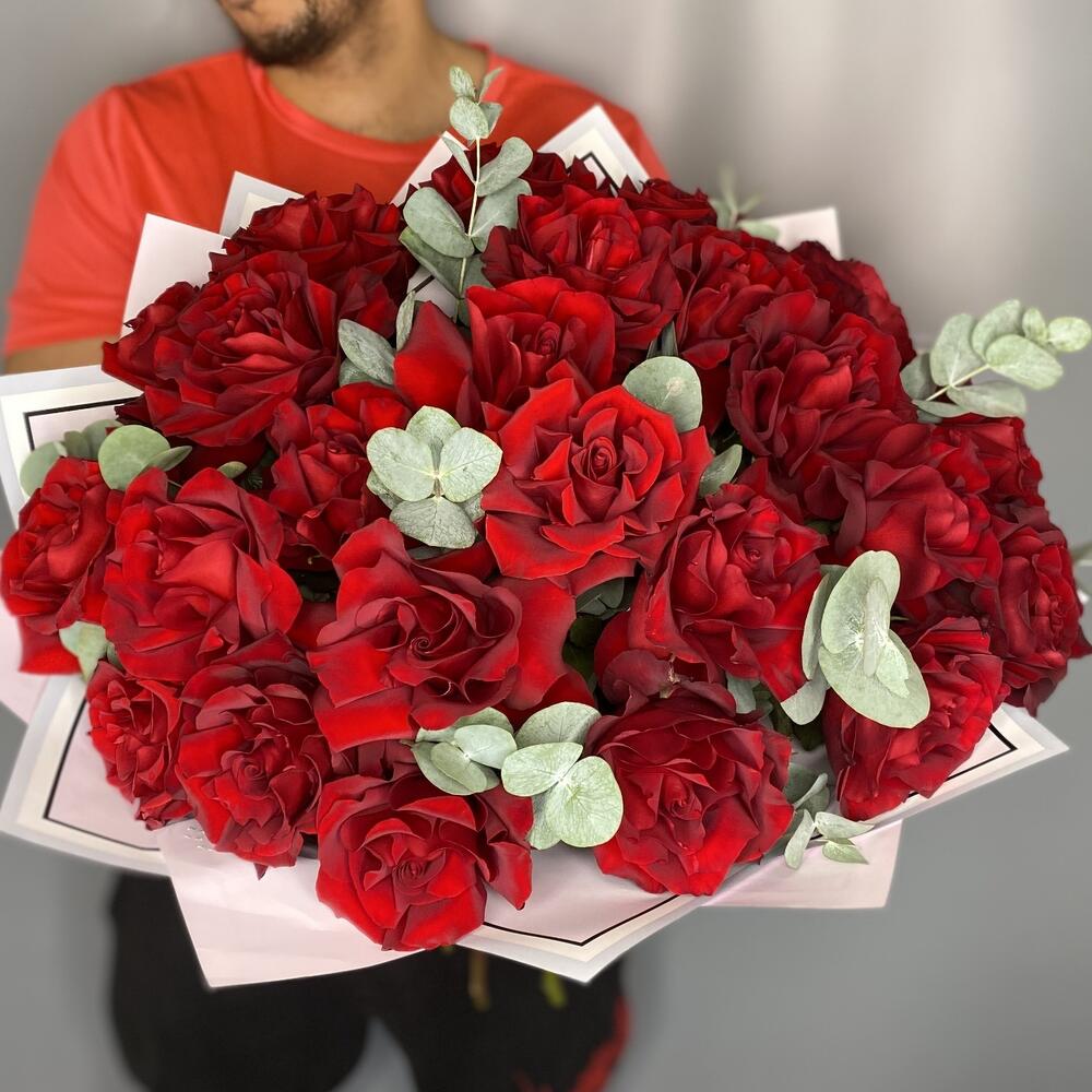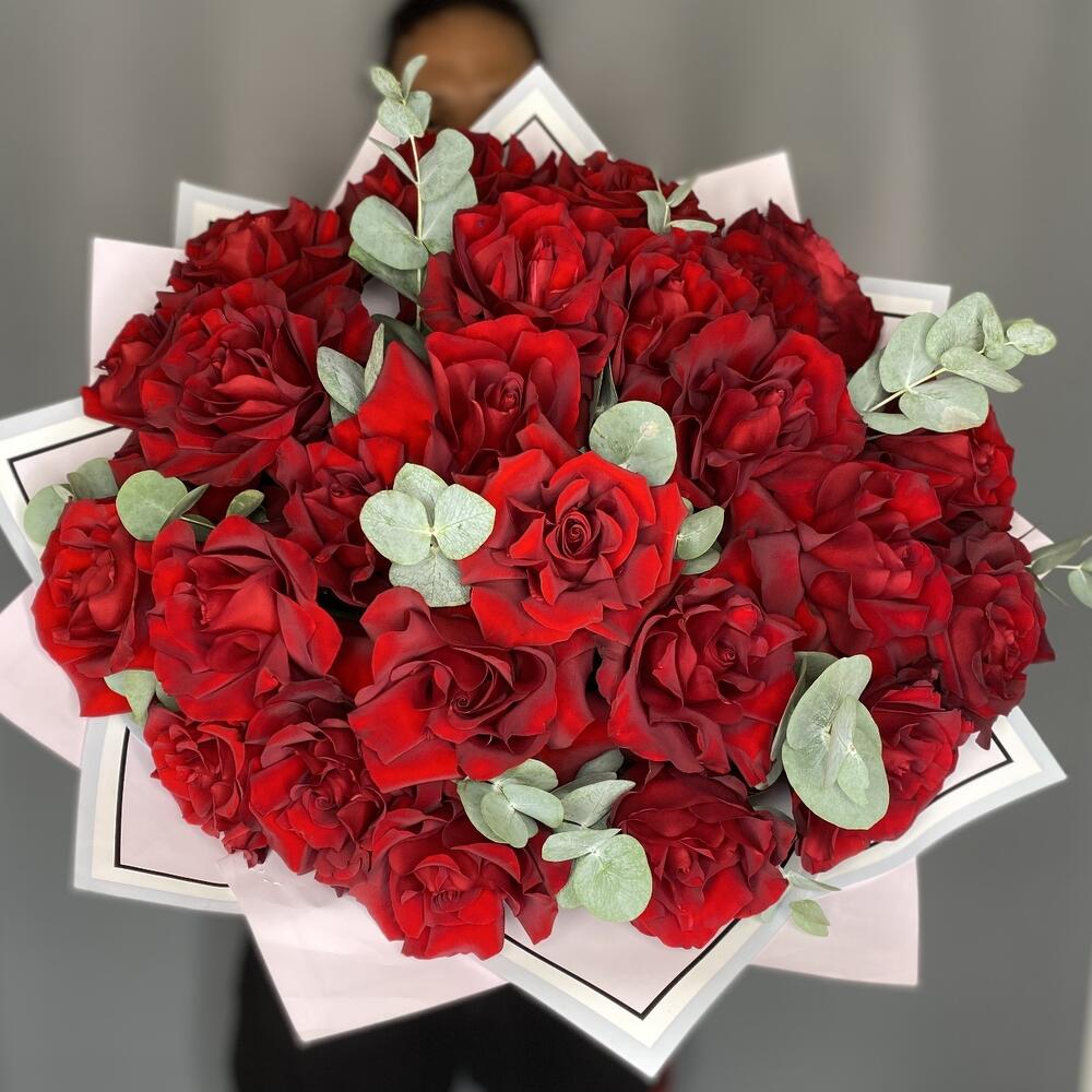 Эвкалипт - 1 шт. Лента атласная - 1 шт. Упаковка дизайнерская - 1 шт. роза французская красная - 25 шт.