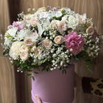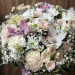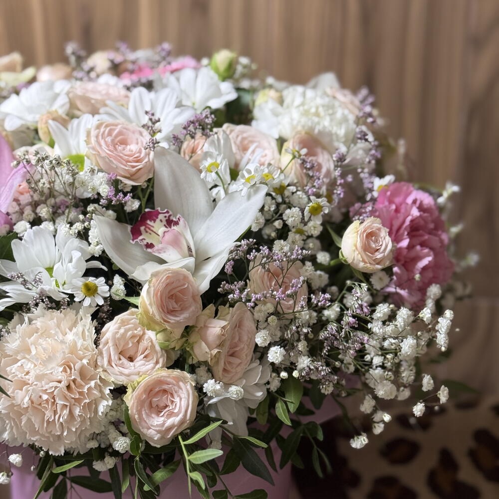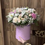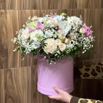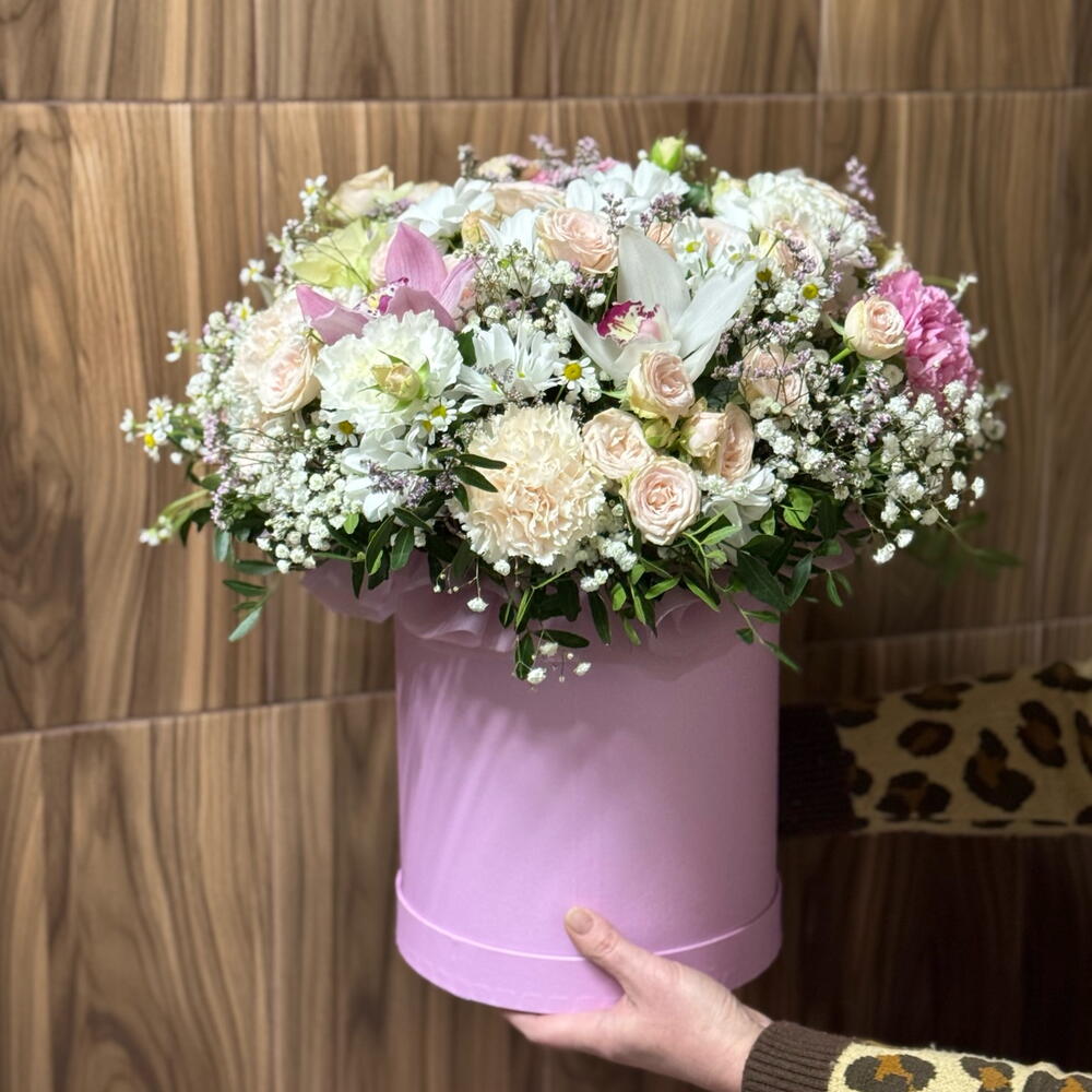 Гипсофила - 6 шт. Лимониум - 3 шт. Писташ - 5 шт. Роза кустовая - 5 шт. Хризантема кустовая - 2 шт. Коробка шляпная - 1 шт. Орхидеи - 4 шт. гвоздики - 6 шт.