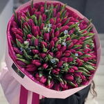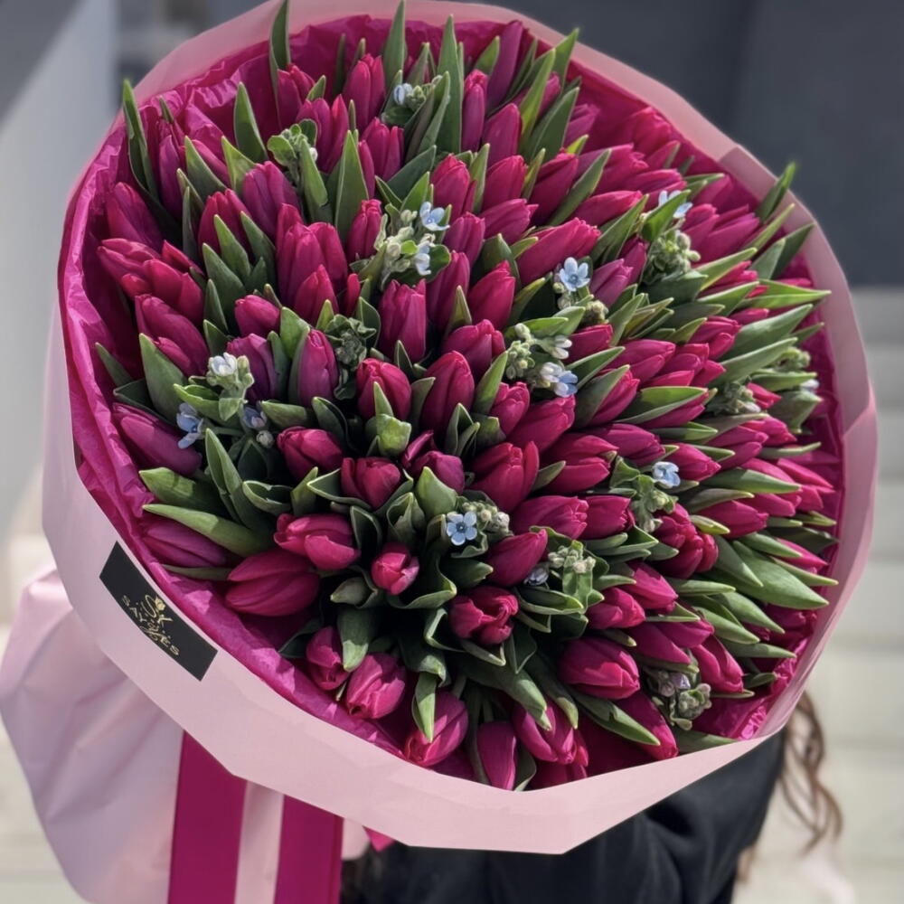 Тюльпан - 101 шт. Лента атласная - 1 шт. Оксипеталум - 10 шт. Упаковка дизайнерская - 2 шт.