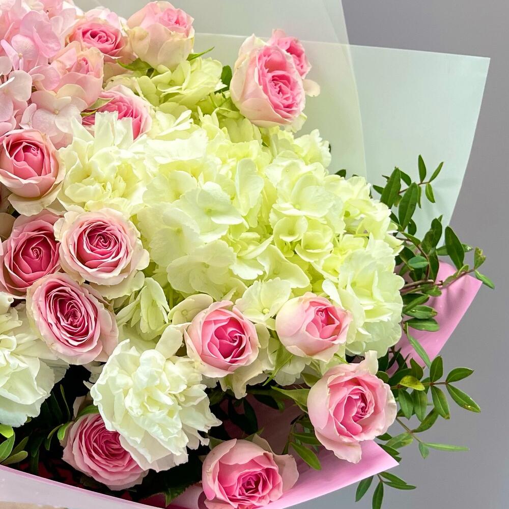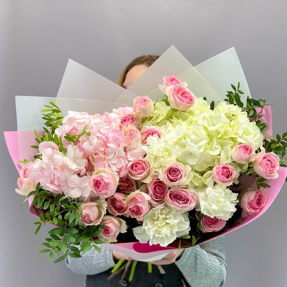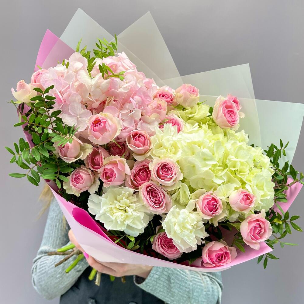 Букет из розовой и белой Гортензий ,кустовых роз и Диантуса